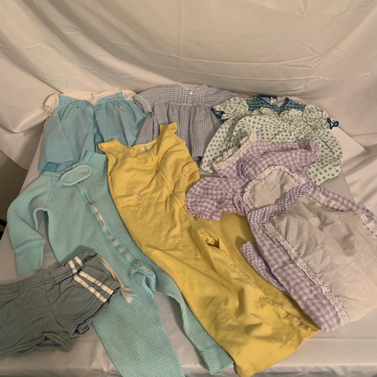 This lot features a variety of kids clothing including PJs, dresses, onesies, sets, and more. The clothing ranges in size with most pieces fitting a size 3-4 kids. The pieces vary from fair to good with some pieces having discoloration (see photos). Shipping available.