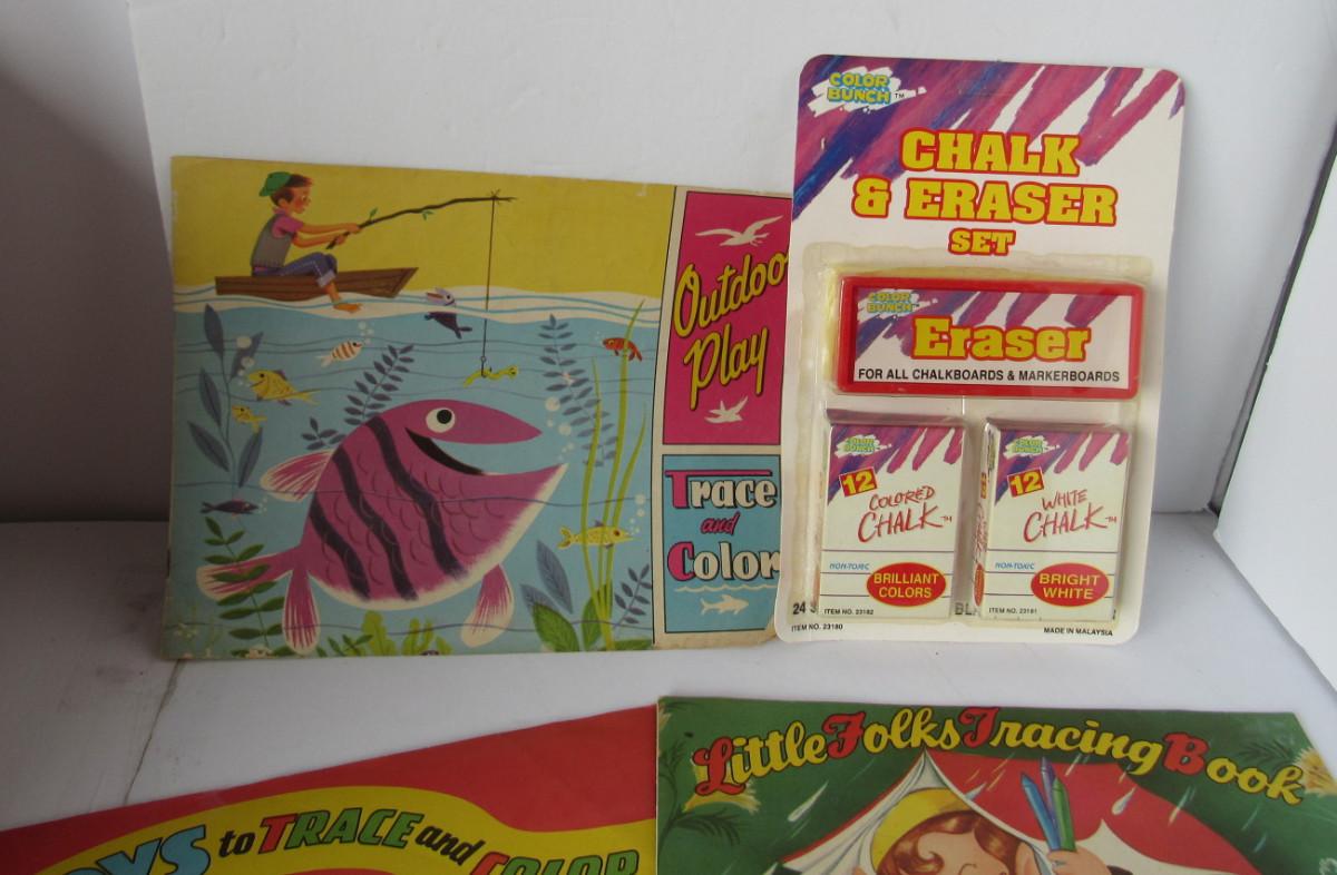 Some used but good, some never used. The Red Riding Hood coloring book is well used and stained but still some good pages to color. Shipping is available at actual shipping cost plus $5.00 handling fee per box for supplies/labor. See our terms for details. All sales are final. Condition notes may not be all inclusive, we may miss some issues as most vintage items are not in mint condition and have some degree of wear, paint loss, etc, but we always try to note obvious damage.