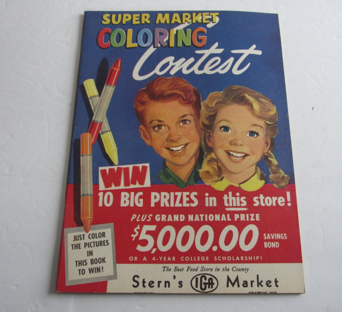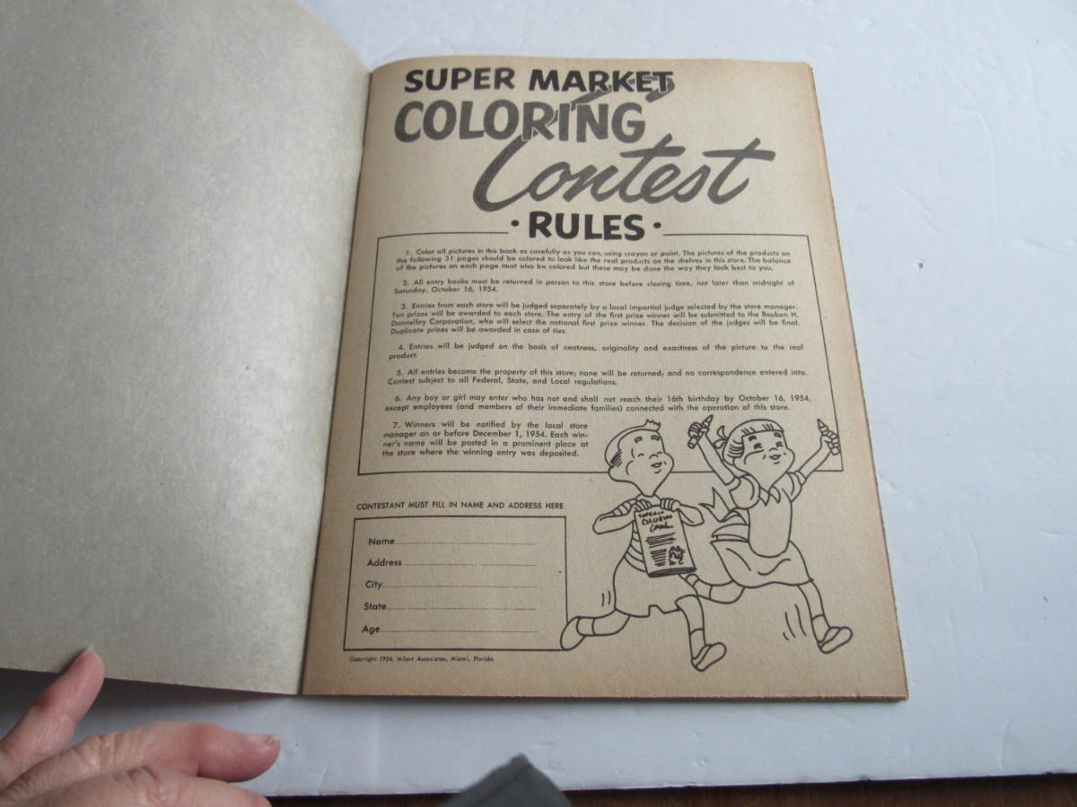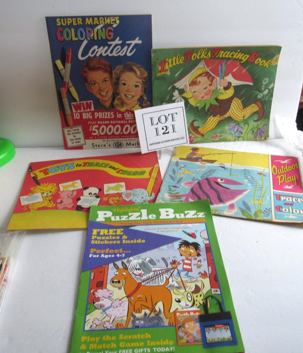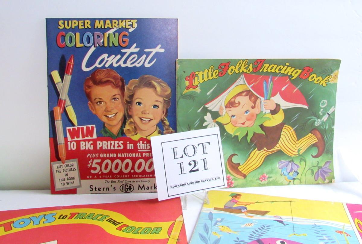 The Coloring contest book is so neat - it is a 1954 Sterns IGA Stores uncolored, near mint example. It has tons of advertising pages inside for Kraft, Hines, much more. Very nice! The tracing books have two or three pages colored in but rest are uncolored. Highlights book is newer. Shipping available at actual cost plus $5.00 per box handling fee. See our terms for details. All sales final.