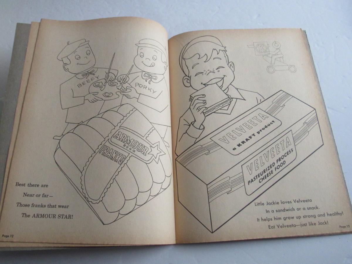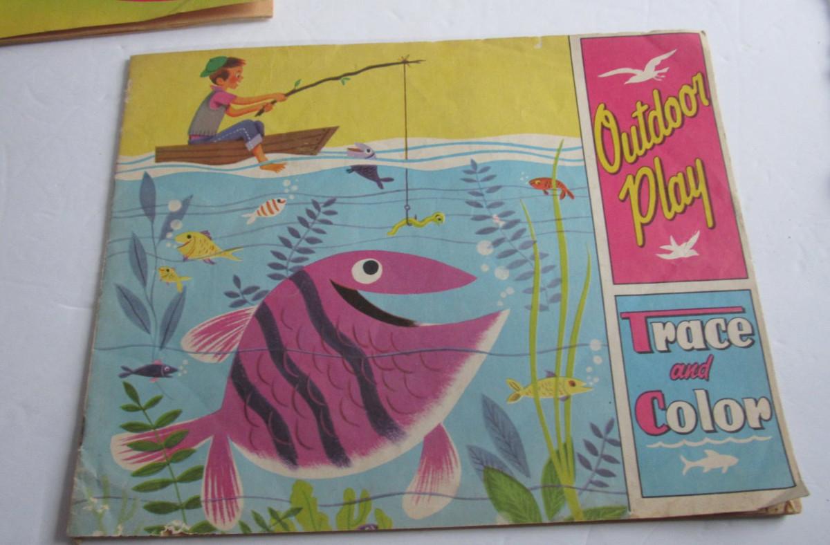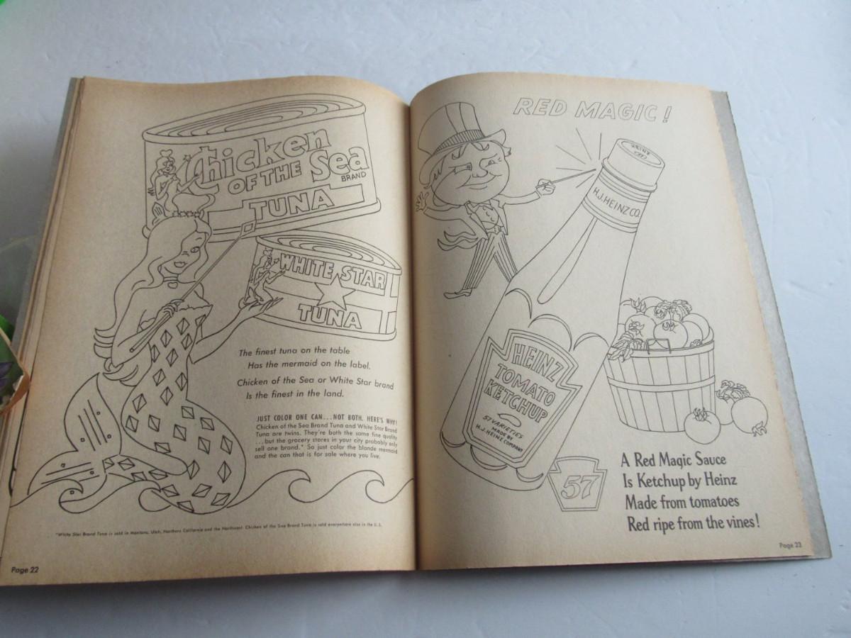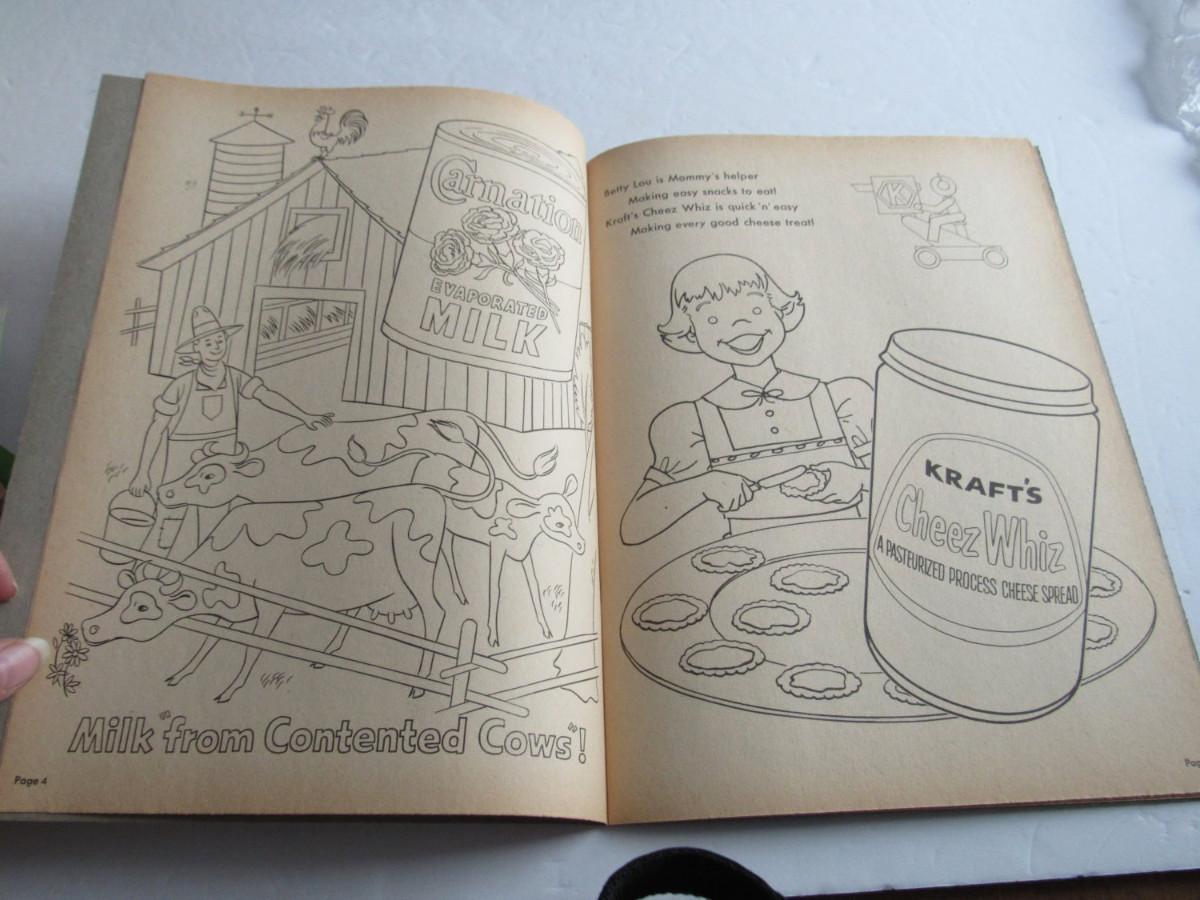 The Coloring contest book is so neat - it is a 1954 Sterns IGA Stores uncolored, near mint example. It has tons of advertising pages inside for Kraft, Hines, much more. Very nice! The tracing books have two or three pages colored in but rest are uncolored. Highlights book is newer. Shipping available at actual cost plus $5.00 per box handling fee. See our terms for details. All sales final.