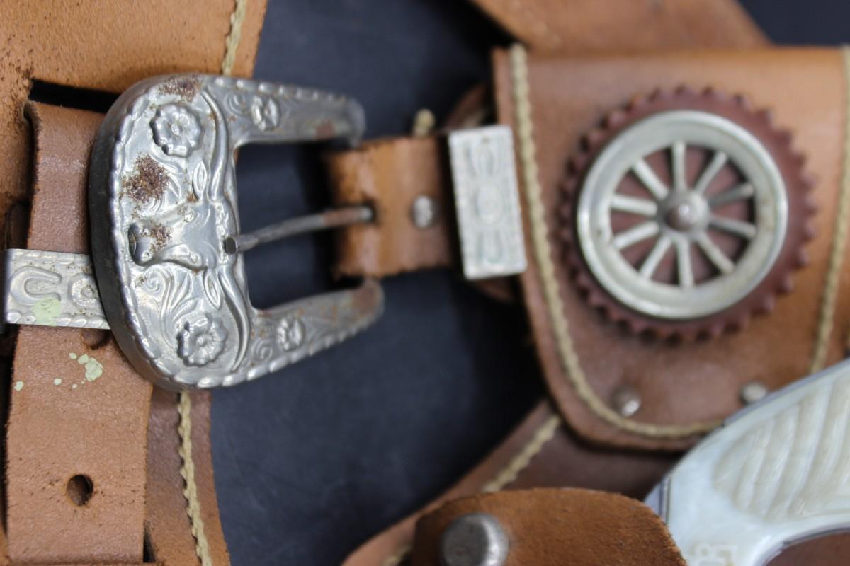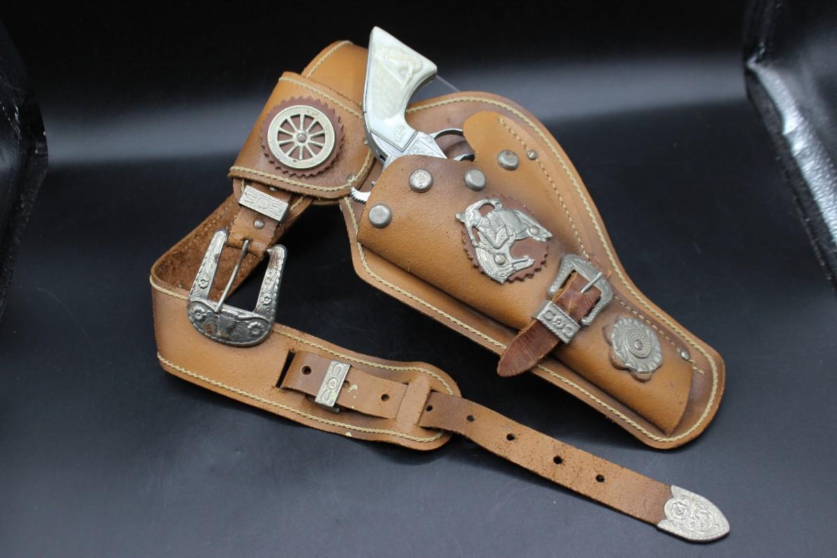Vintage Kilgore Roy Rogers Diecast Cap Pistol Horsehead Grips with Cowboy Holster, there is no significant damage to the pistol or holster and is in good collectible condition. Check pictures for more details and for sizing.