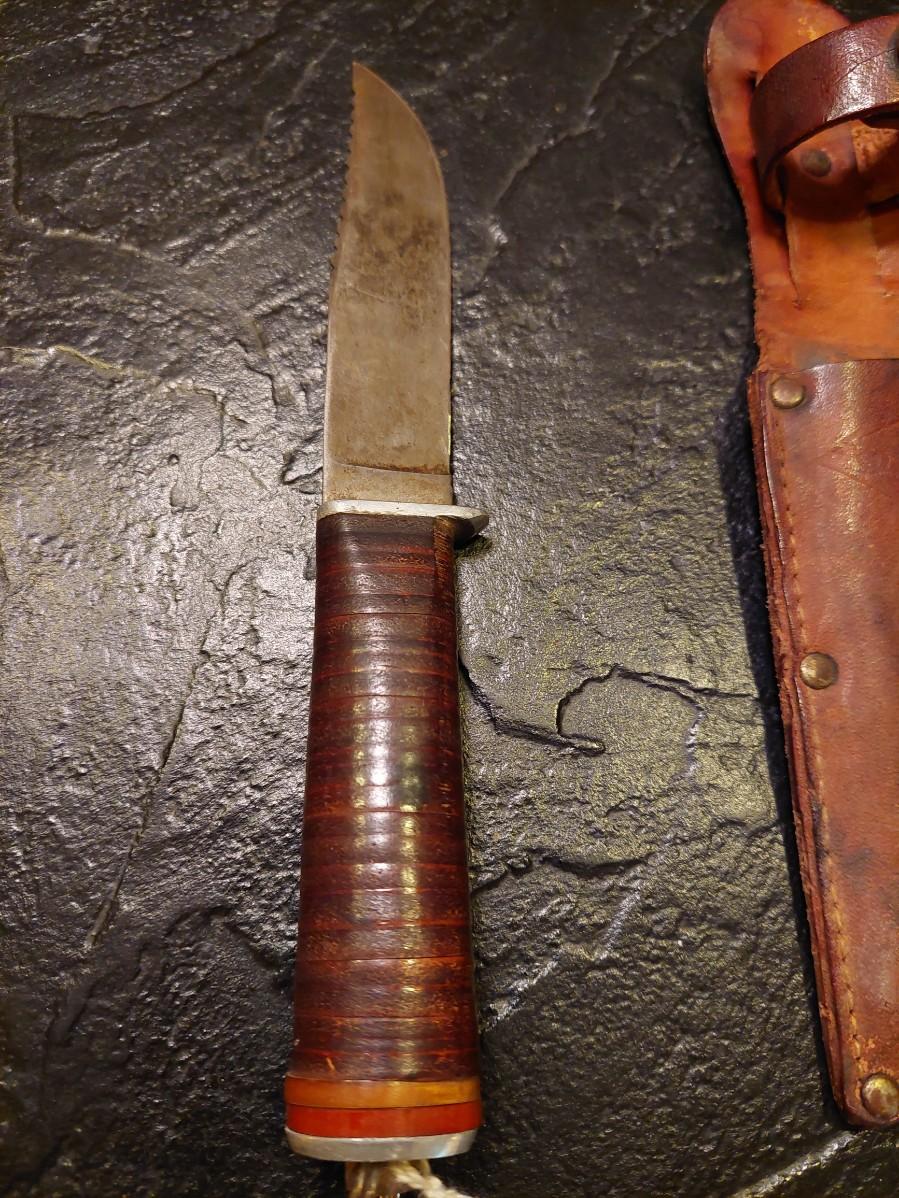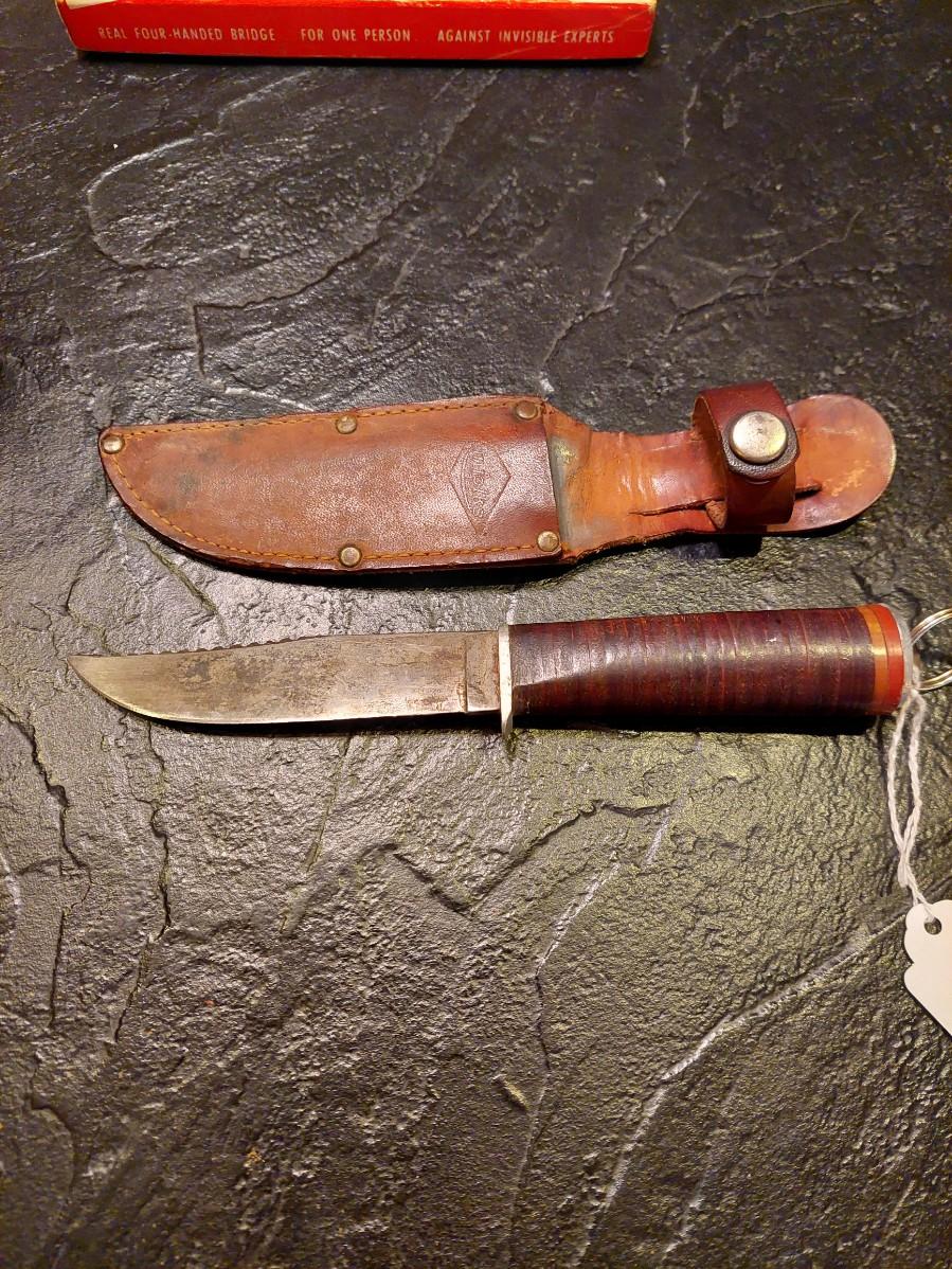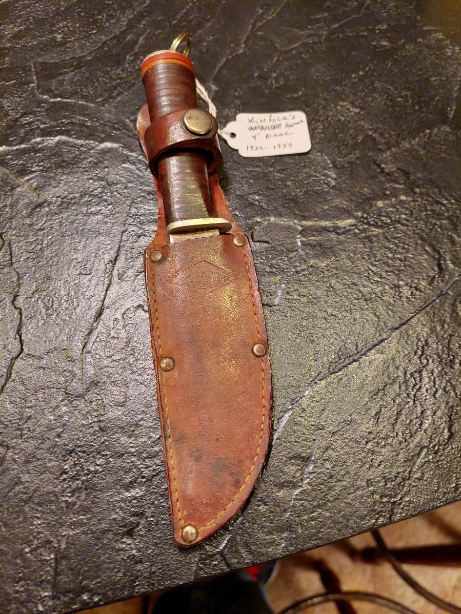 A nice vintage Kinfolks Hunter knife with original sheath. The clip at top is not holding the silver ring down tight. Was told made from 1925 to 57.Maybe used during his military service?