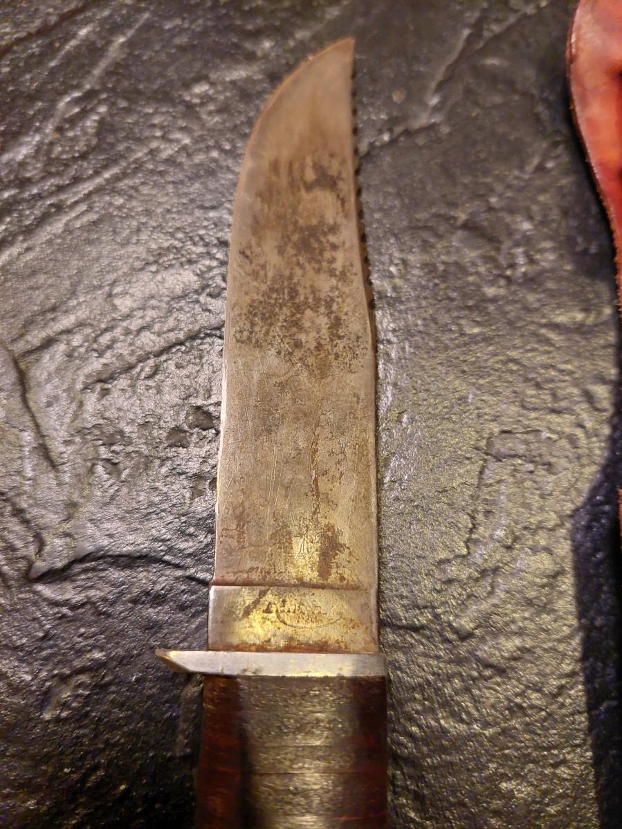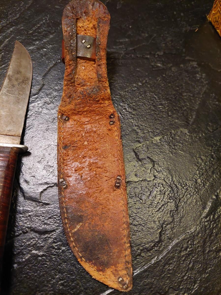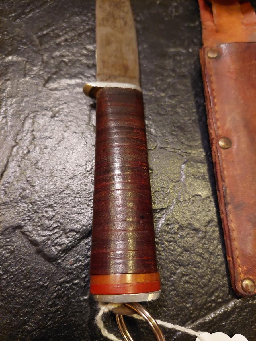 A nice vintage Kinfolks Hunter knife with original sheath. The clip at top is not holding the silver ring down tight. Was told made from 1925 to 57.Maybe used during his military service?