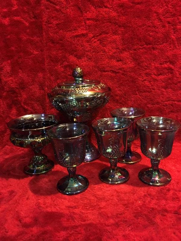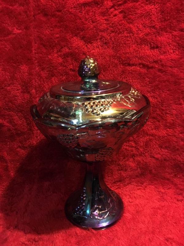 Blue with purple and green Iridescence carnival glass pedestal dish .