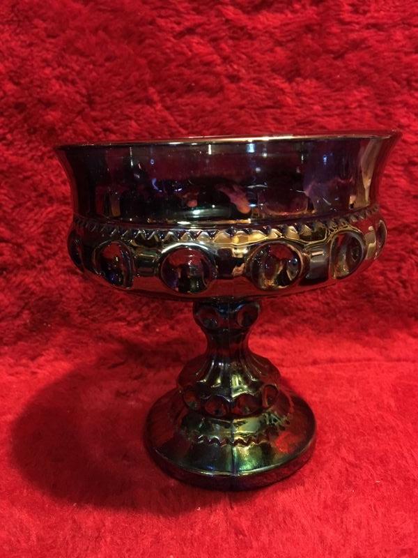 Vintage King’s Crown iridescent blue carnival glass pedestal dish