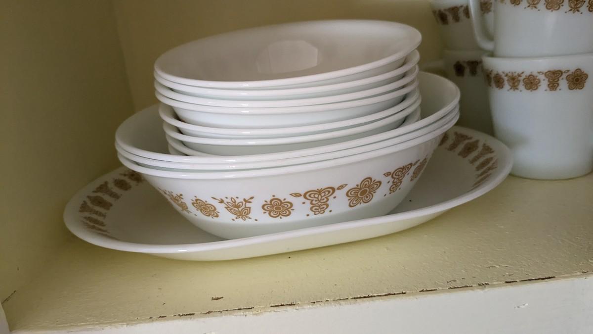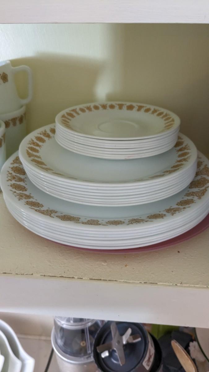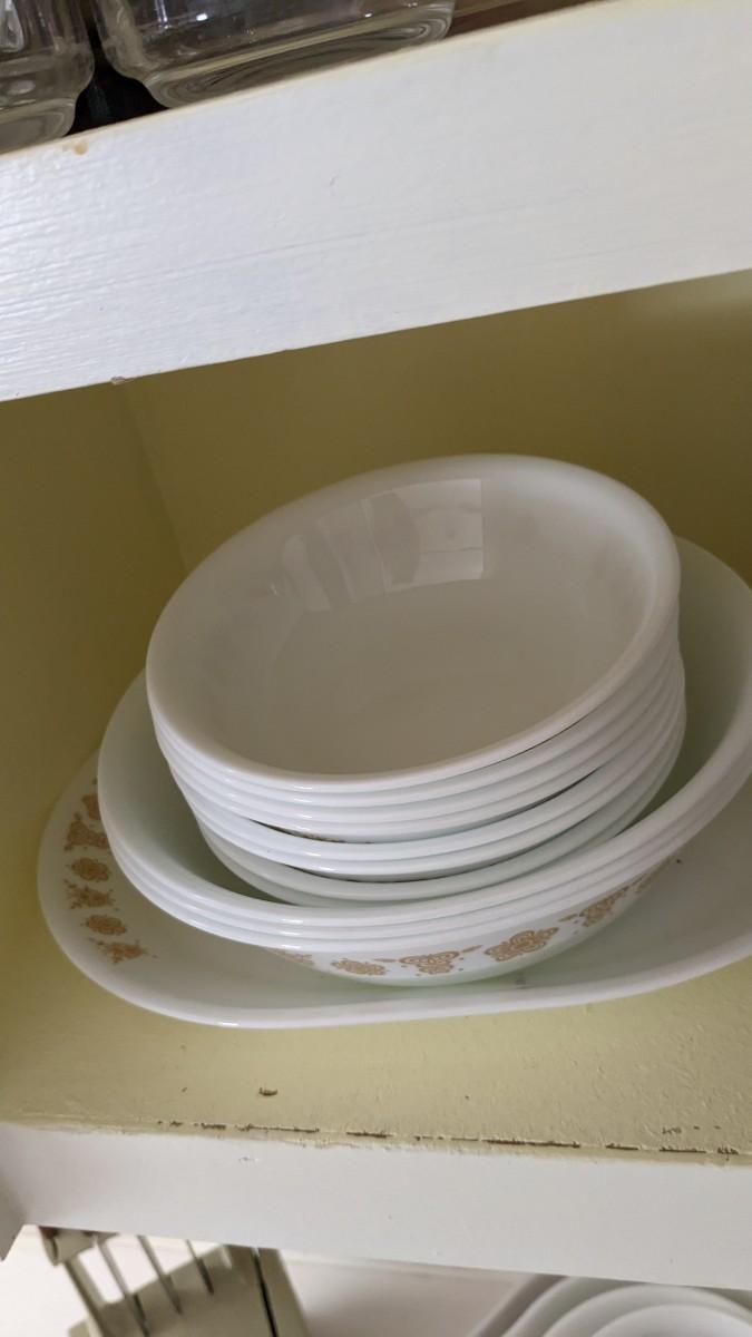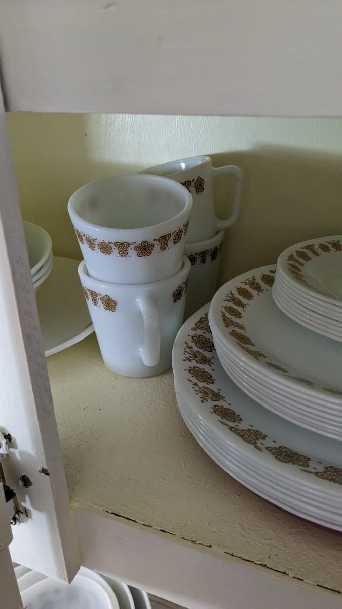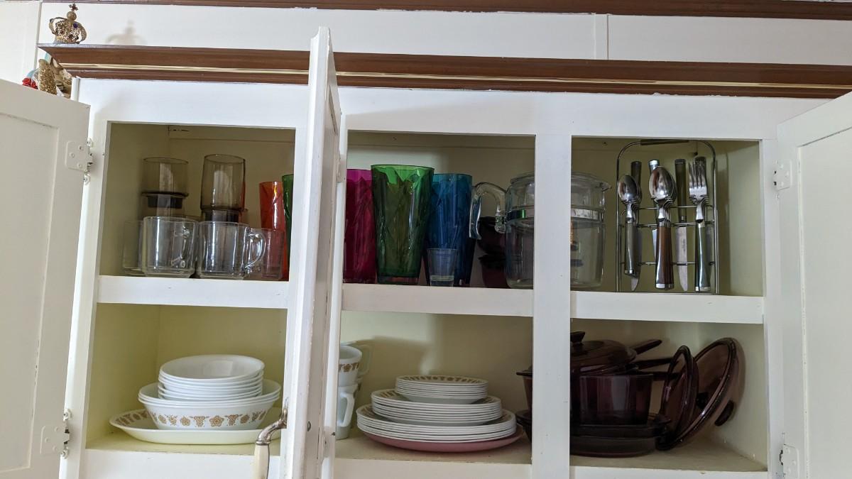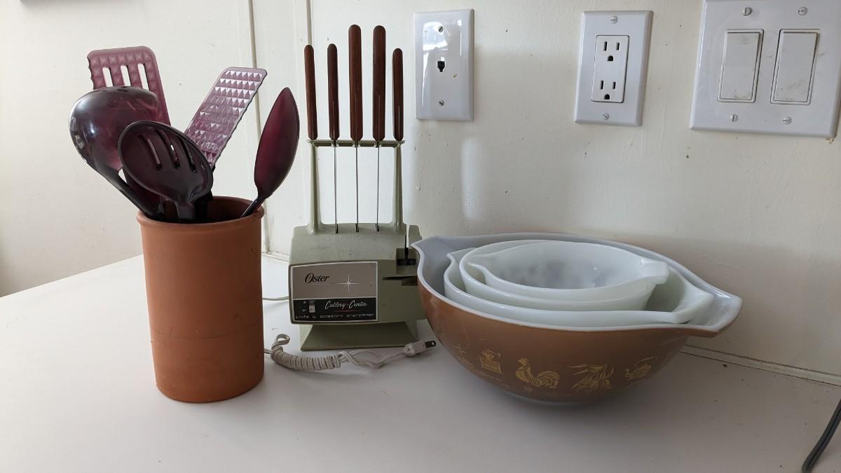 this is the cream of the crop if you're looking for a fast vintage kitchen fill. Includes full set of Corelle Butterfly Gold pattern dishes, Cranberry Pyrex cooking dishes with mated utensils, Pyrex stovetop percolator, 3 of the Pyrex Americana Cinderella mixing bowl set, 1 butterfly gold pyrex bowl, an AMAZING little lucite handle utensil holder with original green & brown utensils, and a wild Oster cutlery center with knife and built in sharpener (not working). Includes plastic tumblers, some glass mugs, and smoky glass stackable tumblers. No shipping. Winning bidder responsible for removal of all items. southkitchencab-upper