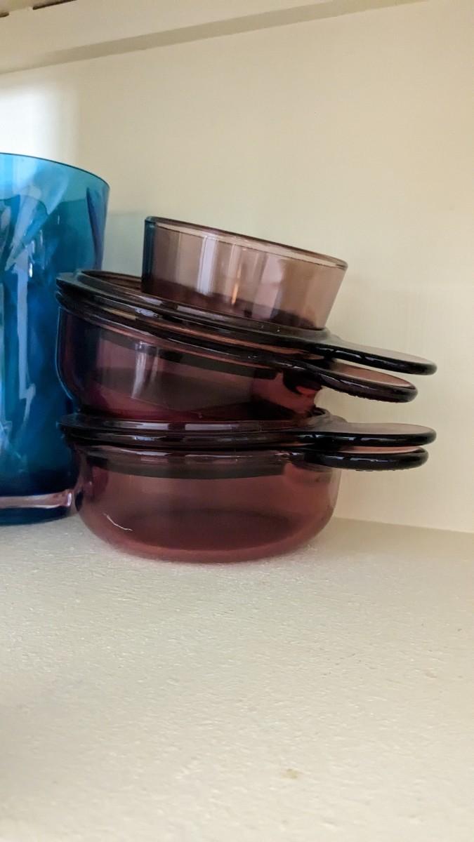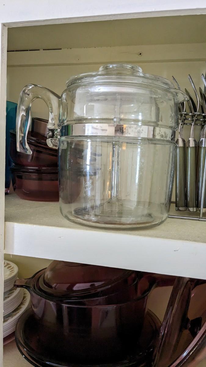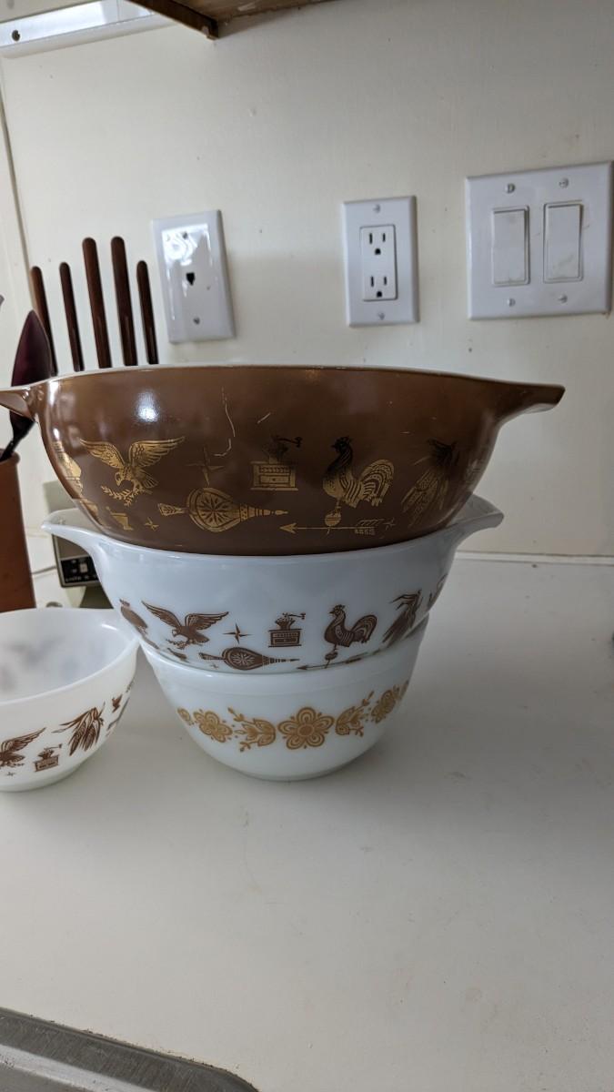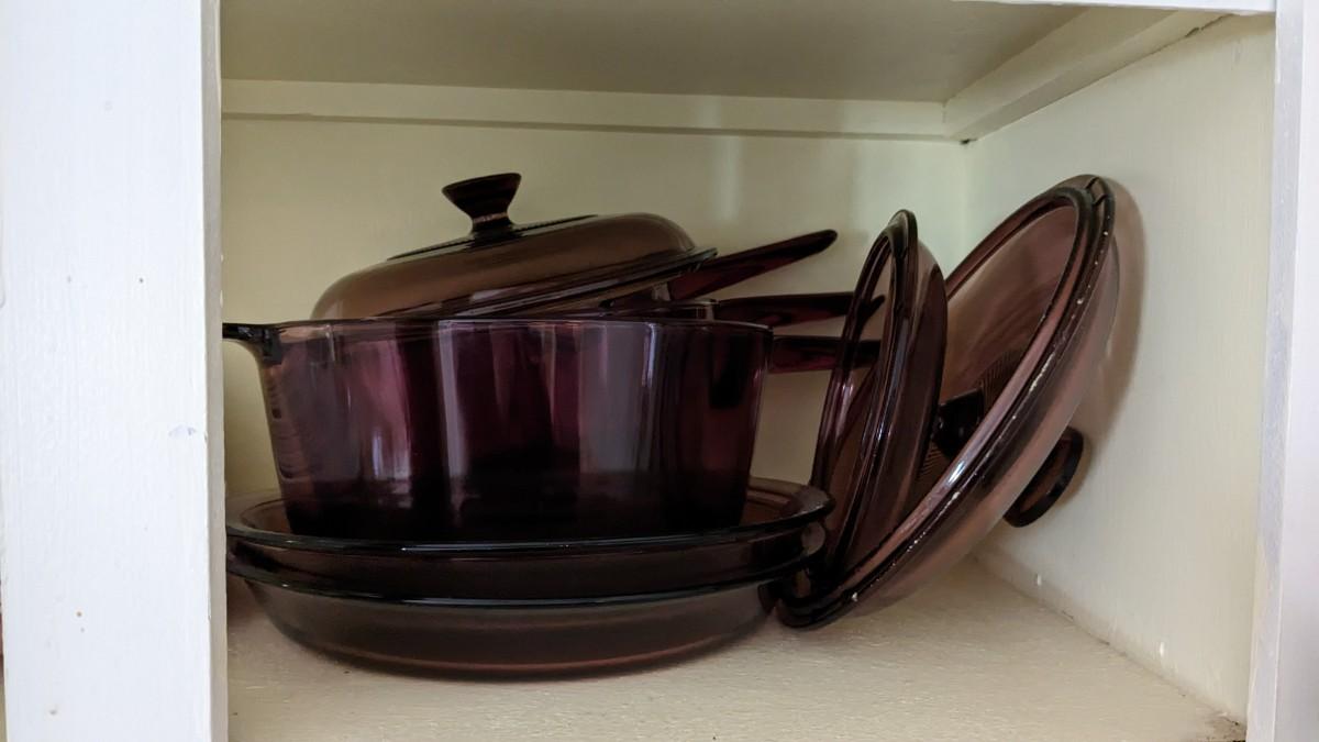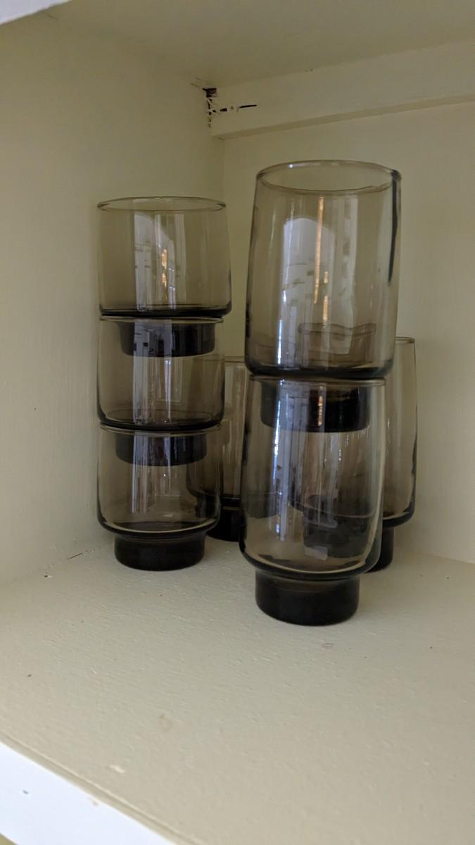 this is the cream of the crop if you're looking for a fast vintage kitchen fill. Includes full set of Corelle Butterfly Gold pattern dishes, Cranberry Pyrex cooking dishes with mated utensils, Pyrex stovetop percolator, 3 of the Pyrex Americana Cinderella mixing bowl set, 1 butterfly gold pyrex bowl, an AMAZING little lucite handle utensil holder with original green & brown utensils, and a wild Oster cutlery center with knife and built in sharpener (not working). Includes plastic tumblers, some glass mugs, and smoky glass stackable tumblers. No shipping. Winning bidder responsible for removal of all items. southkitchencab-upper