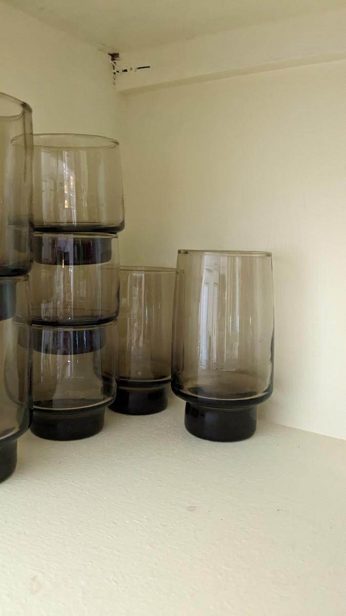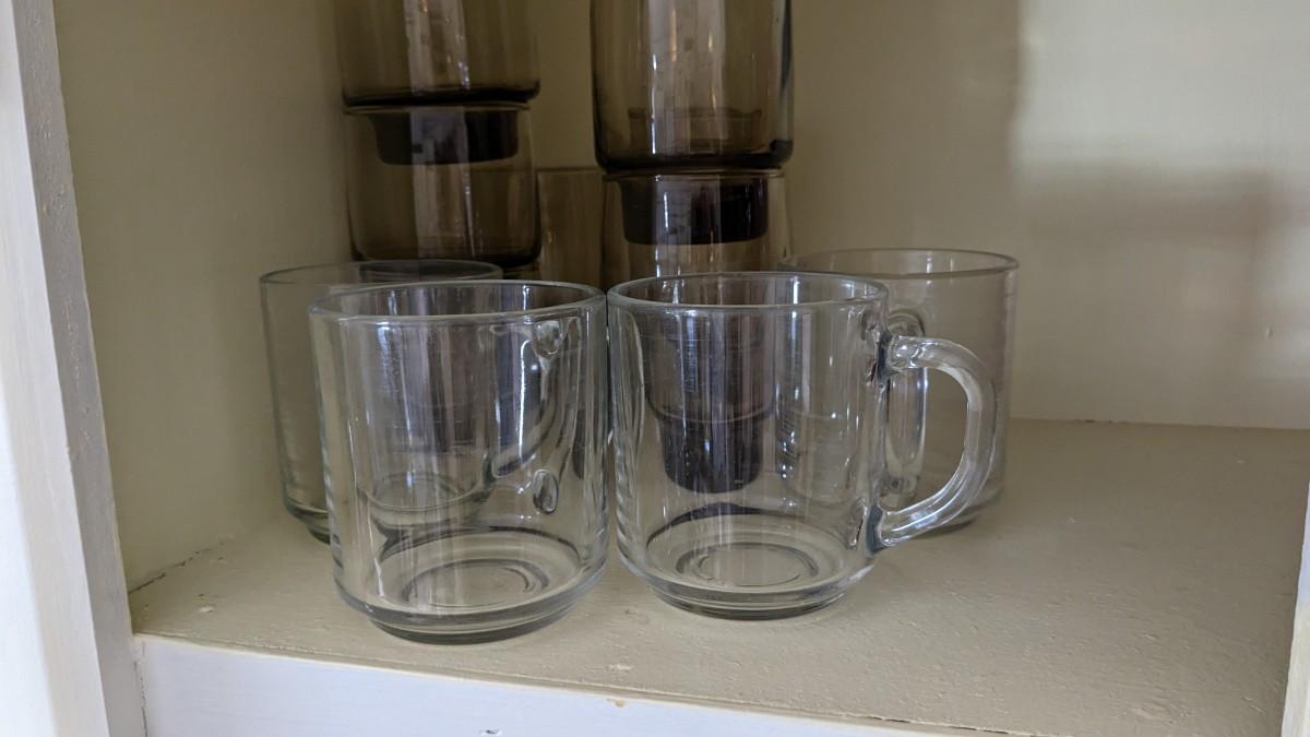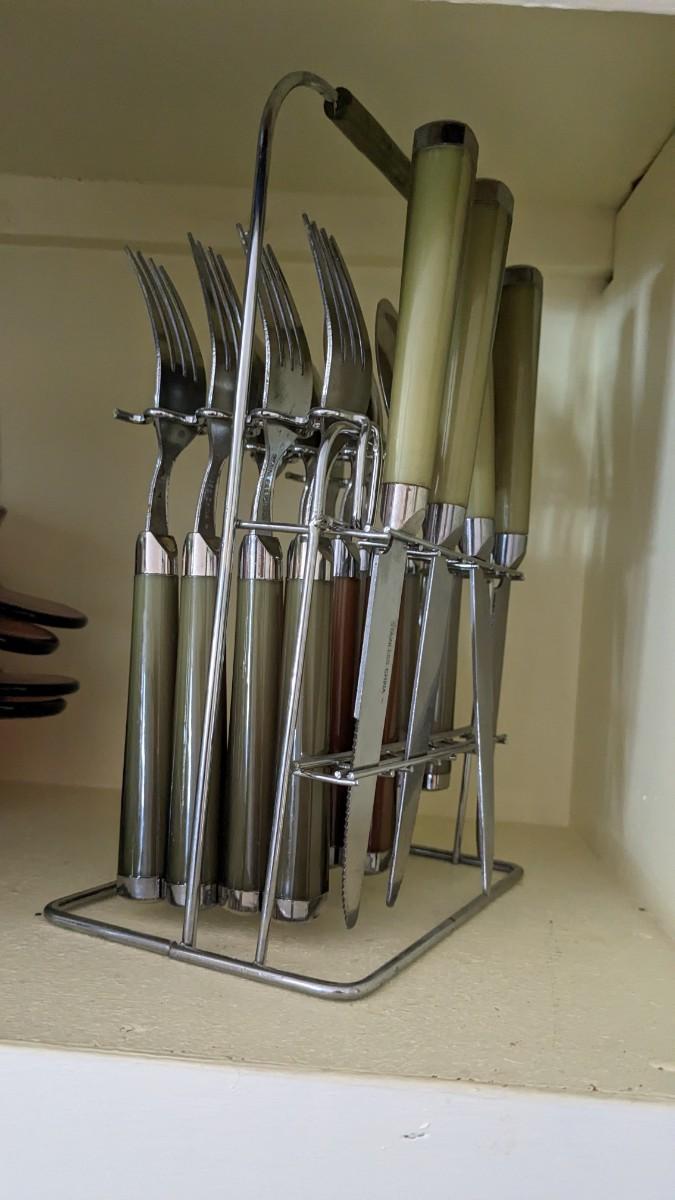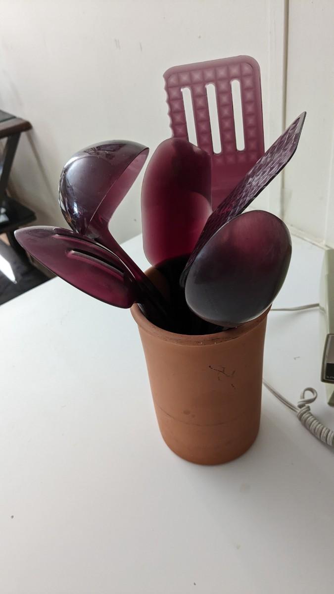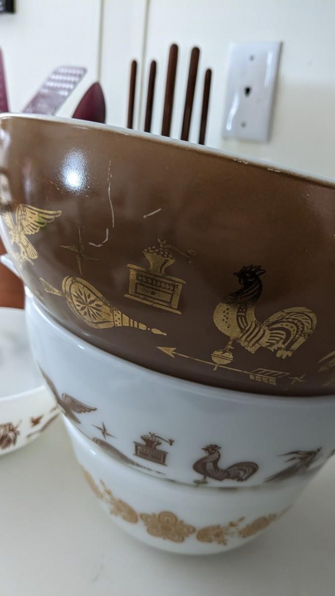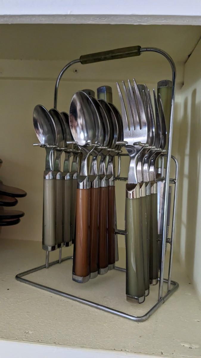 this is the cream of the crop if you're looking for a fast vintage kitchen fill. Includes full set of Corelle Butterfly Gold pattern dishes, Cranberry Pyrex cooking dishes with mated utensils, Pyrex stovetop percolator, 3 of the Pyrex Americana Cinderella mixing bowl set, 1 butterfly gold pyrex bowl, an AMAZING little lucite handle utensil holder with original green & brown utensils, and a wild Oster cutlery center with knife and built in sharpener (not working). Includes plastic tumblers, some glass mugs, and smoky glass stackable tumblers. No shipping. Winning bidder responsible for removal of all items. southkitchencab-upper