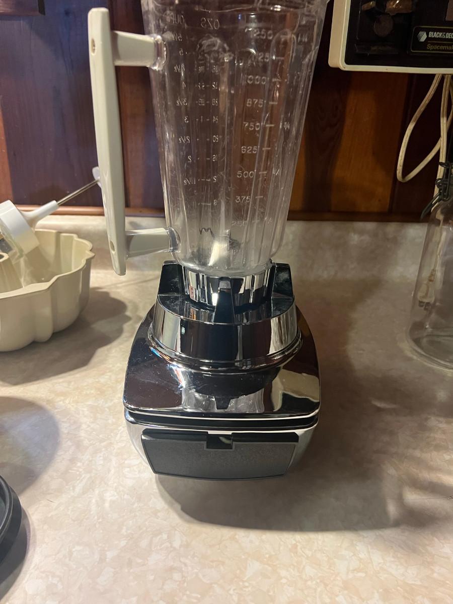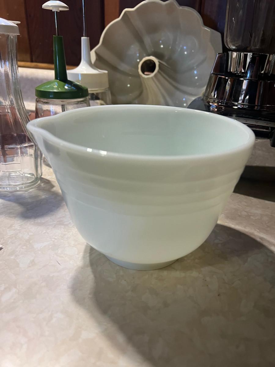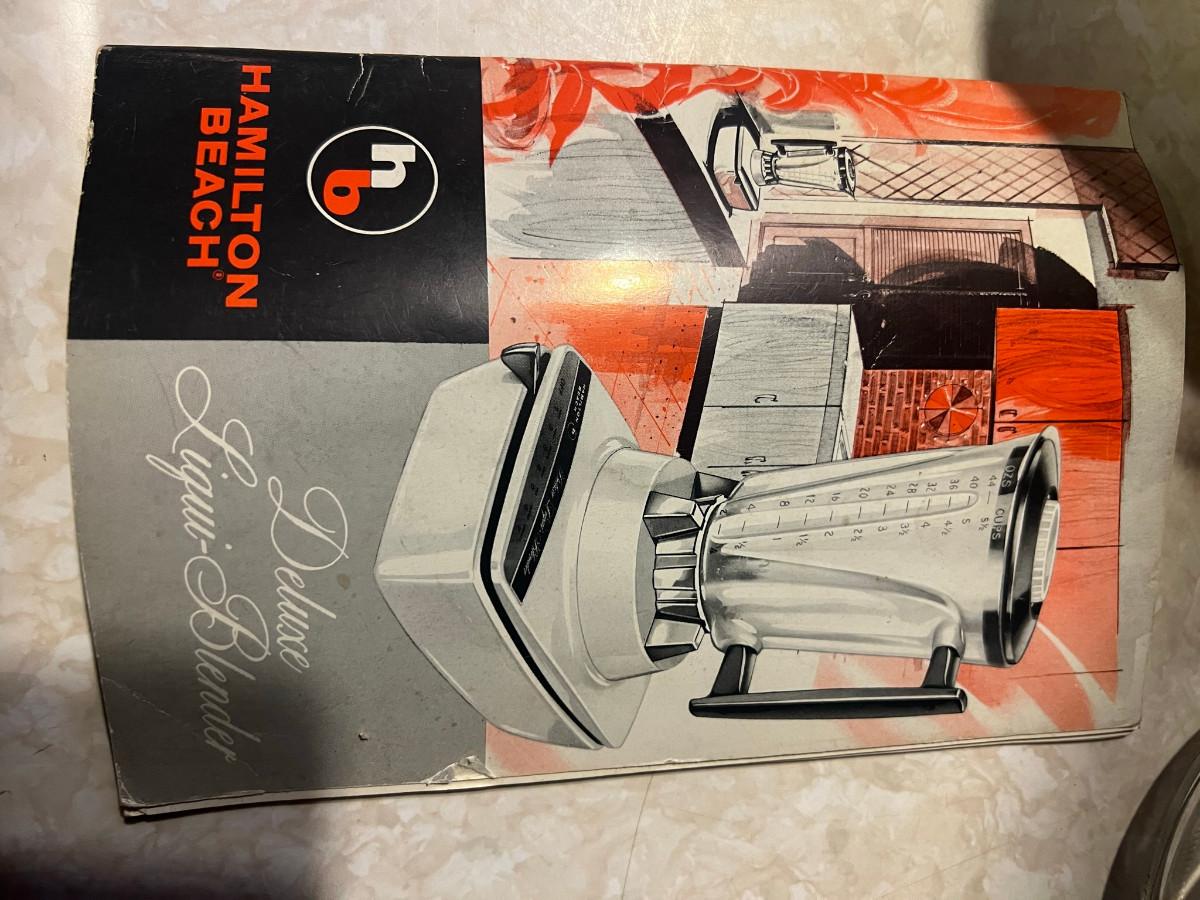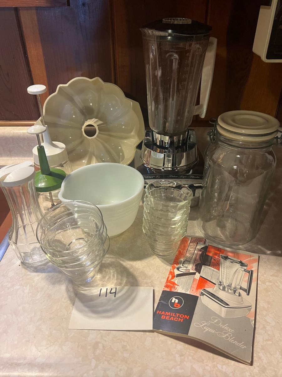 Hamilton Beach Blender model0 Deluxe Liqui-blender 7 speed, bundt pan, nut chopper, dressing bottle Good Seasons, 4 glass bowls 3" x 4", 6 glass bowls 5 oz Fire King 3.5" x 2 1/4", white mix bowl 4.5" x 7.5" and 1 vintage jar with lid 9 3/4" x 4.5"