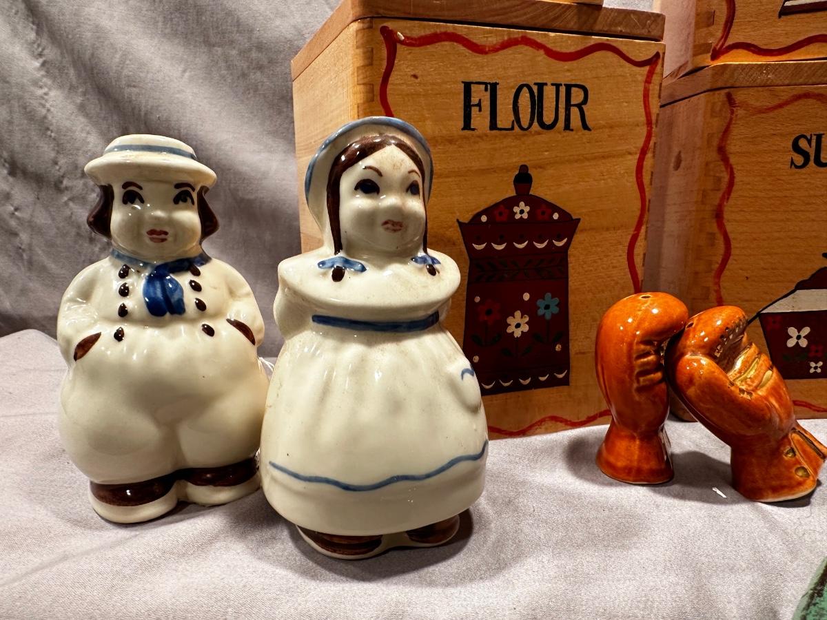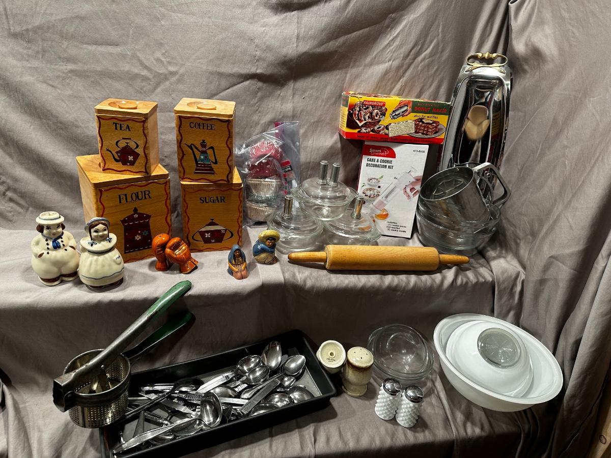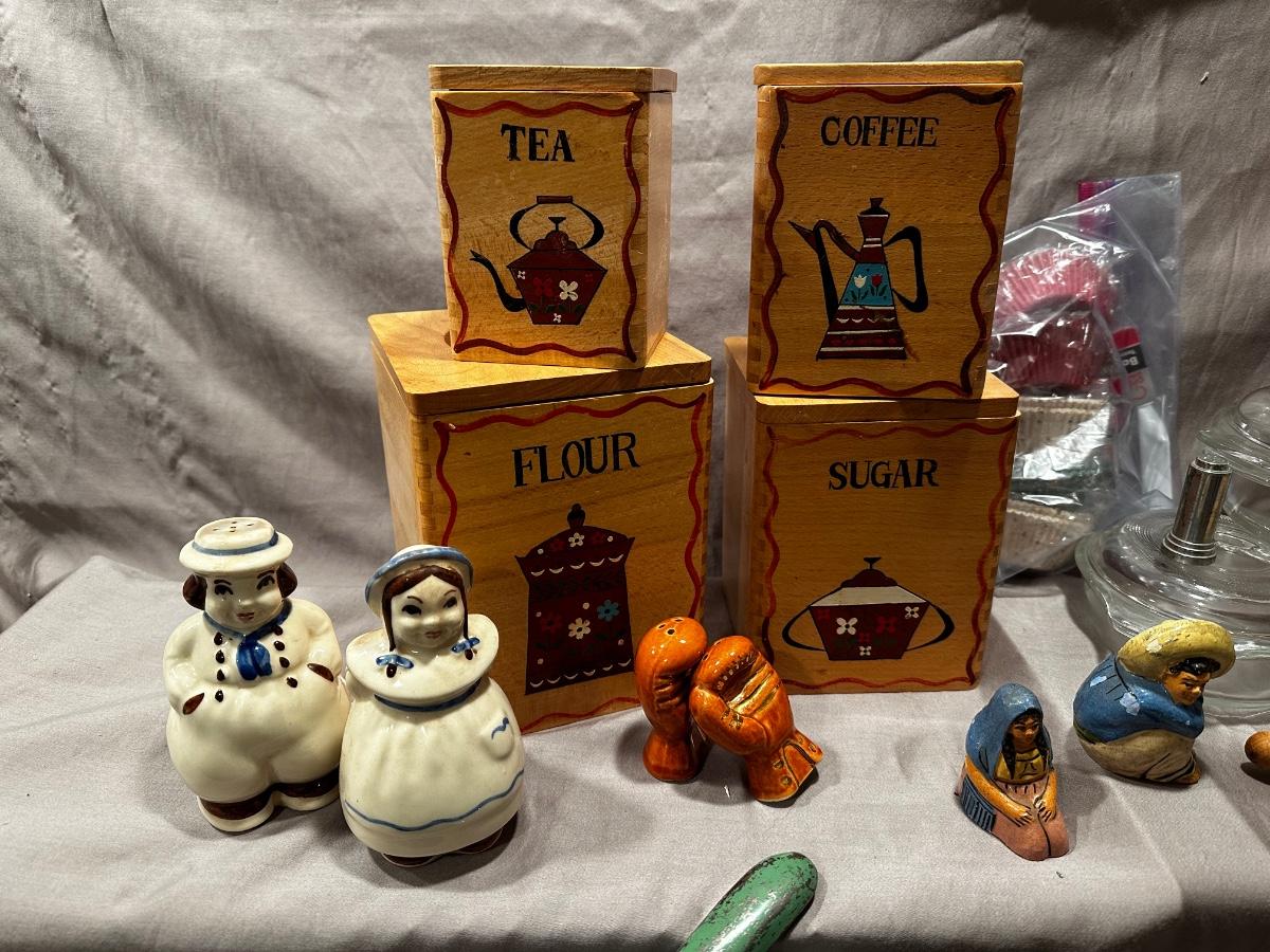 Salt and pepper shakers, rolling pin, Pyrex, and some wonderful wooden canisters that are in excellent condition!