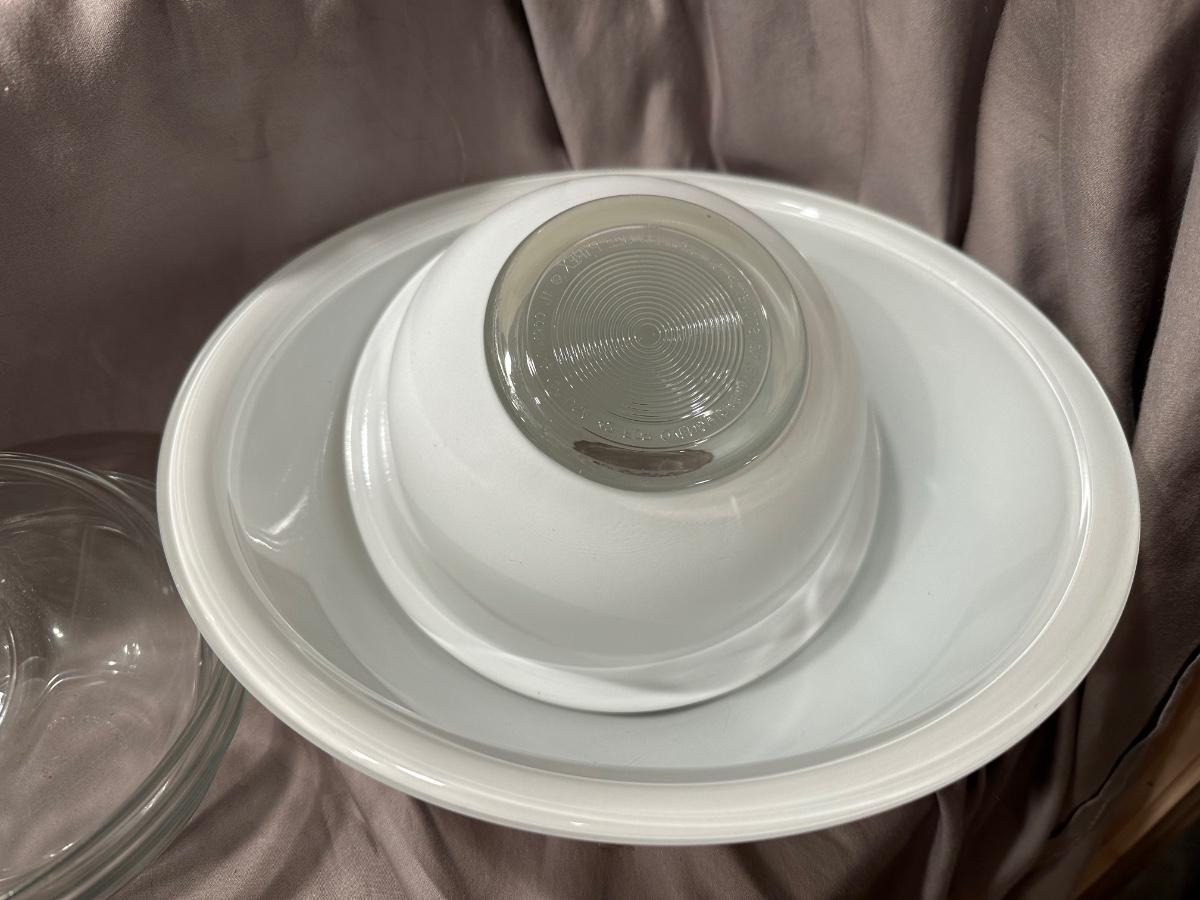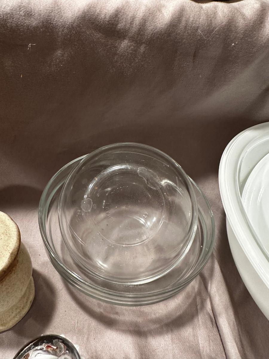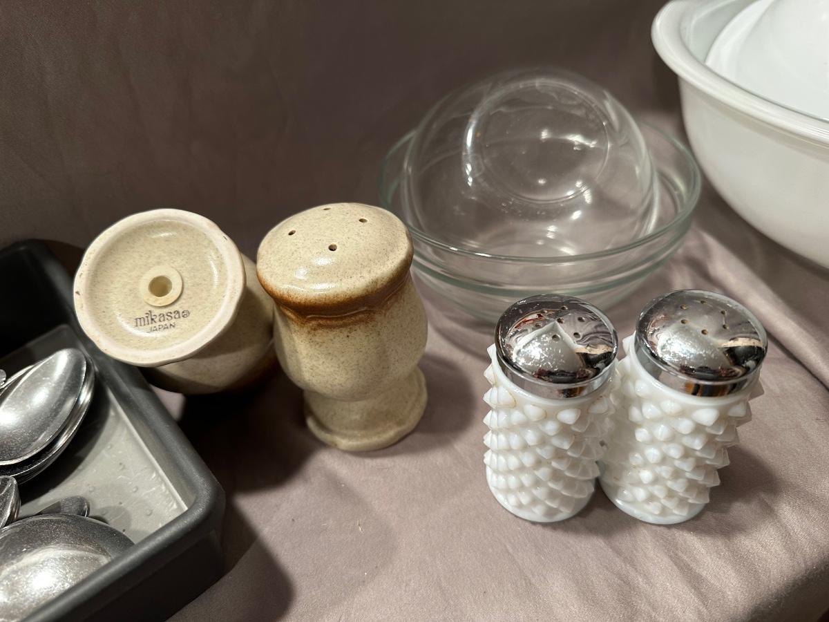 Salt and pepper shakers, rolling pin, Pyrex, and some wonderful wooden canisters that are in excellent condition!