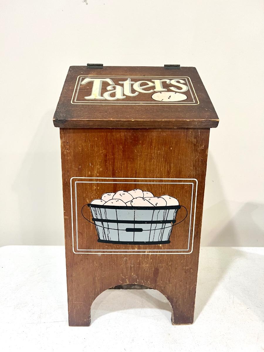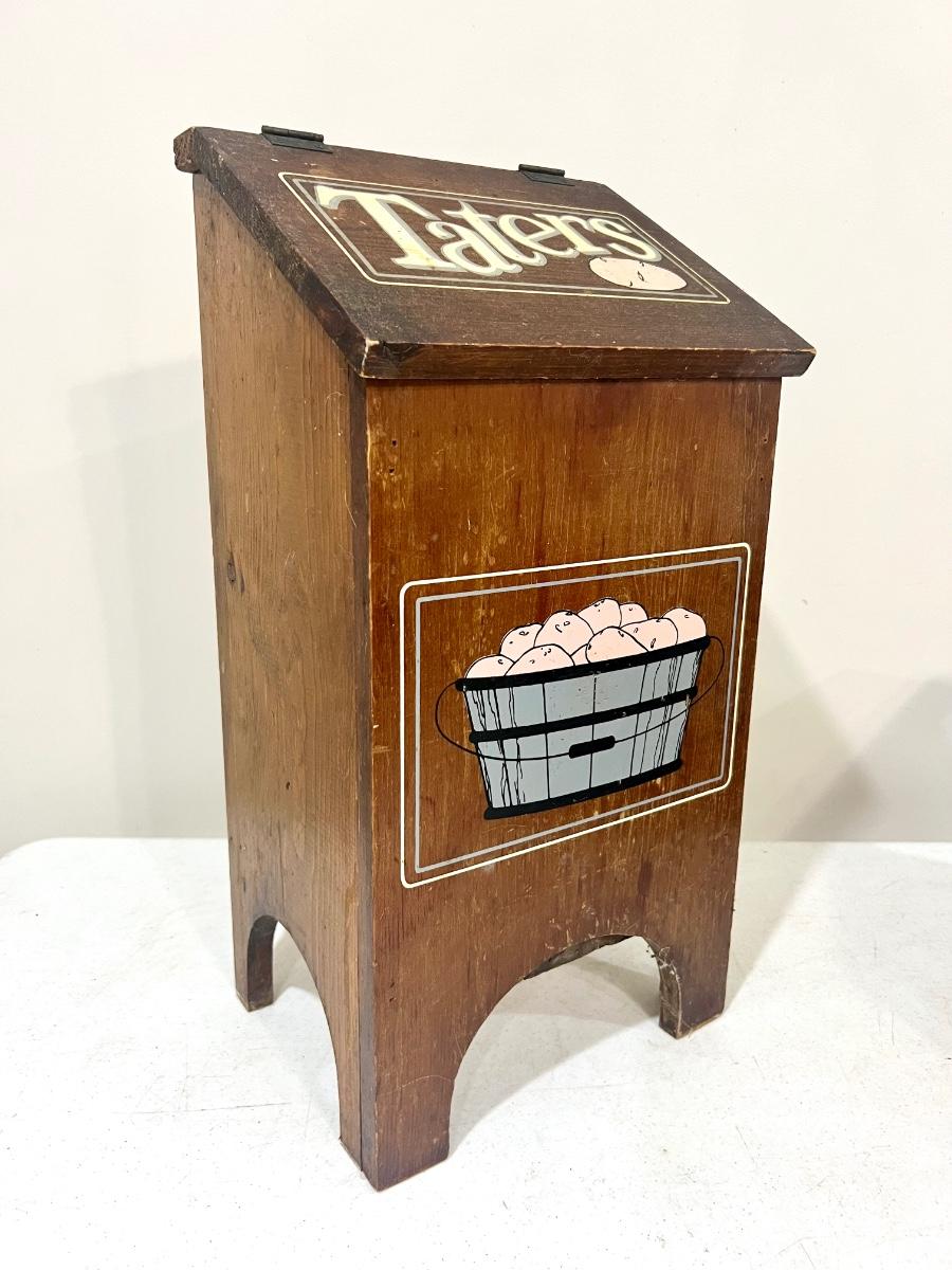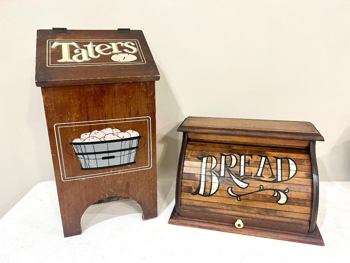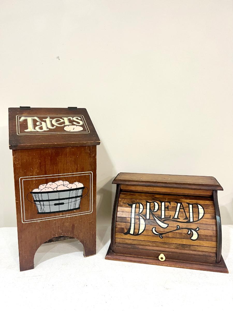 Vintage wood bread box works as it should measures 11 inches tall, 18 inches wide and 11 inches deep. Tater bin measures 23 inches tall, 12 inches wide and 9 inches deep. These do have knicks, scratches and signs of use, but are fully functional.
