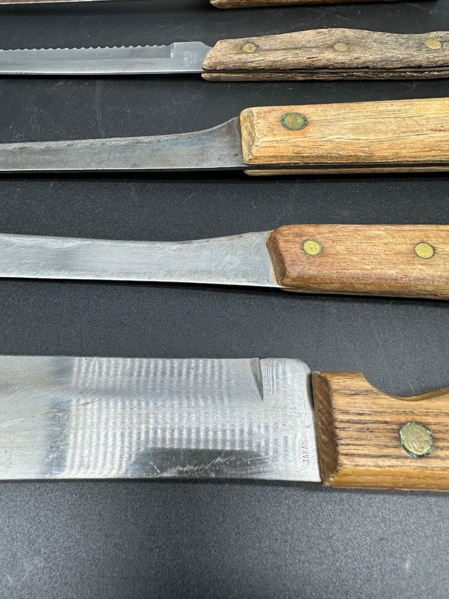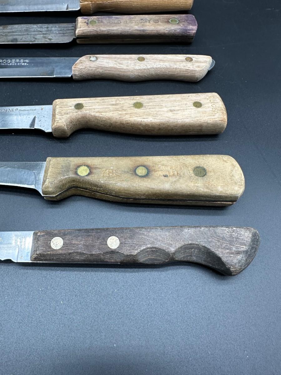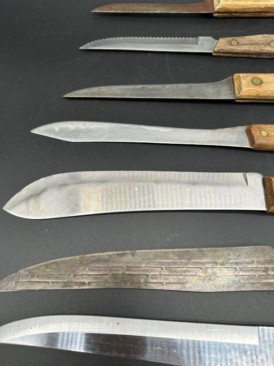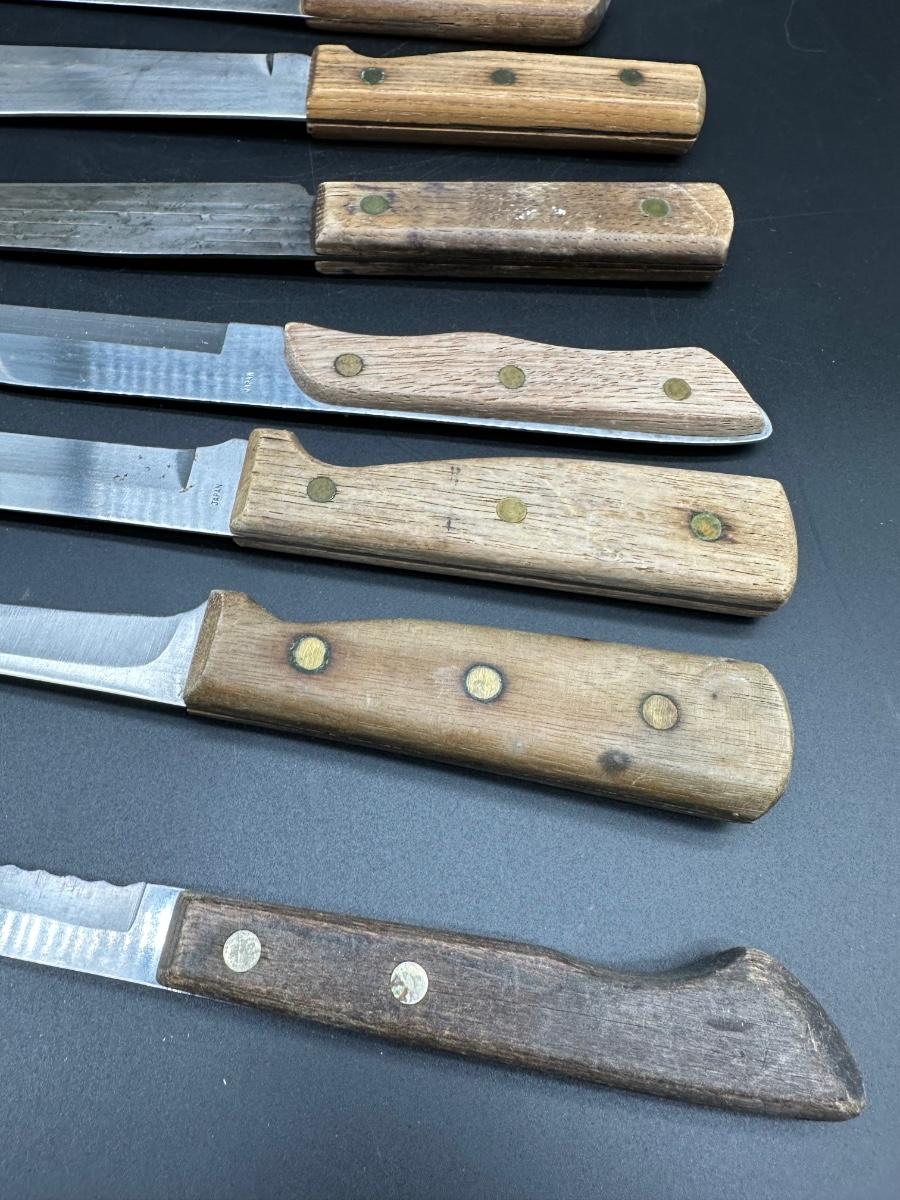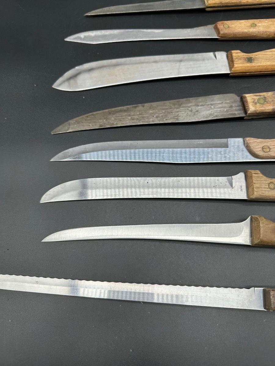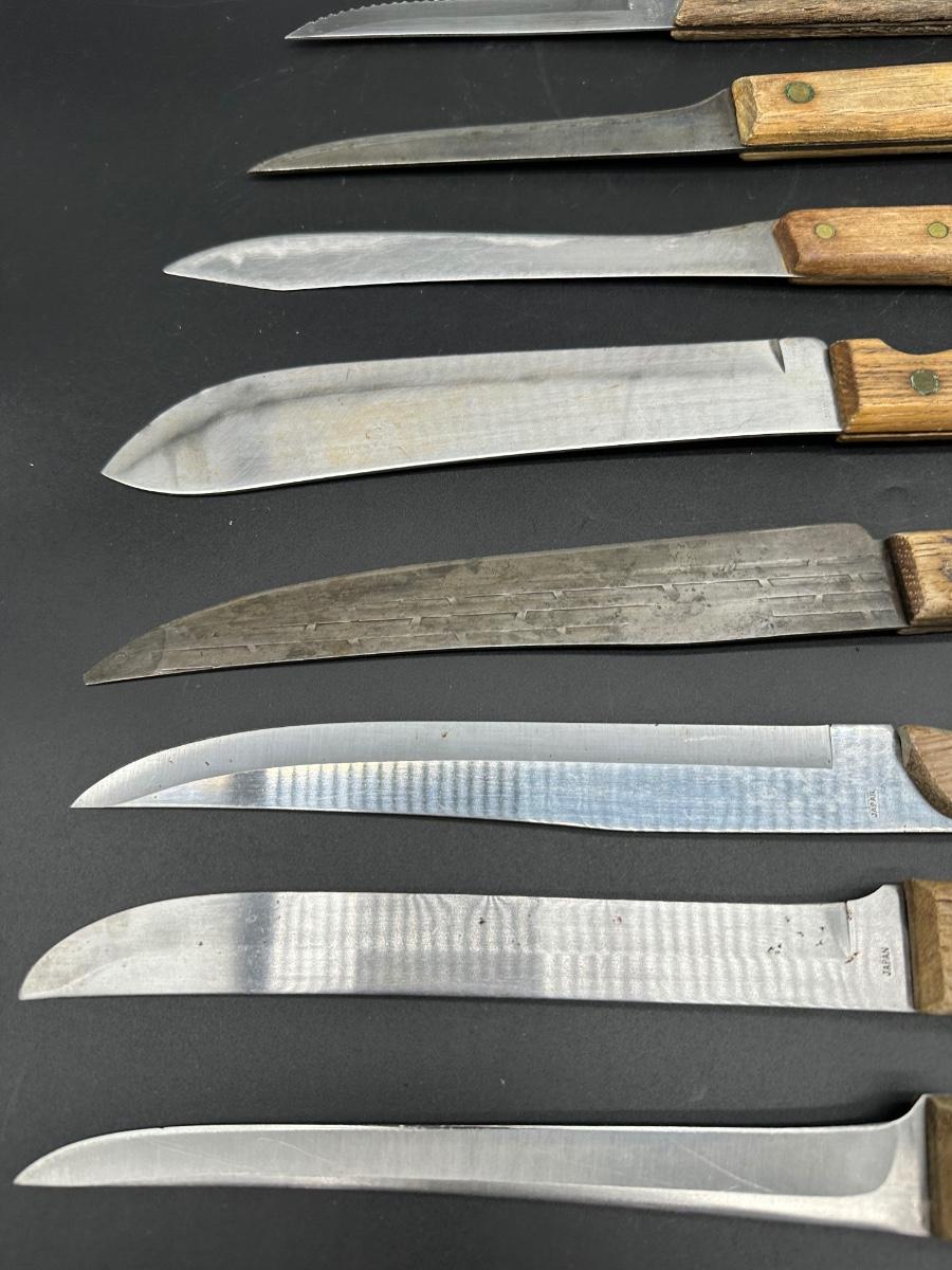 Mixed lot of 10 vintage kitchen and butcher knives featuring wood handles and riveted construction. Includes a variety of carving, slicer, utility, and bread knives.