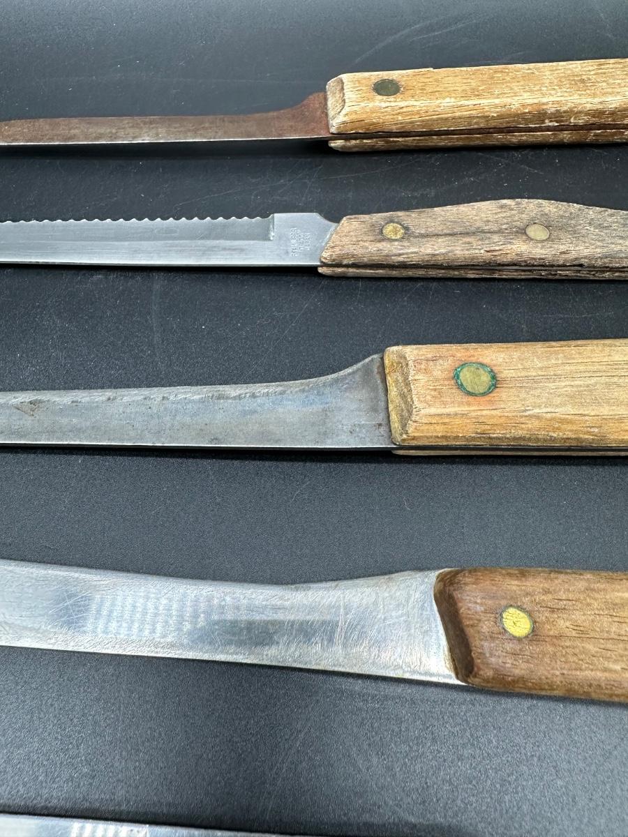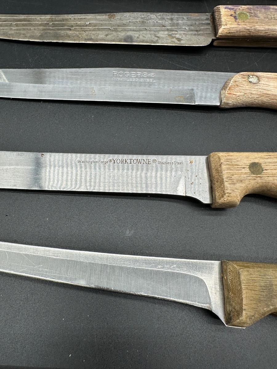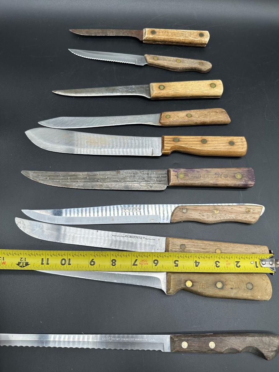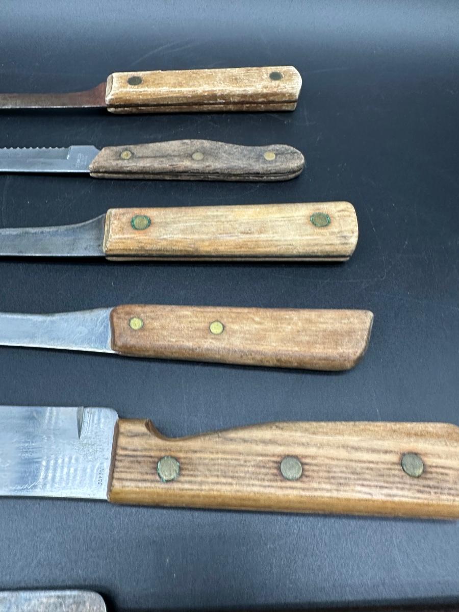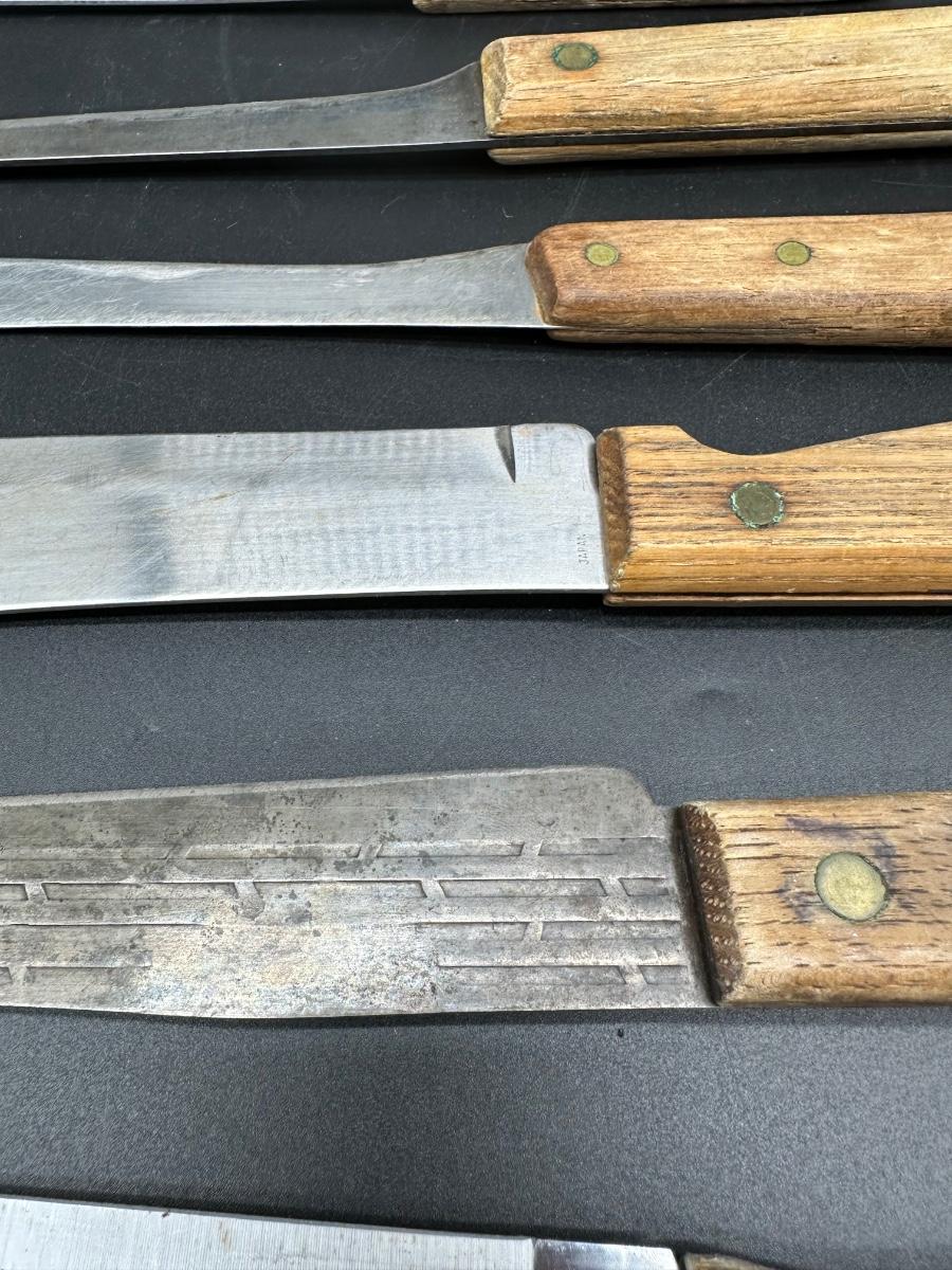 Mixed lot of 10 vintage kitchen and butcher knives featuring wood handles and riveted construction. Includes a variety of carving, slicer, utility, and bread knives.