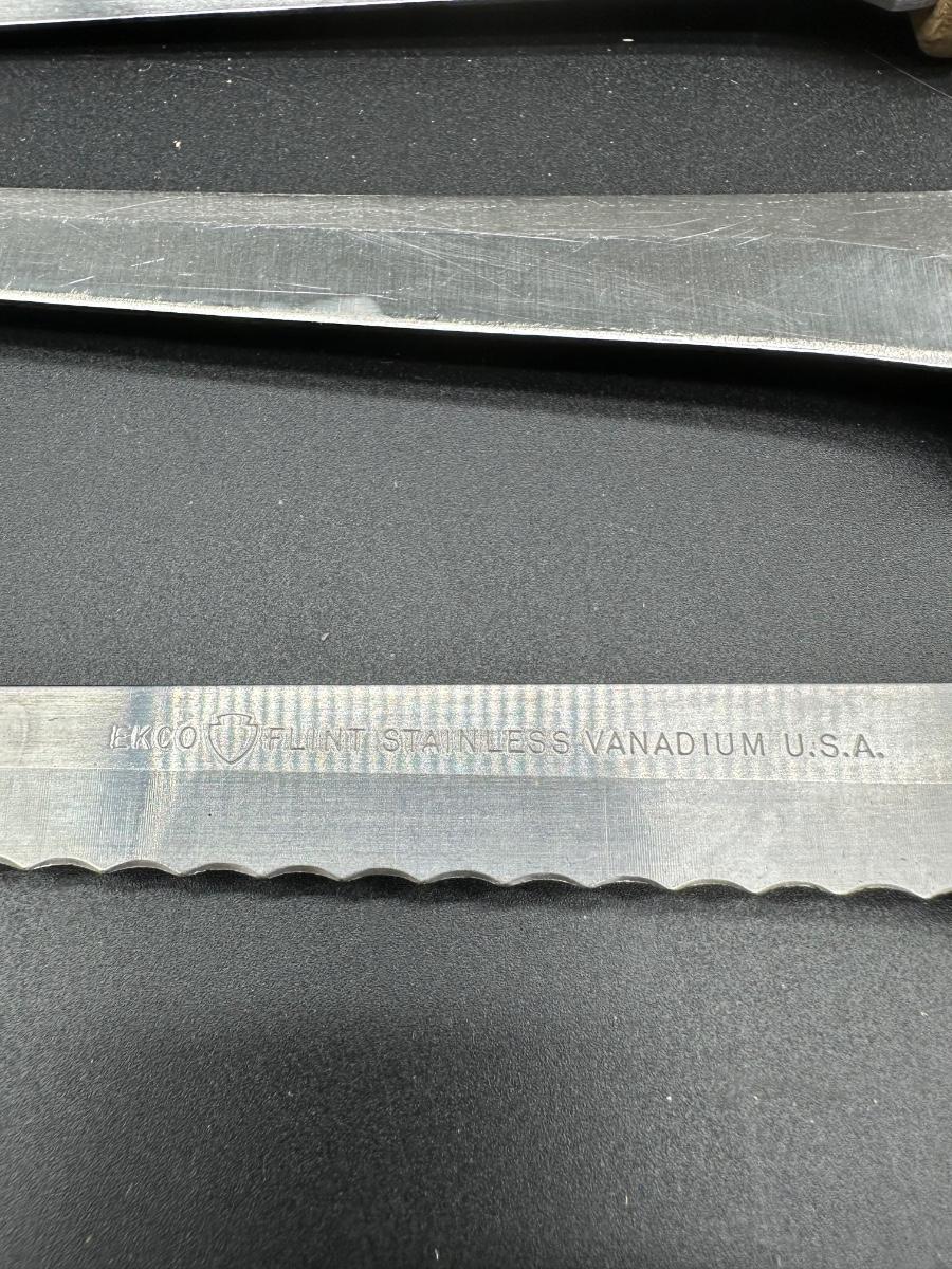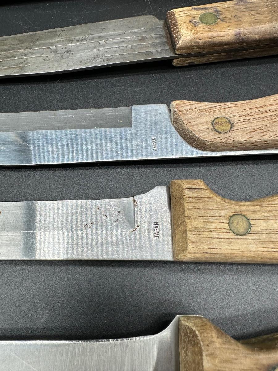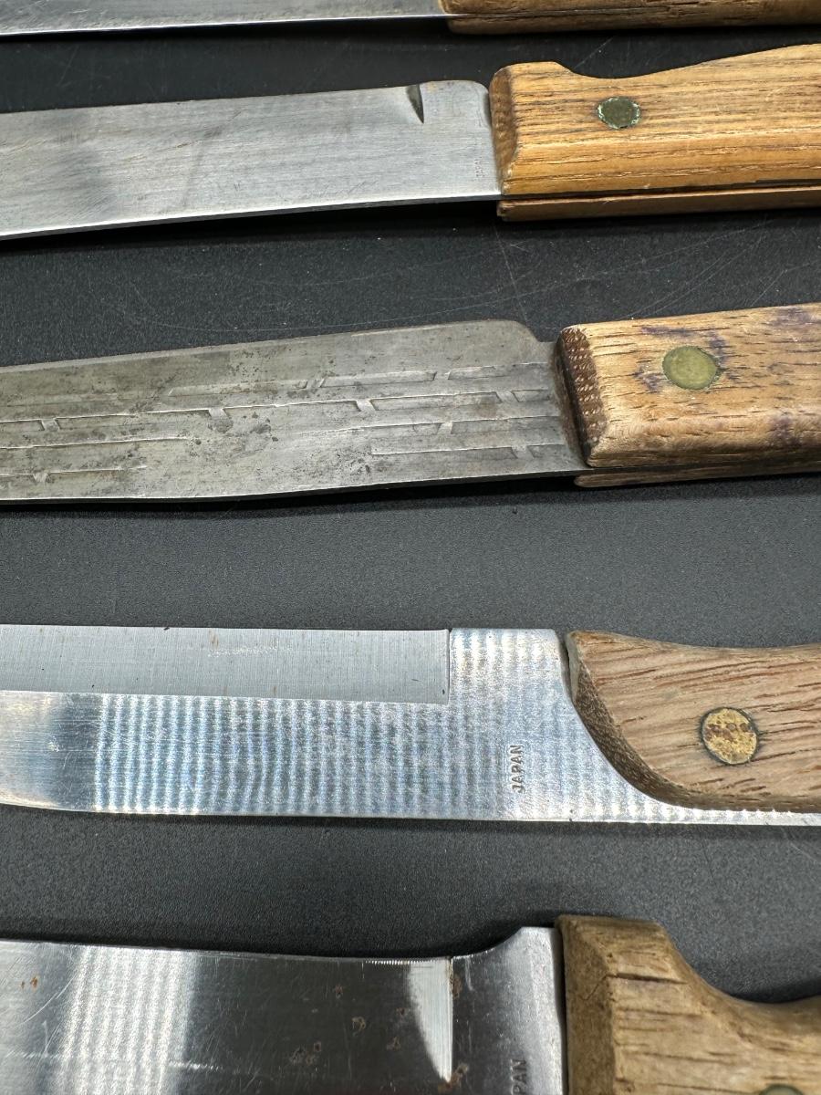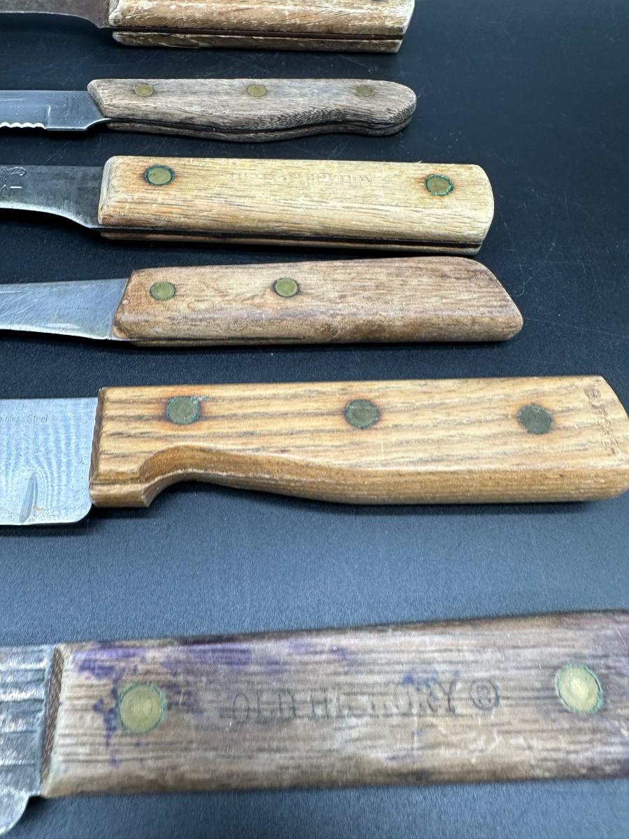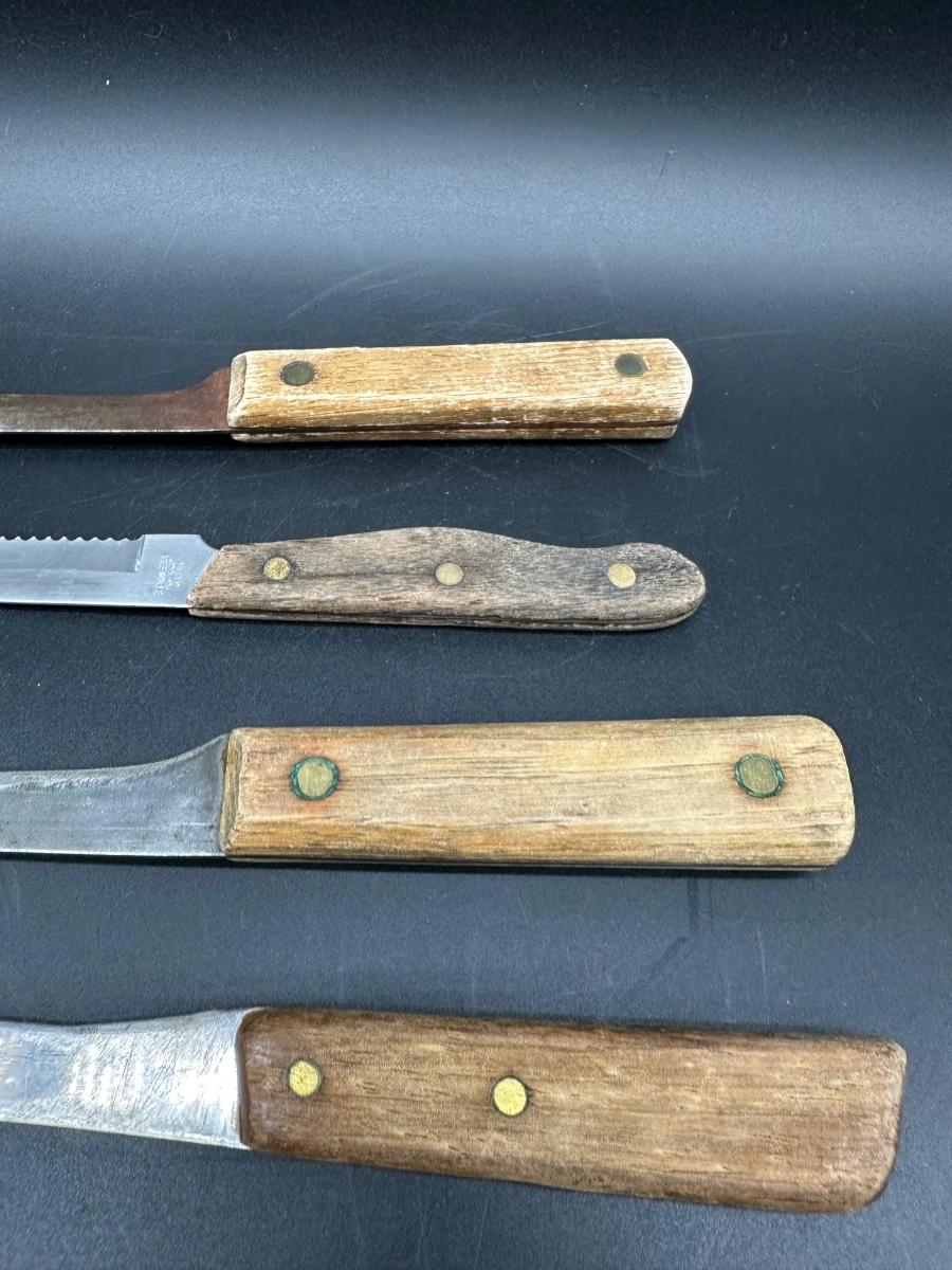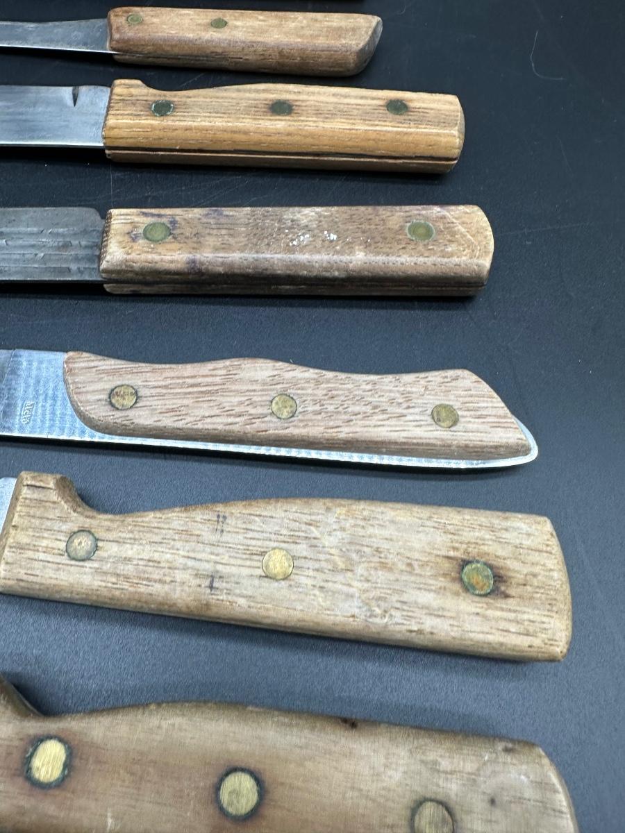 Mixed lot of 10 vintage kitchen and butcher knives featuring wood handles and riveted construction. Includes a variety of carving, slicer, utility, and bread knives.