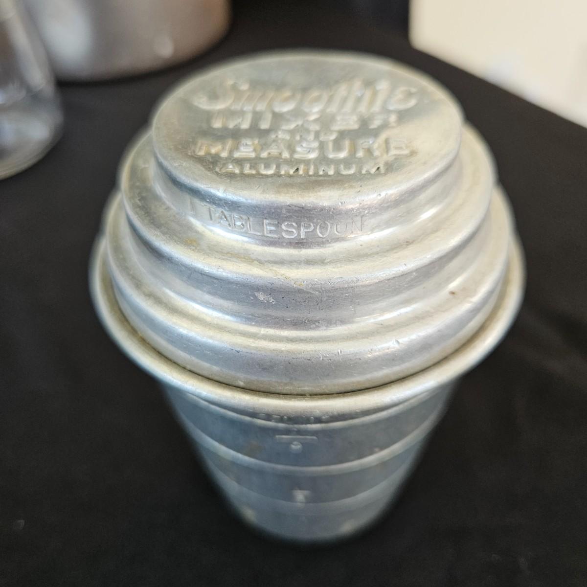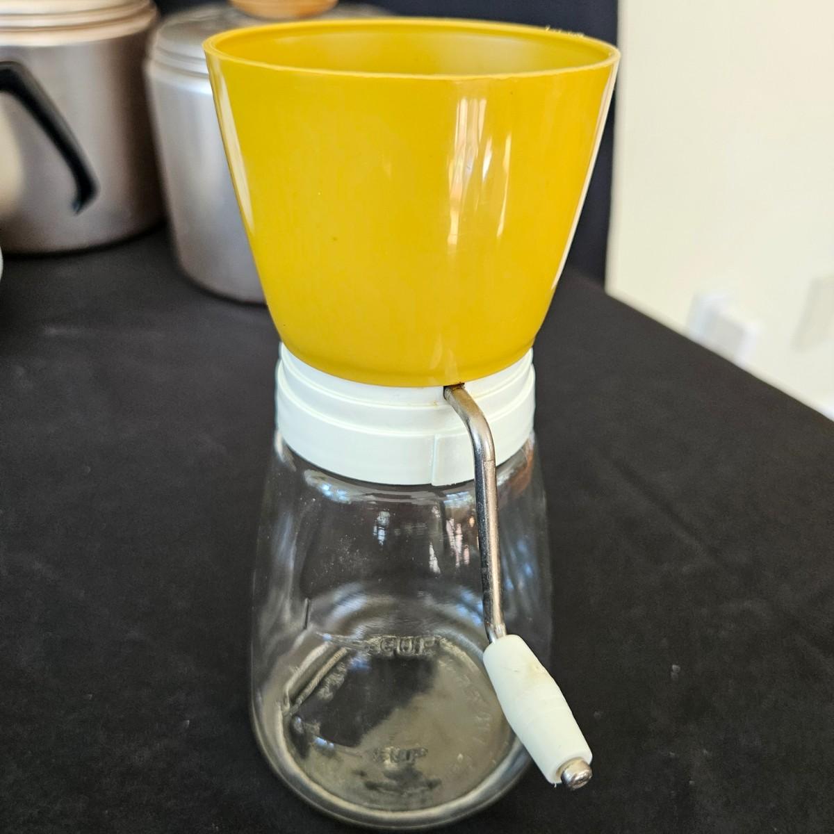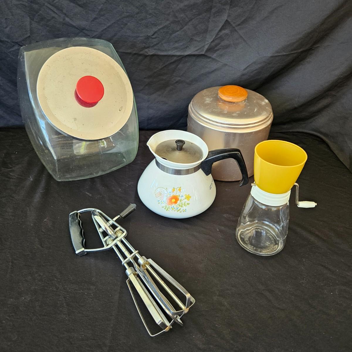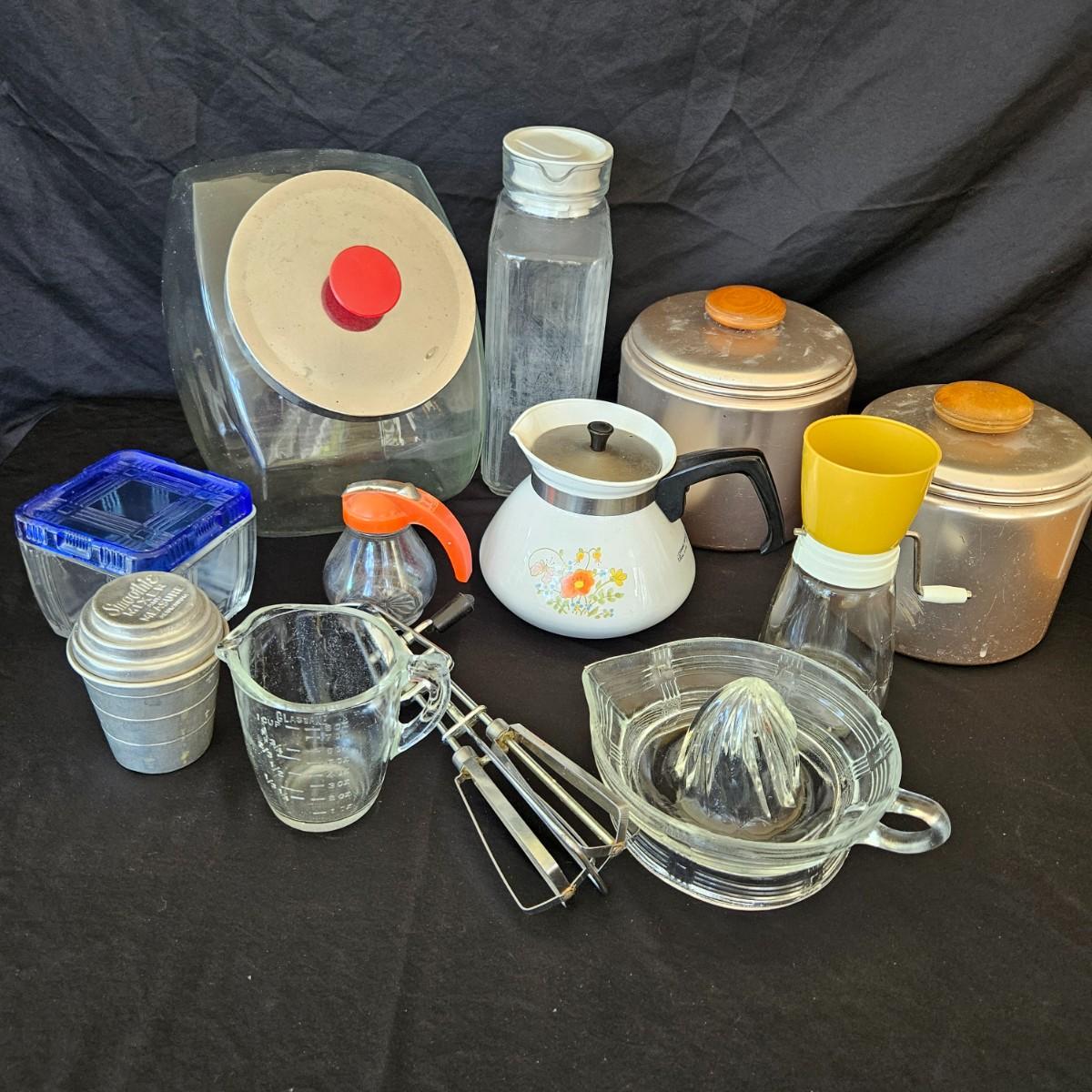 An assortment of vintage kitchen items that includes glass Pyrex, and metal containers, a Corning Ware coffee pot, a glass juicer, grinder, aluminum smoothie mixer and measure, a hand crank beater and more. See attached pictures for full inventory. The large glass container with the metal lid measures approximately 7" x 11" x 9.5"H. Shipping available