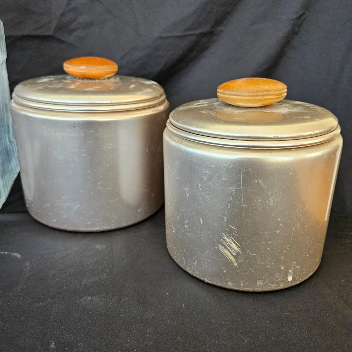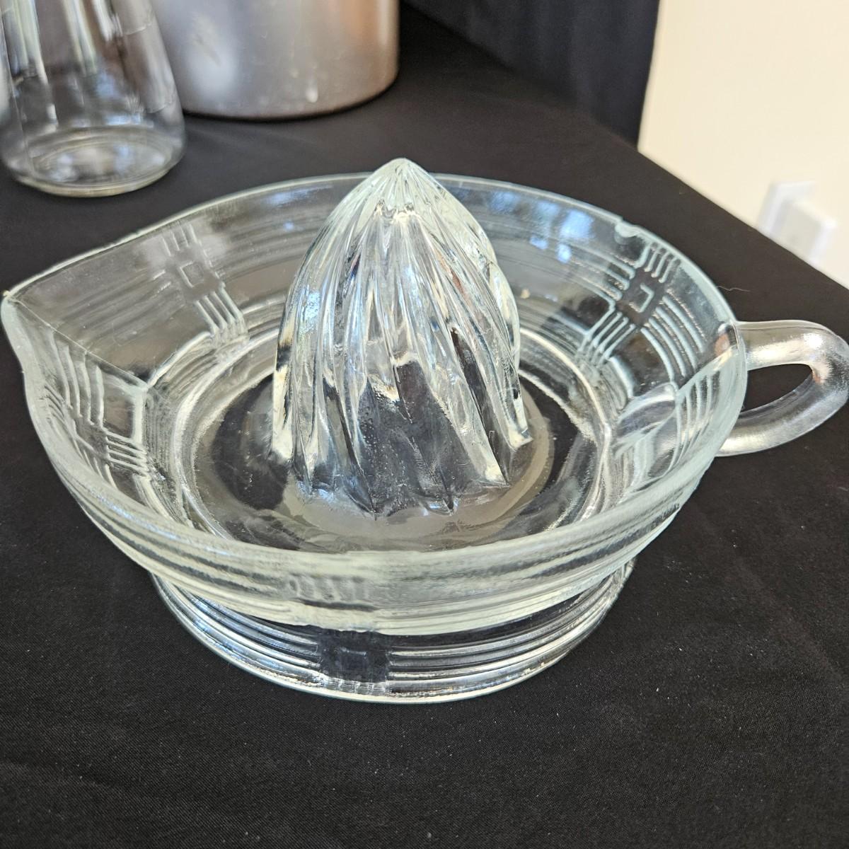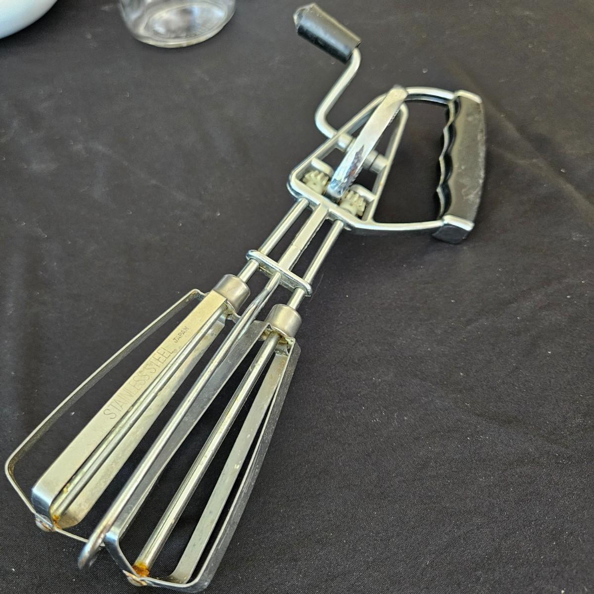 An assortment of vintage kitchen items that includes glass Pyrex, and metal containers, a Corning Ware coffee pot, a glass juicer, grinder, aluminum smoothie mixer and measure, a hand crank beater and more. See attached pictures for full inventory. The large glass container with the metal lid measures approximately 7" x 11" x 9.5"H. Shipping available
