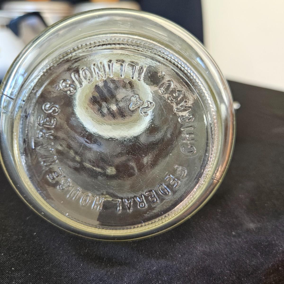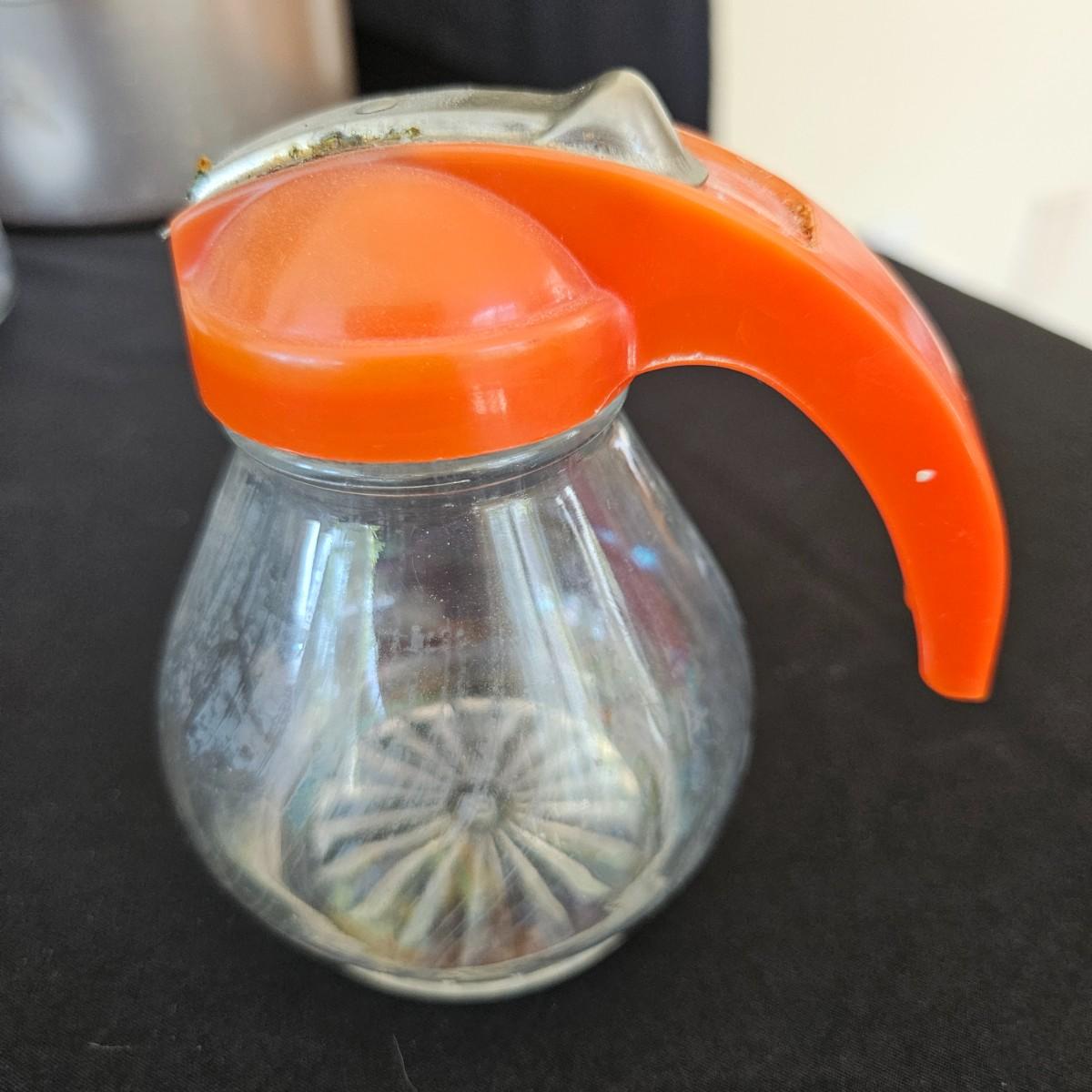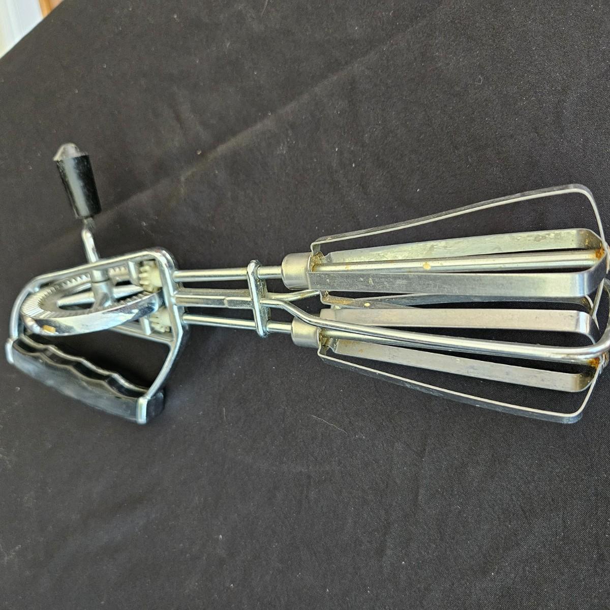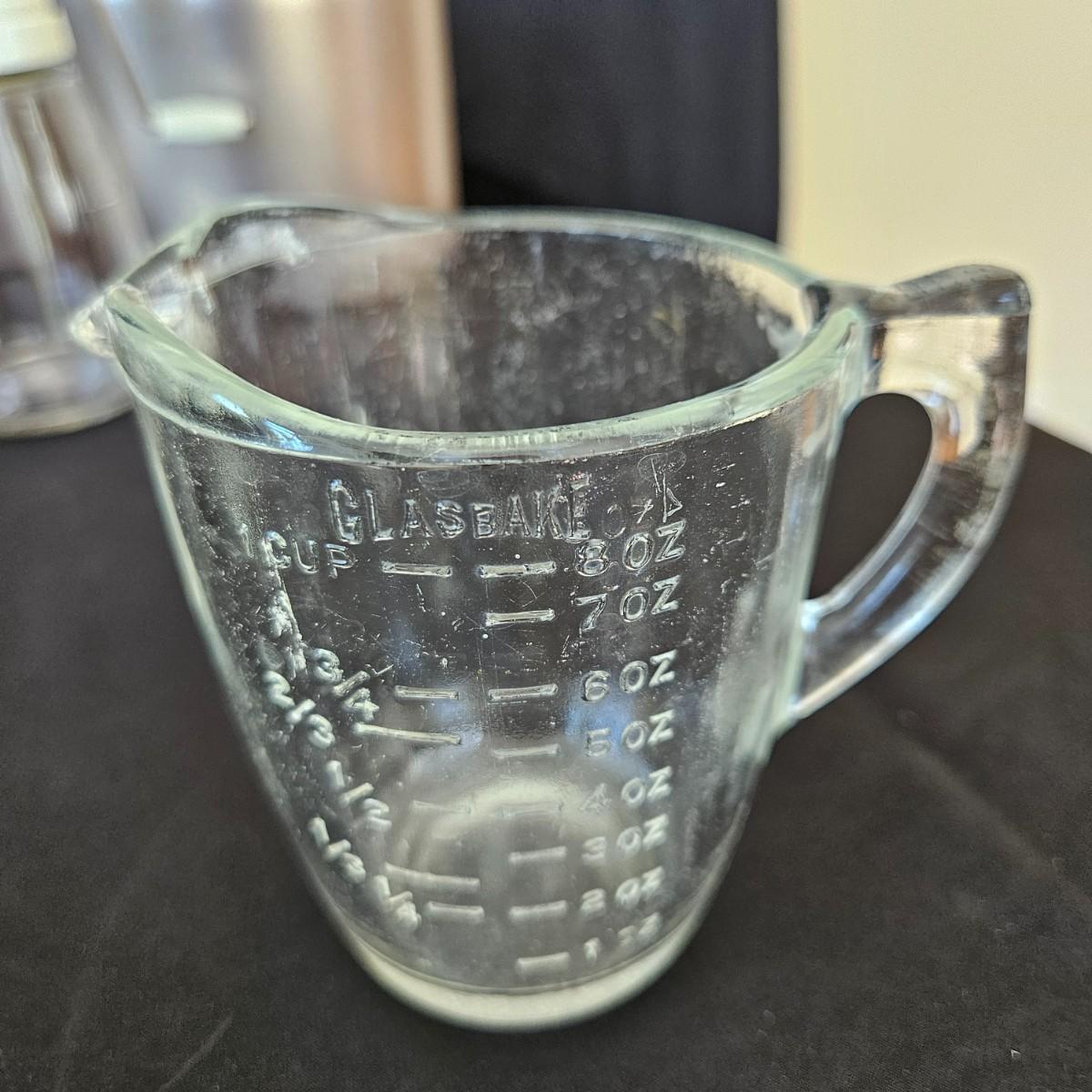 An assortment of vintage kitchen items that includes glass Pyrex, and metal containers, a Corning Ware coffee pot, a glass juicer, grinder, aluminum smoothie mixer and measure, a hand crank beater and more. See attached pictures for full inventory. The large glass container with the metal lid measures approximately 7" x 11" x 9.5"H. Shipping available