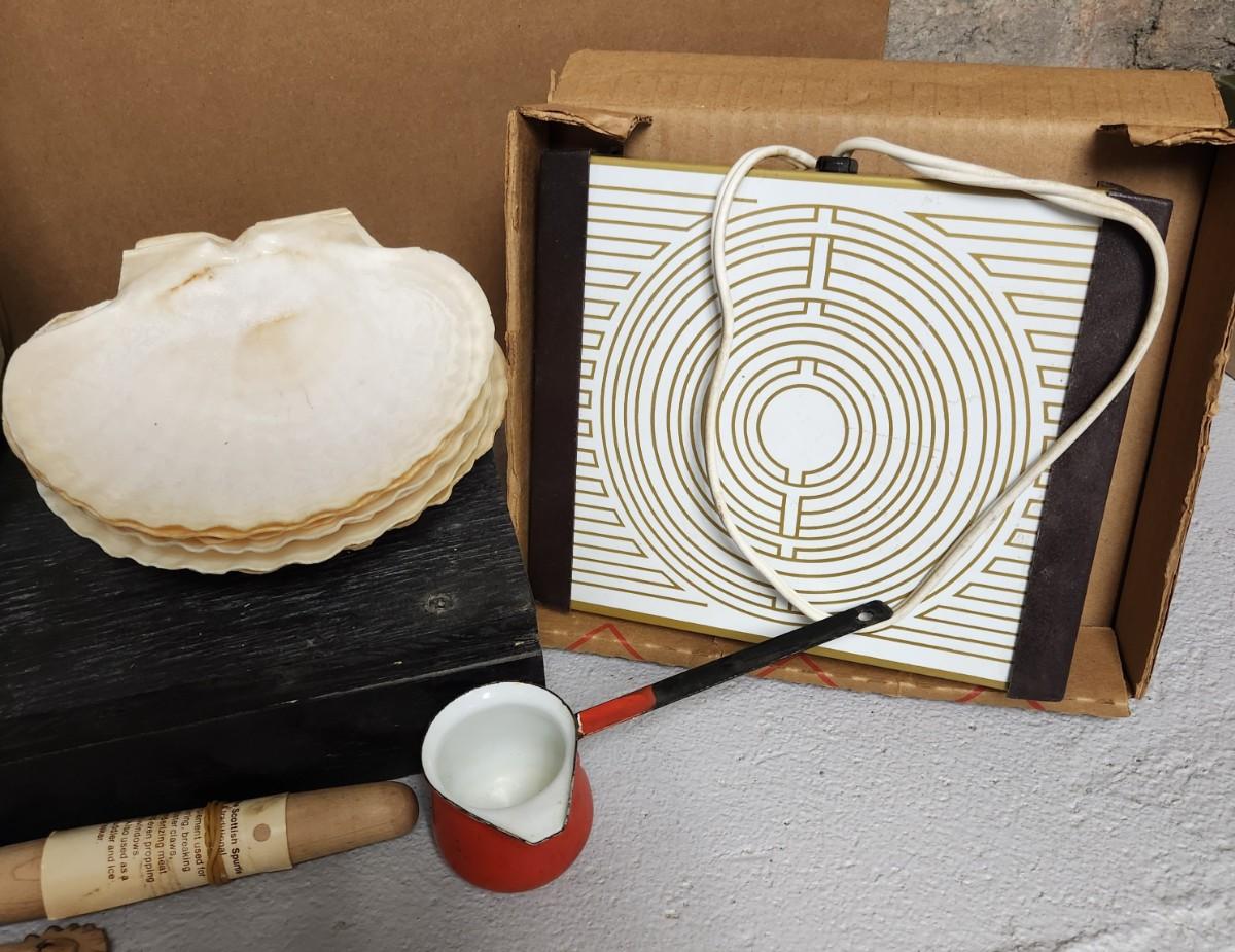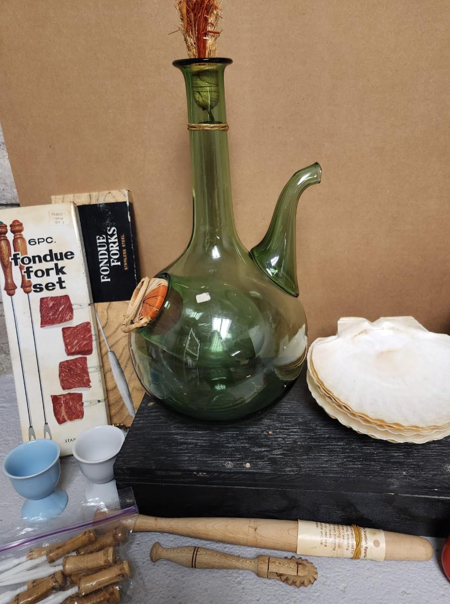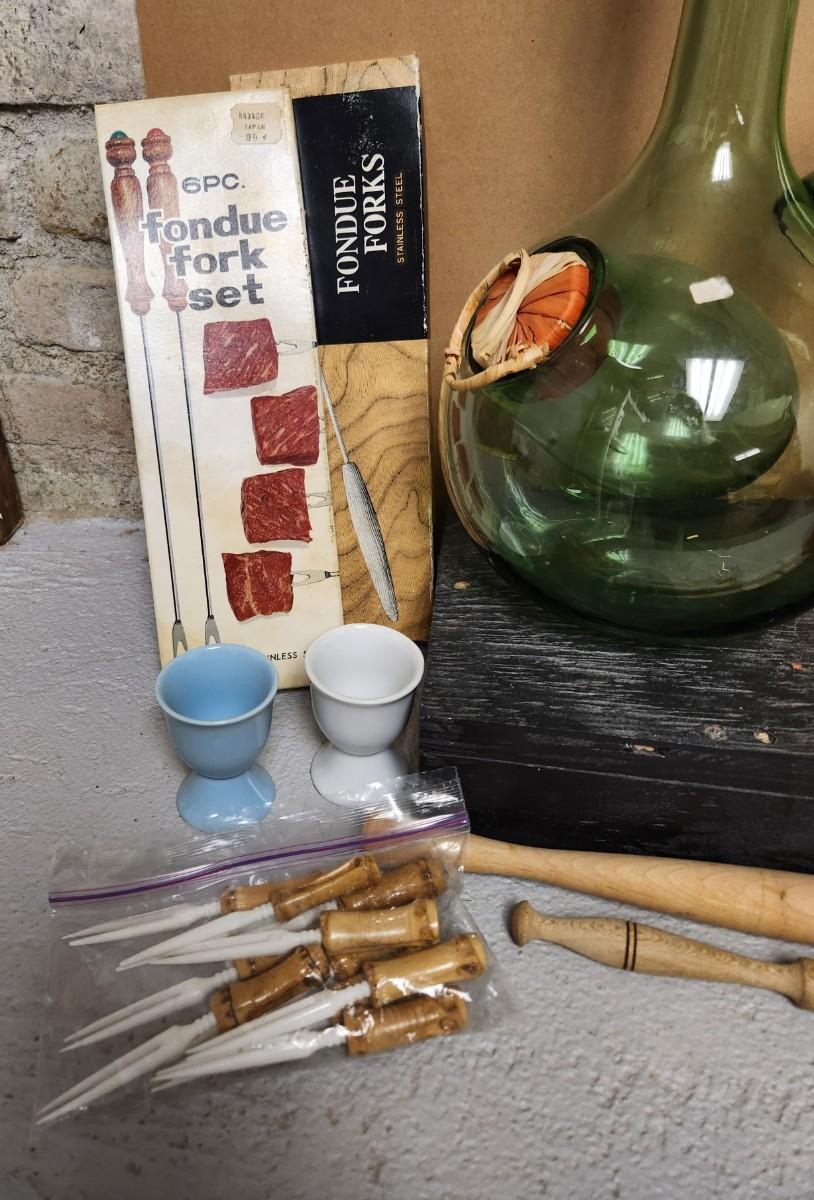 A pair of egg cups, 8 scallop shells for Coquilles St. Jacques, two boxes of fondue forks, 10 bamboo stemmed appetizer forks, wine decanter, food warmer plate, red enamel saucier, muddler and pie crimper