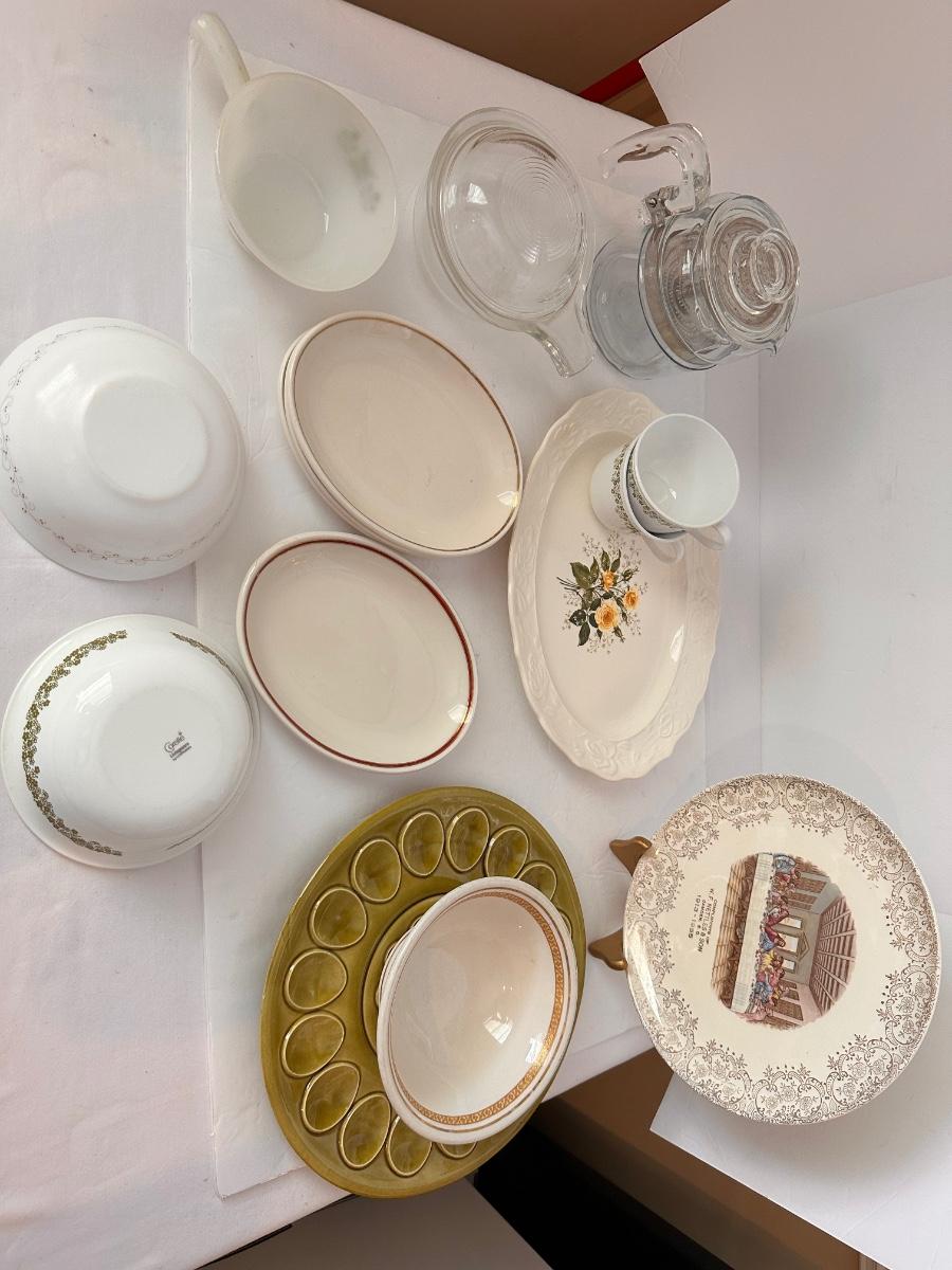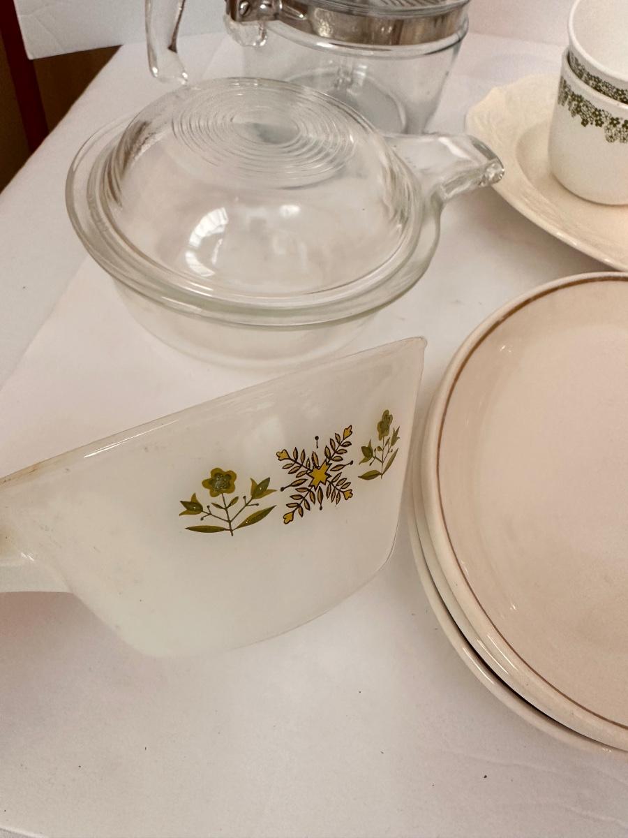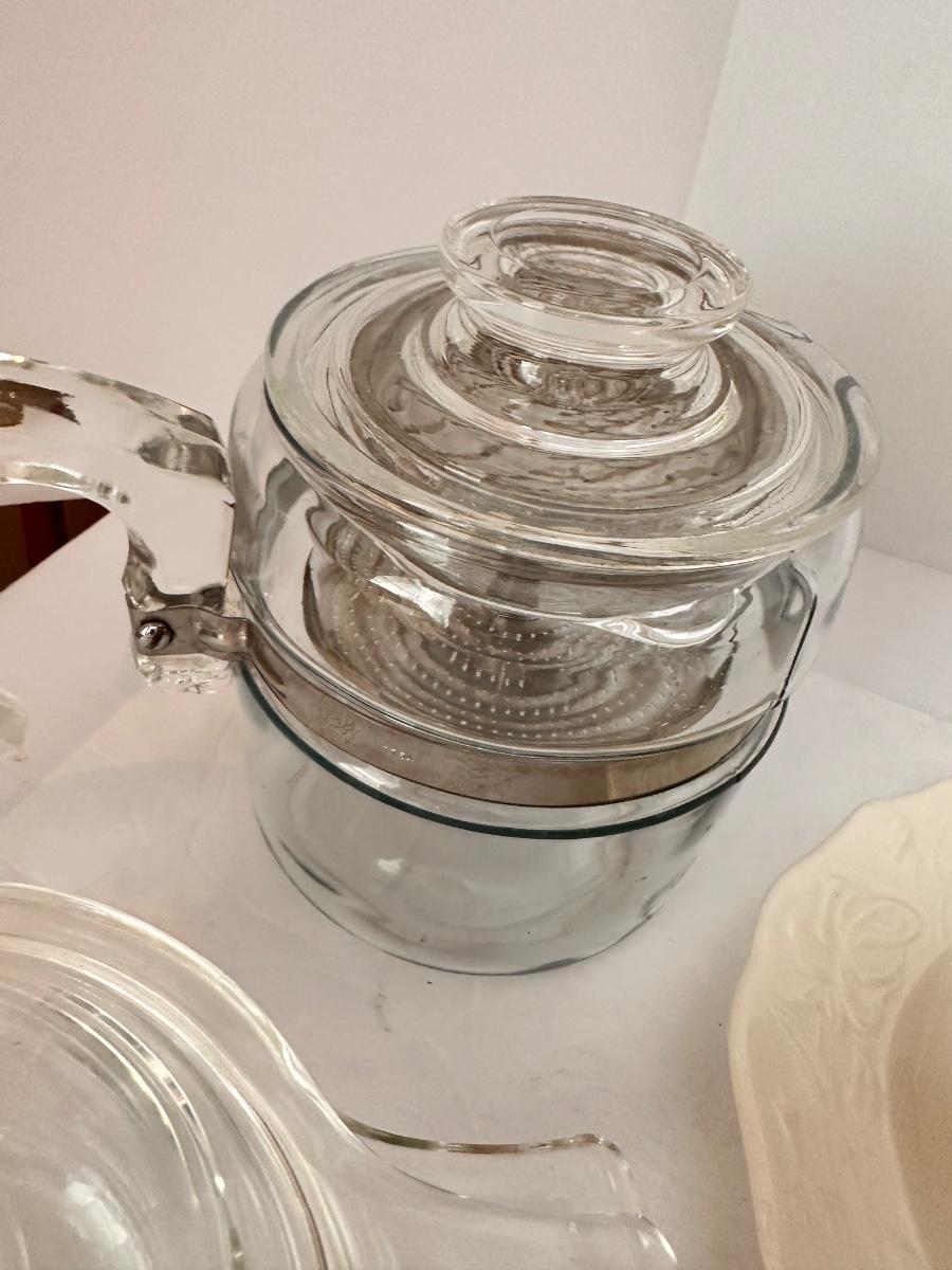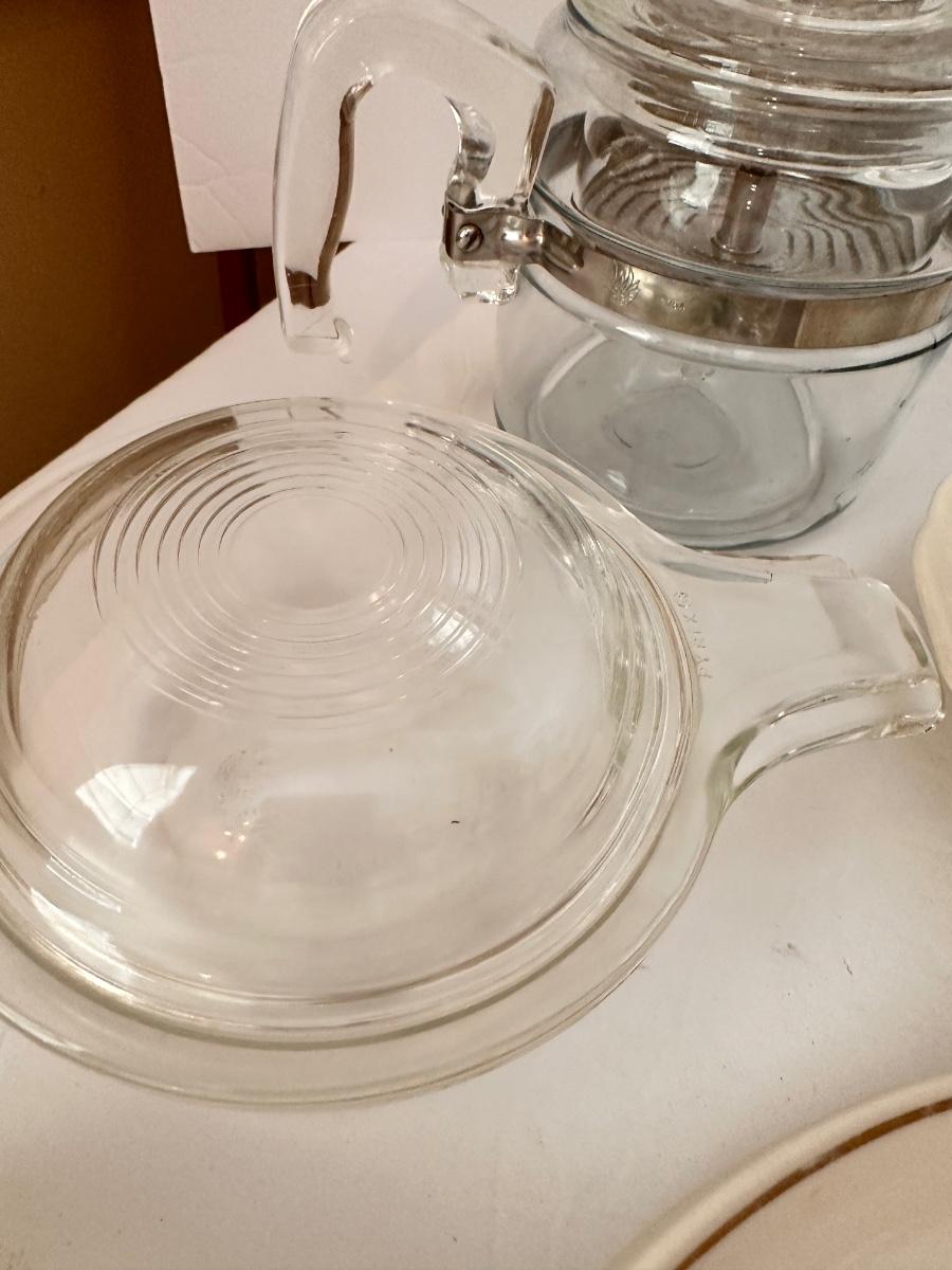 Vintage Kitchen Glassware Lot Includes Correlle, Clear Pyrex Percolator, and More As Pictured