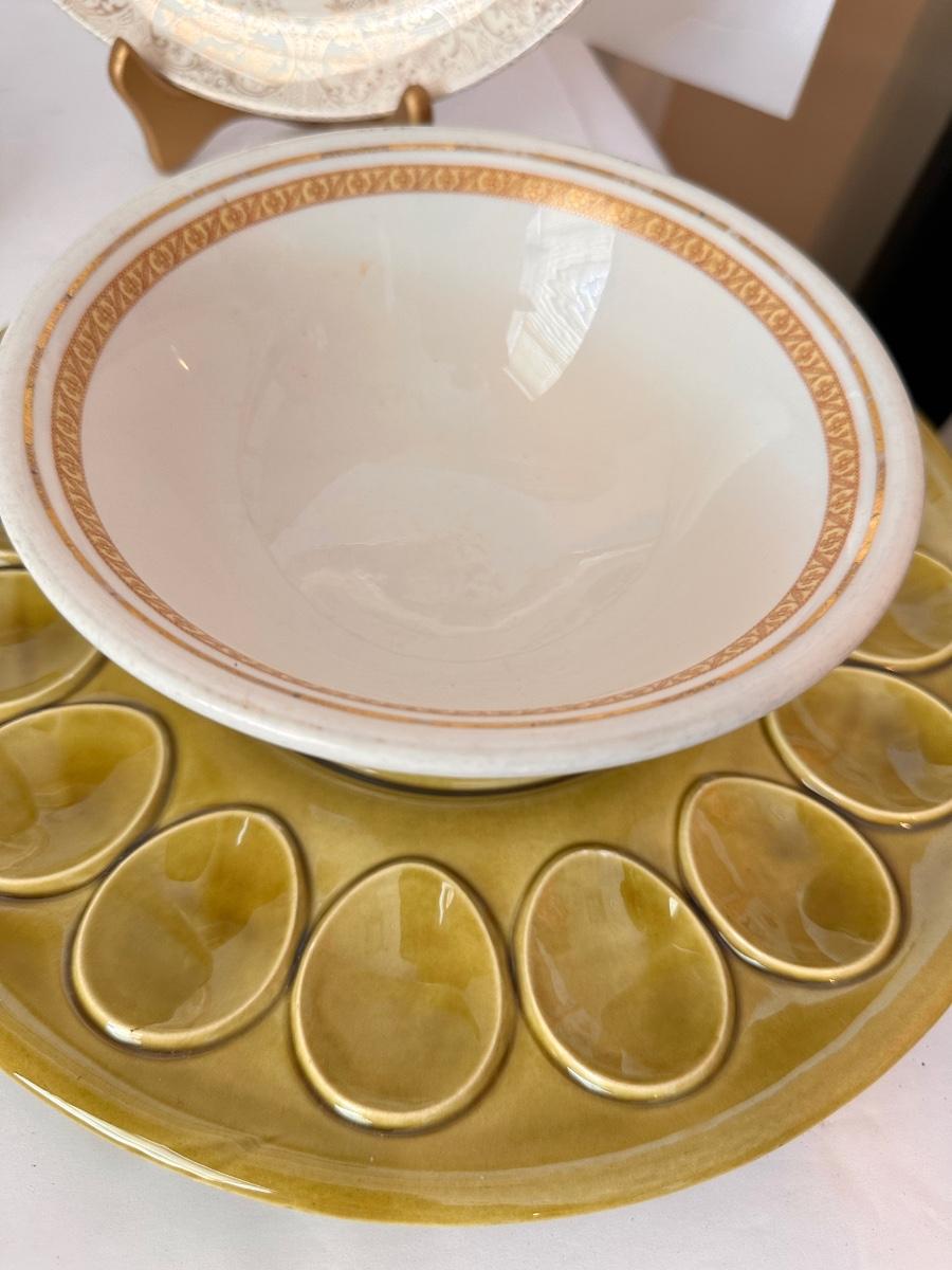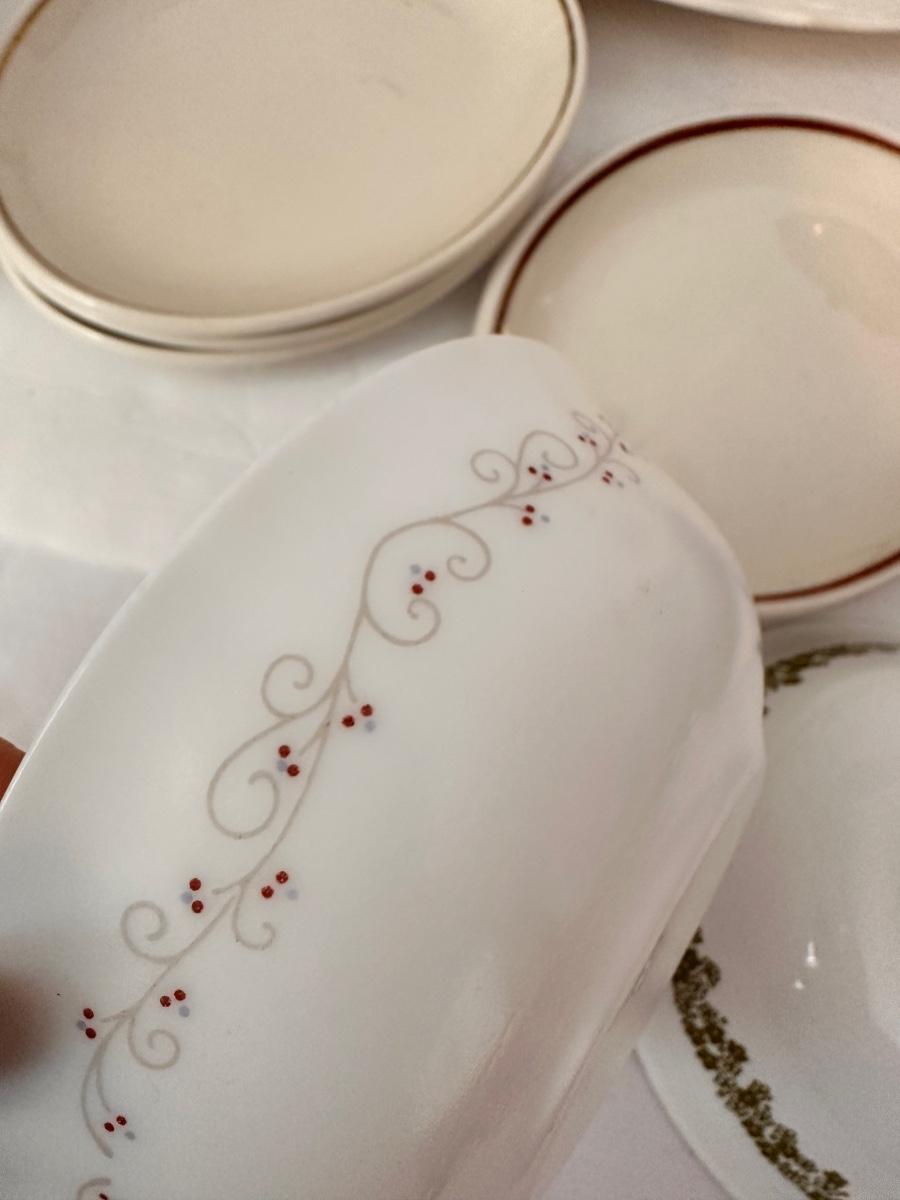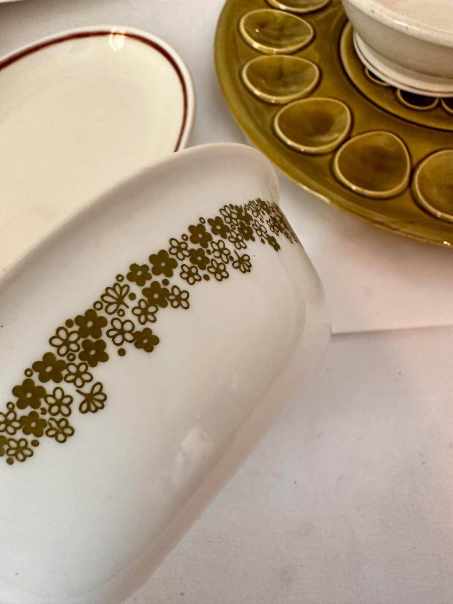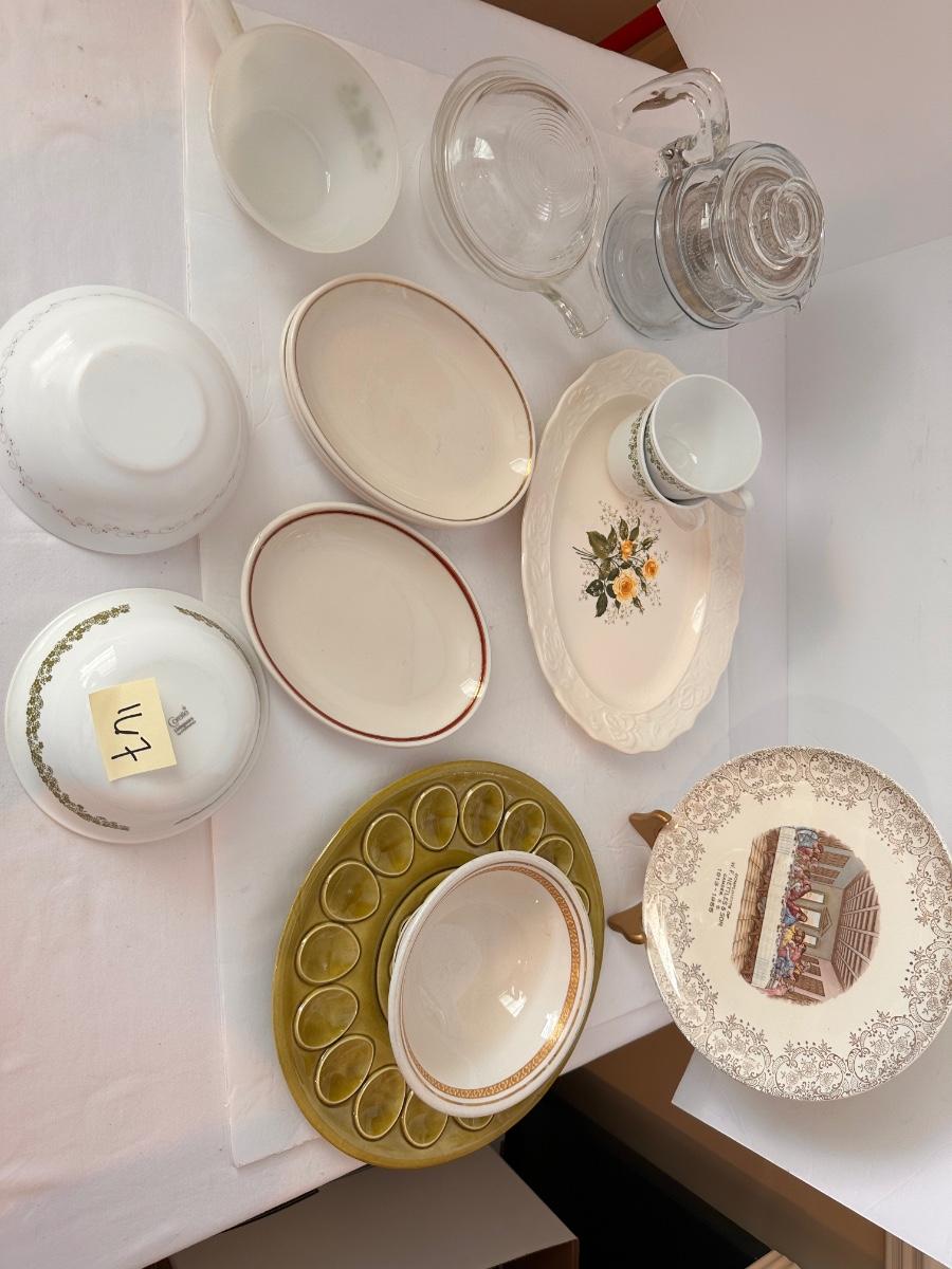 Vintage Kitchen Glassware Lot Includes Correlle, Clear Pyrex Percolator, and More As Pictured