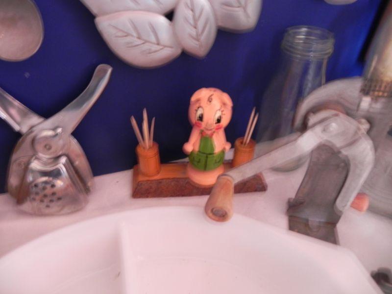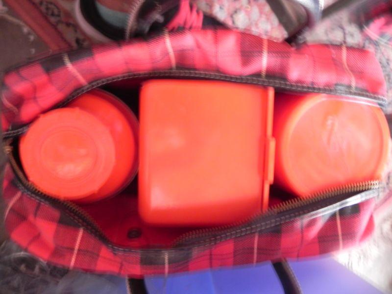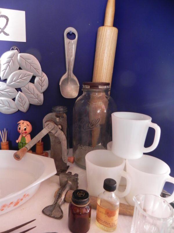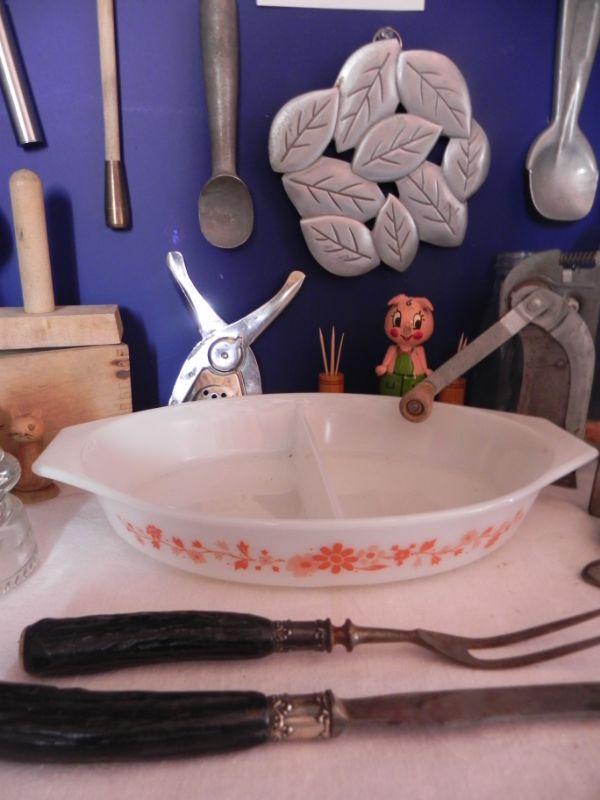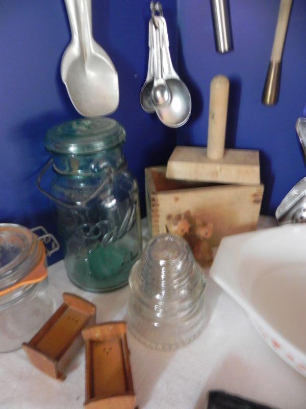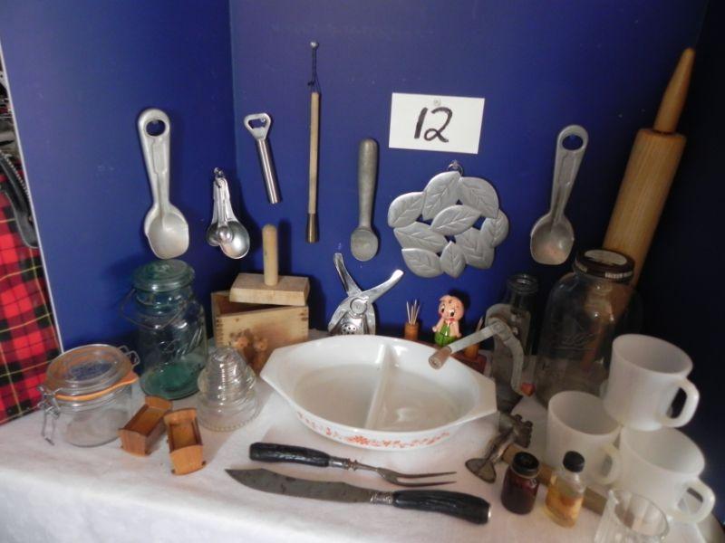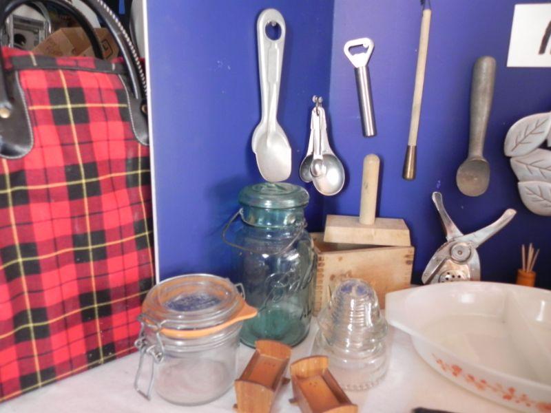 PYREX DIVIDED DISH, FIREKING COFFEE MUGS, WOOD SALT & PEPPER SHAKERS, METAL ICECREAM SCOOP, BONE HANDLE SERVING FORK & KNIFE SET, 3 THERMOS SET IN BAG, LEMON SQUEEZE, VINTAGE JARS, COPCO METAL HOT PLATE HOLDER AND MUCH MUCH MORE