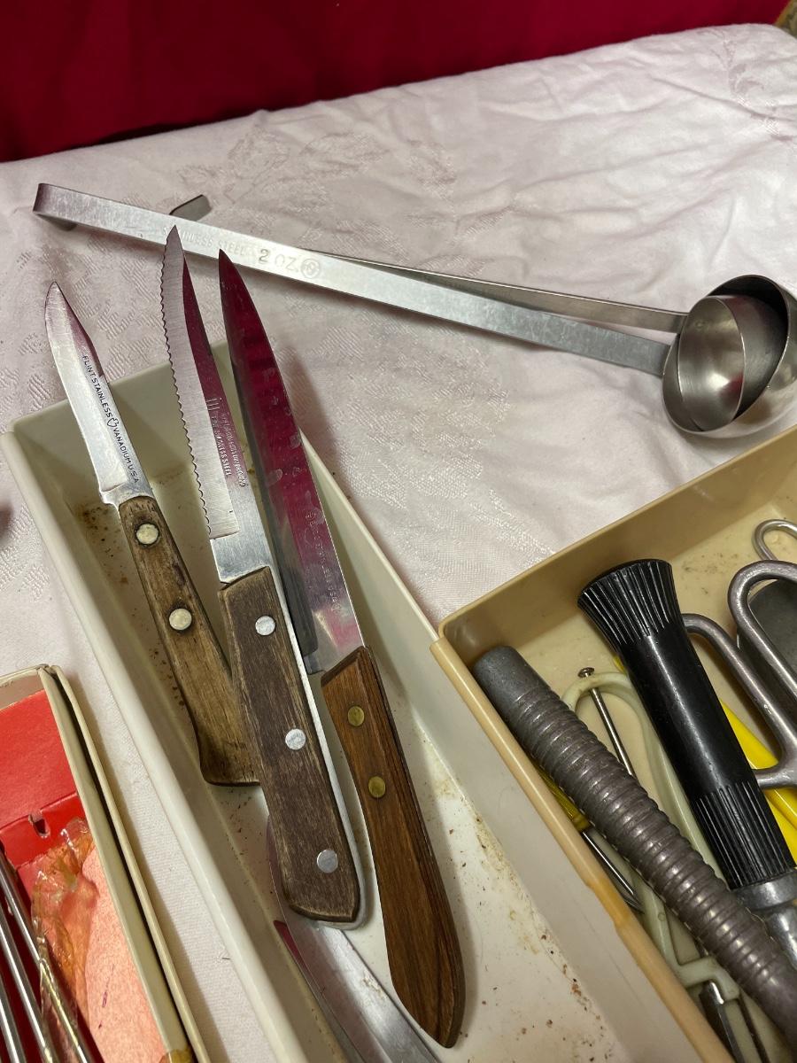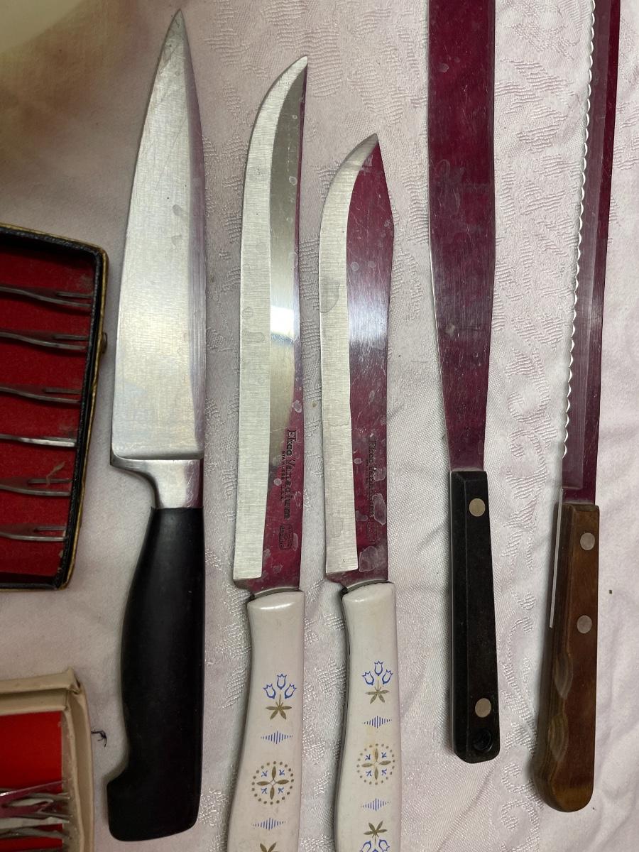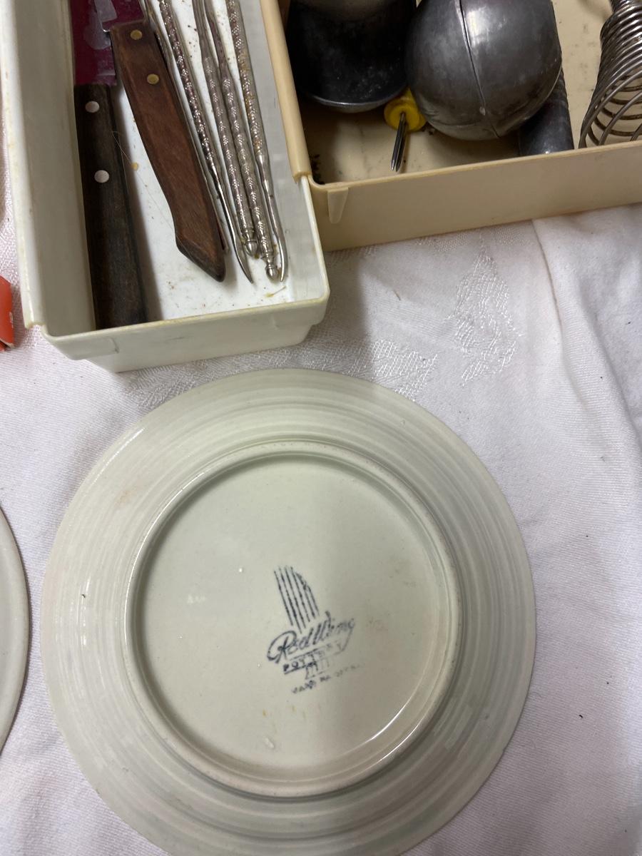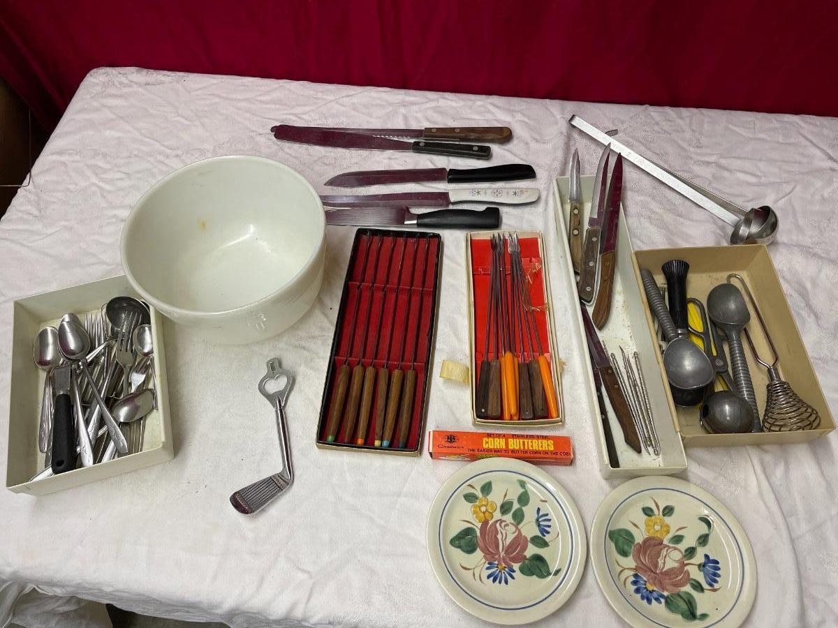 Includes 2 Red Wing small plates, gold bottle opener, Ecko & Flint knives, fondue skewers, corn buttered and Pyrex bowl