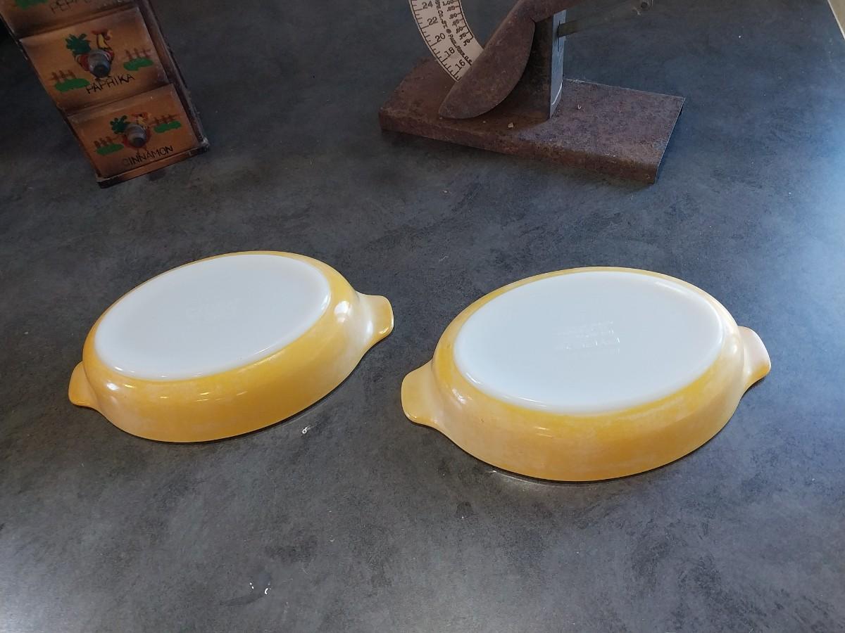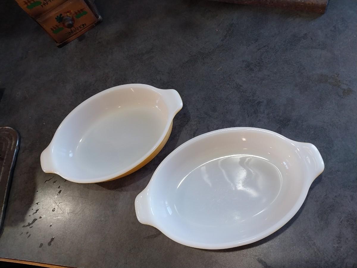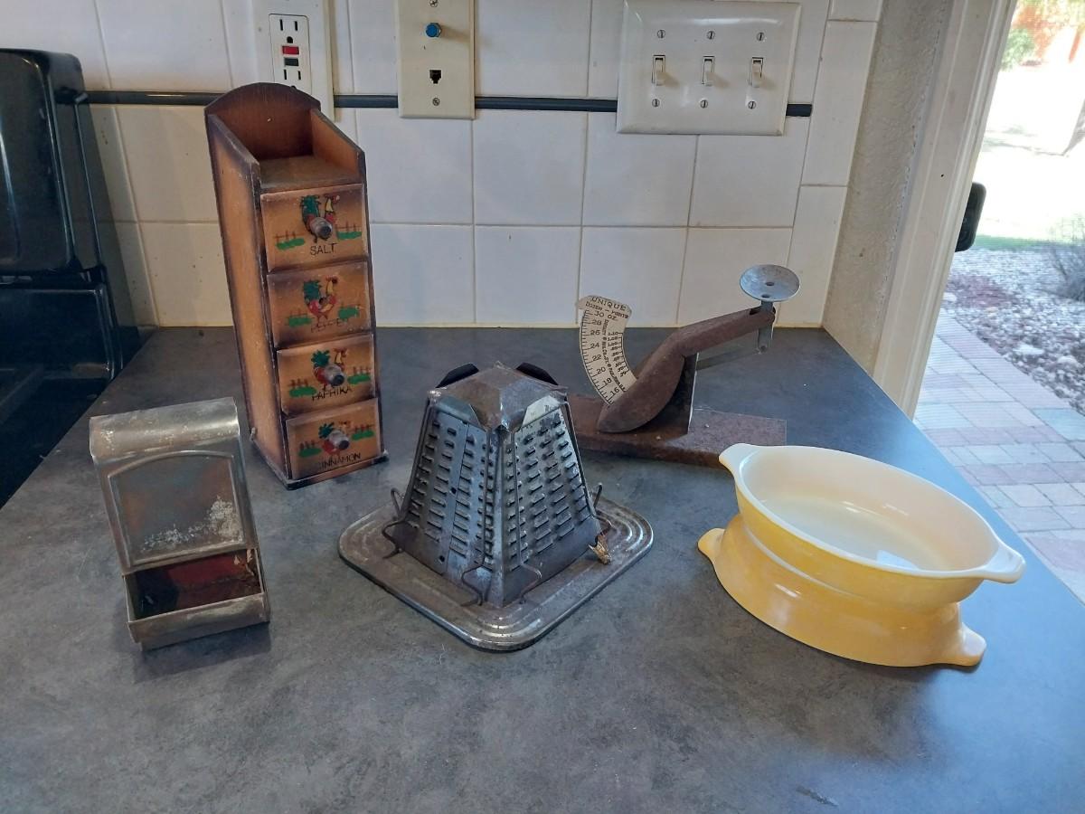 MATCH HOLDER, OLD TOASTER, 2 SMALLER PYREX BAKING DISHES (THE COLOR IS FADED IN PLACES)