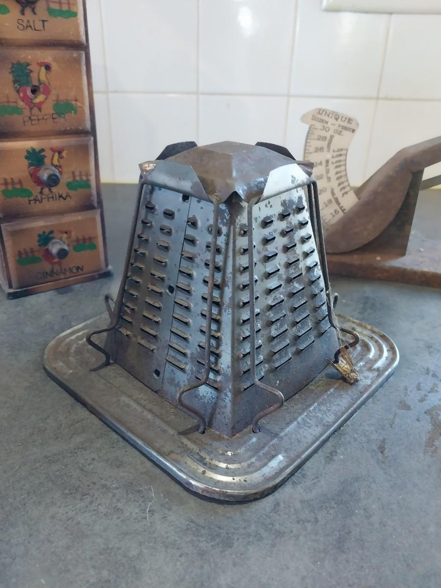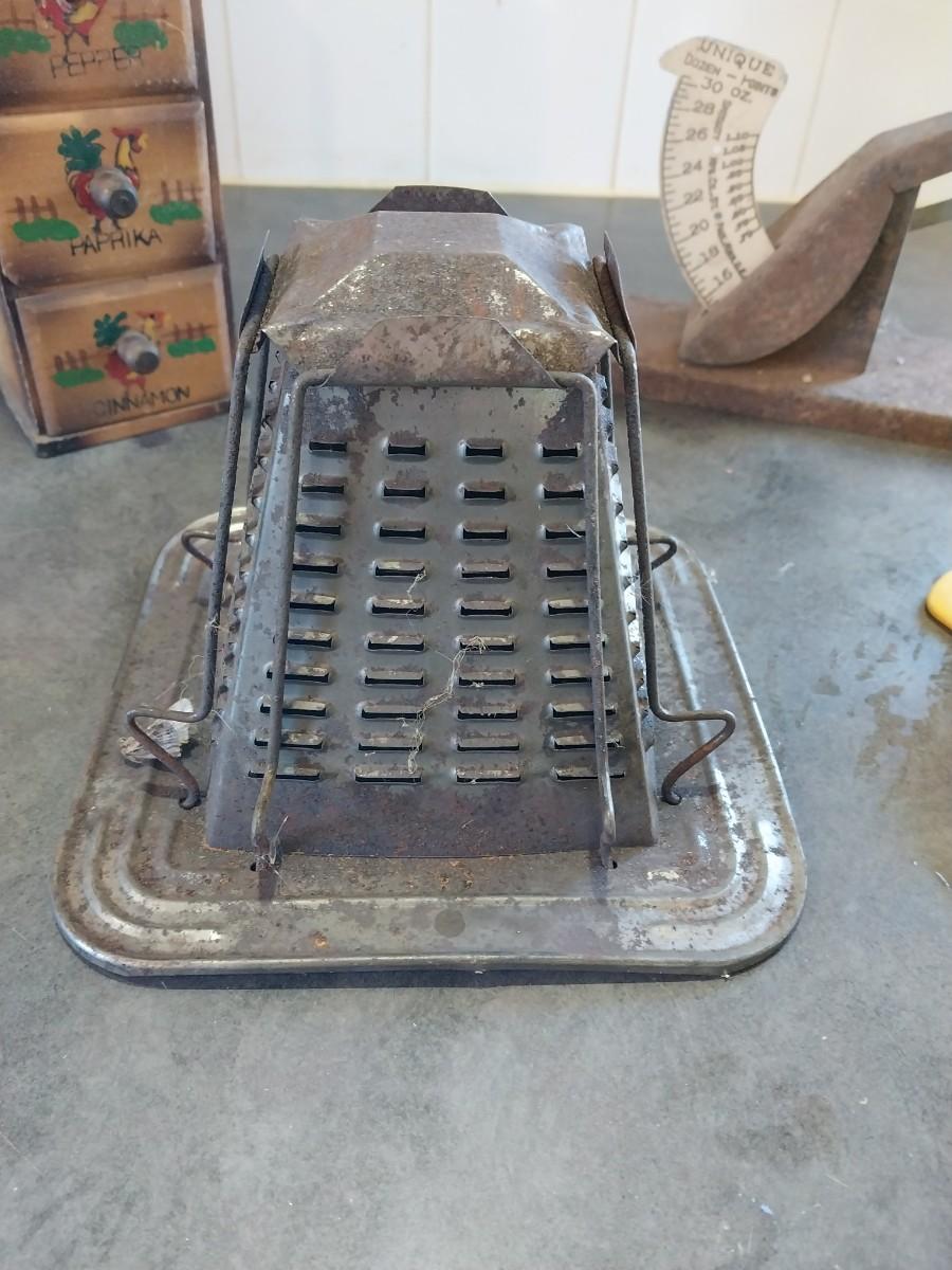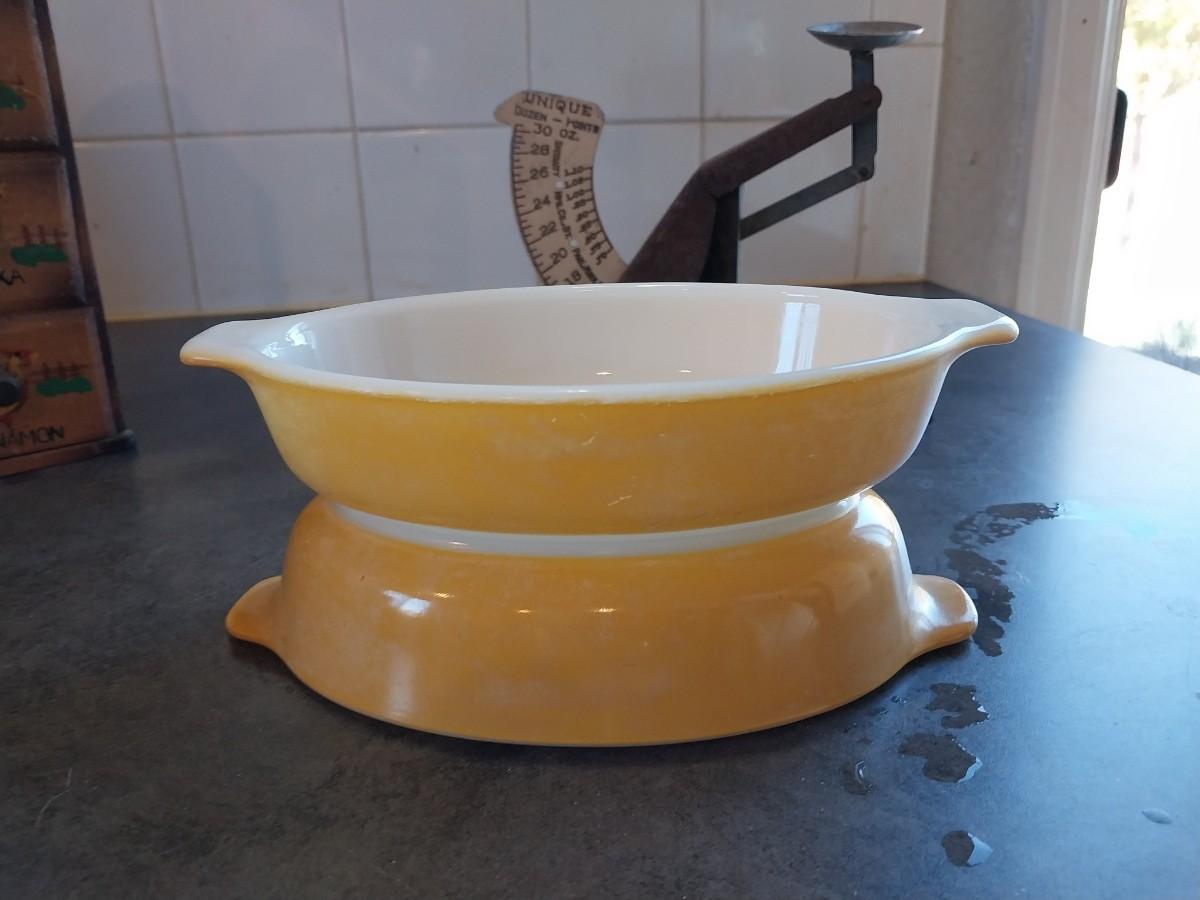 MATCH HOLDER, OLD TOASTER, 2 SMALLER PYREX BAKING DISHES (THE COLOR IS FADED IN PLACES)