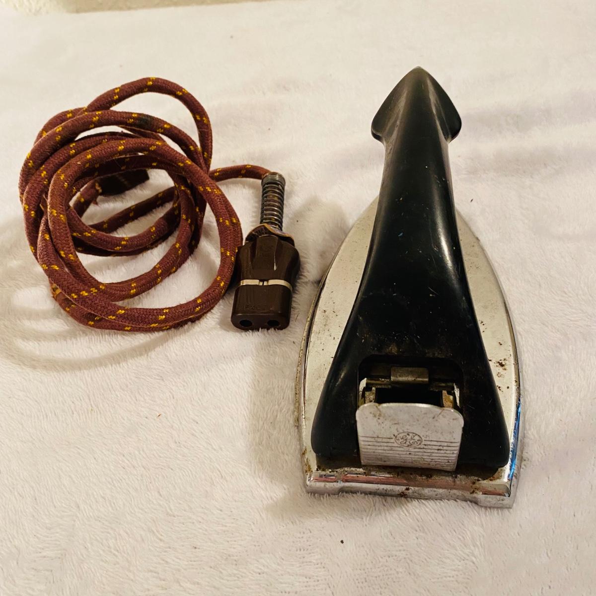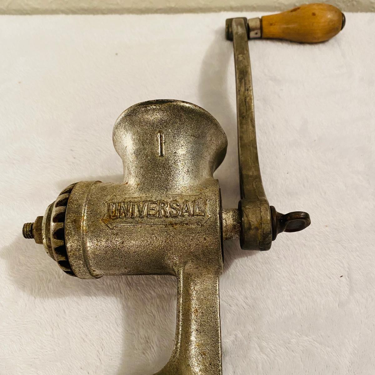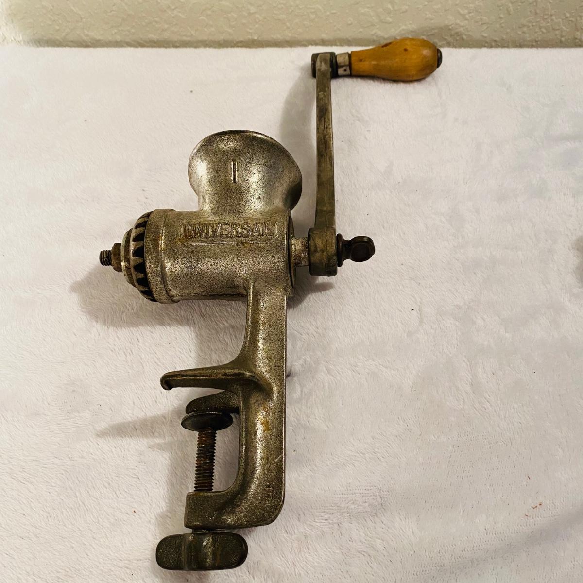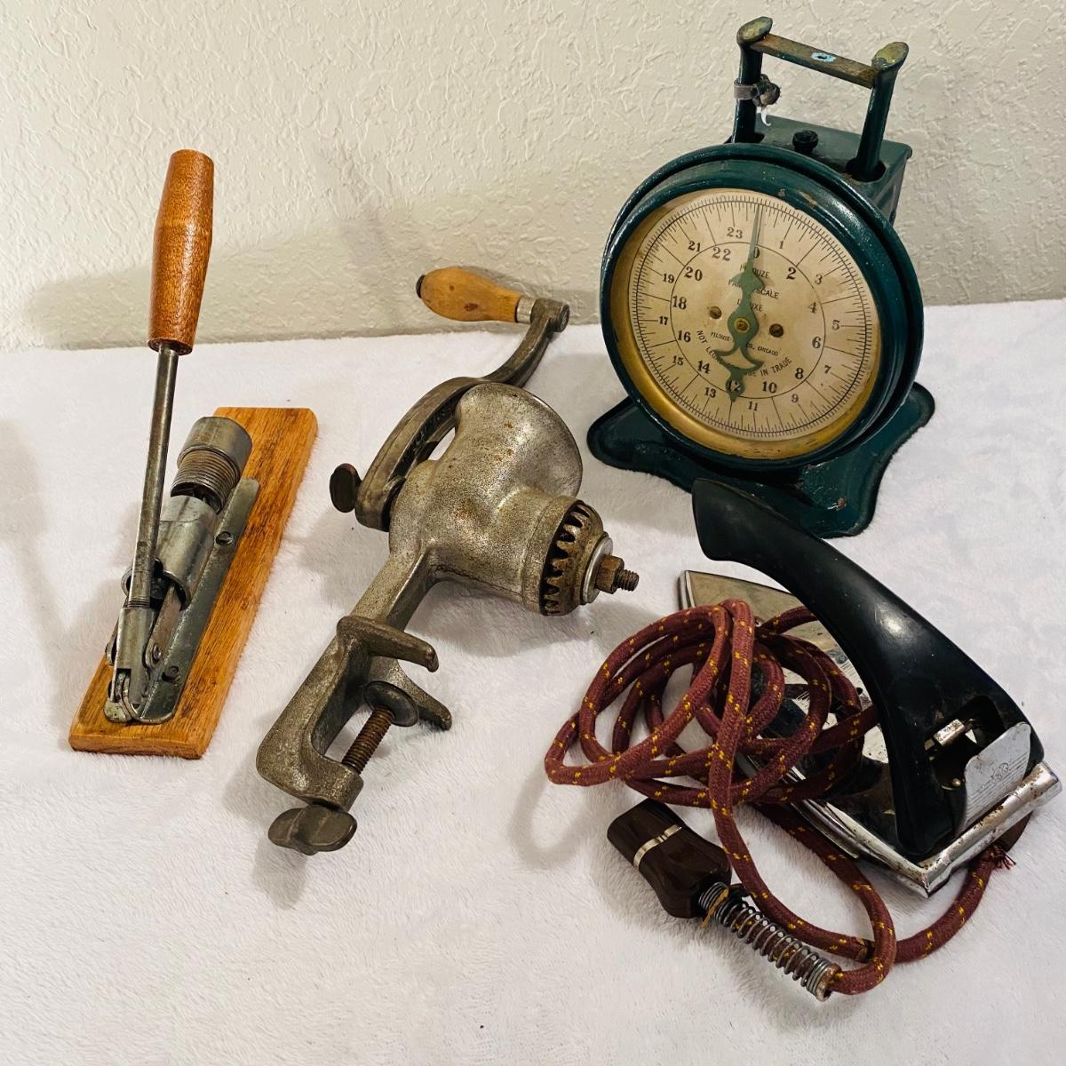 Includes wood and metal nutcracker, GE iron, Pelouze family scale (missing top), and Universal meat grinder made in USA.