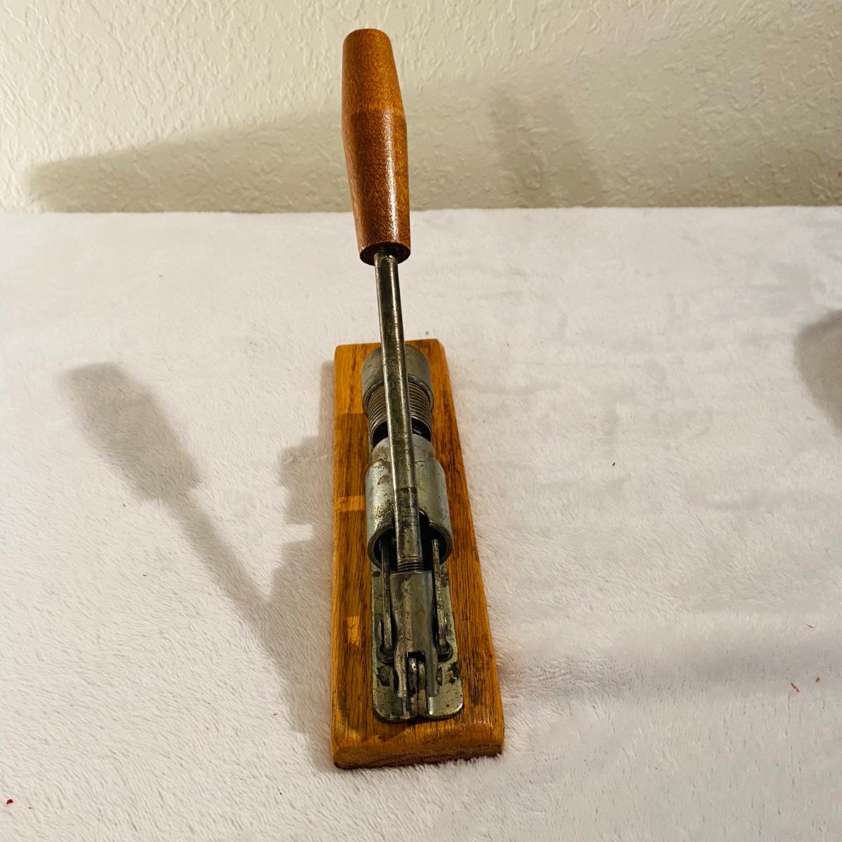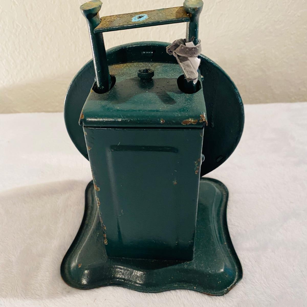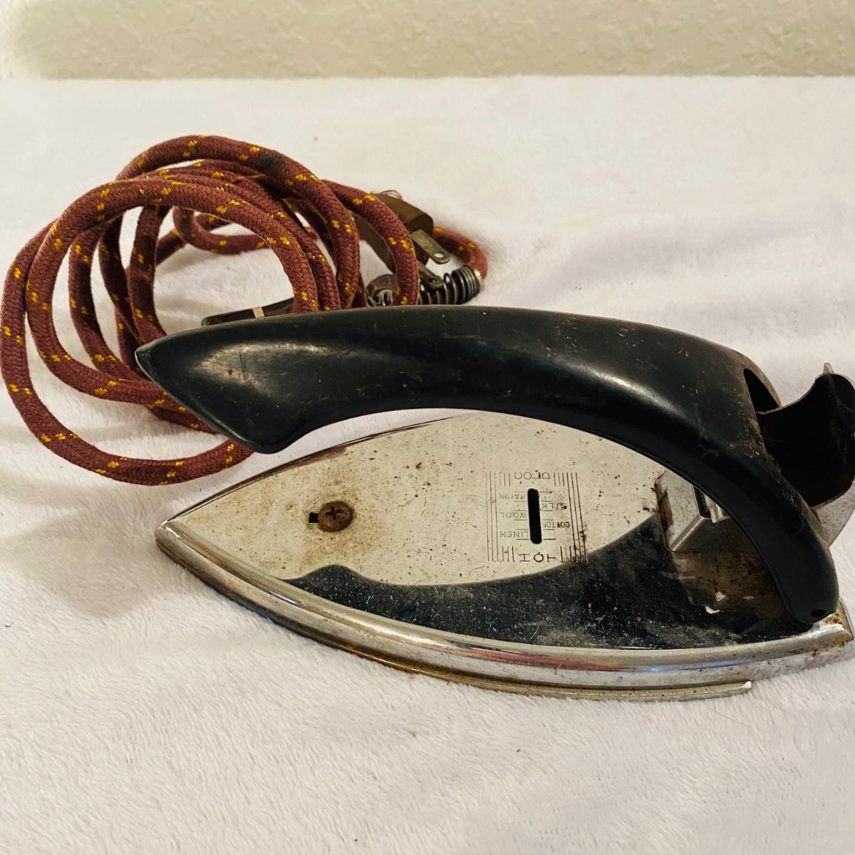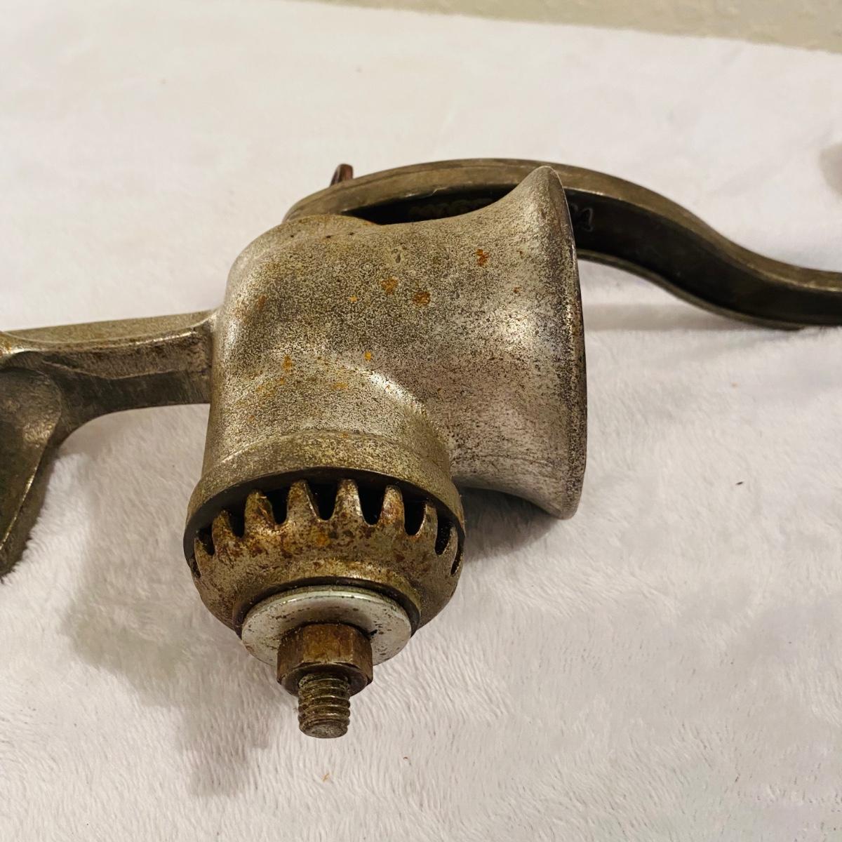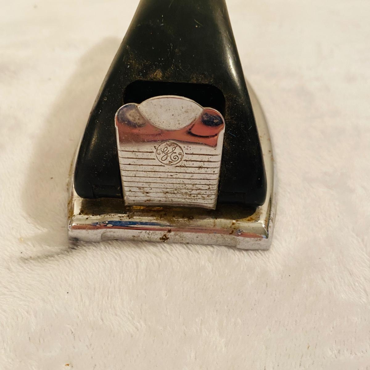 Includes wood and metal nutcracker, GE iron, Pelouze family scale (missing top), and Universal meat grinder made in USA.