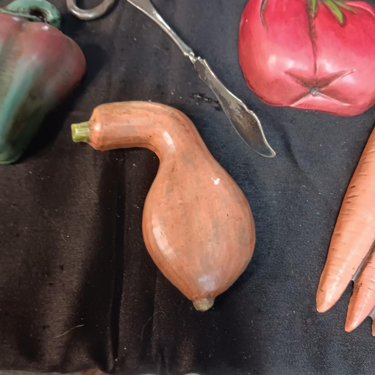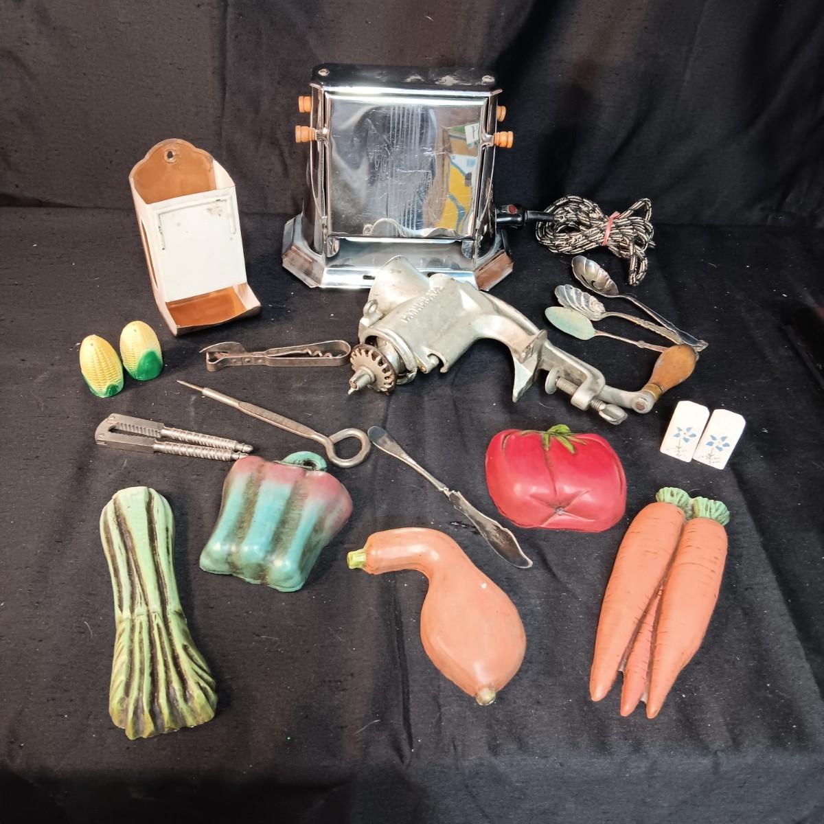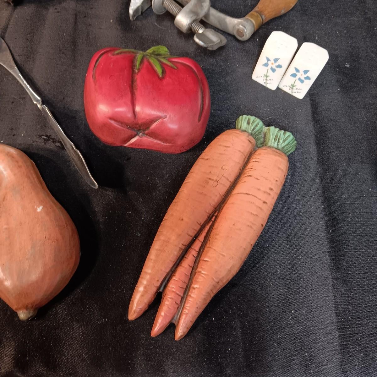VINTAGE KITCHEN ITEMS INCLUDING CHALKWARE WALL HUNG VEGETABLES