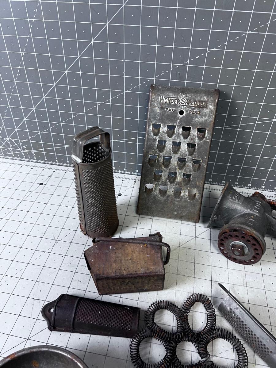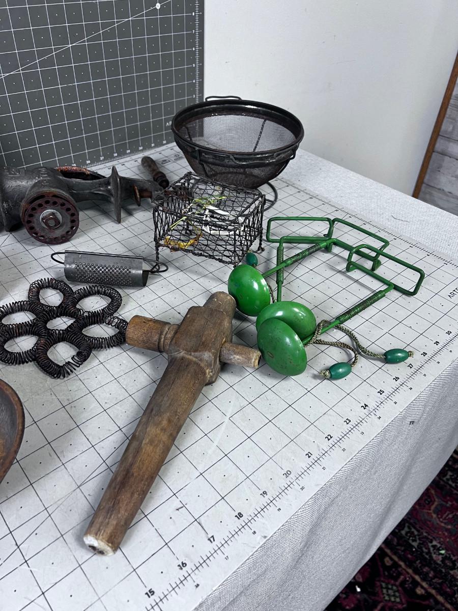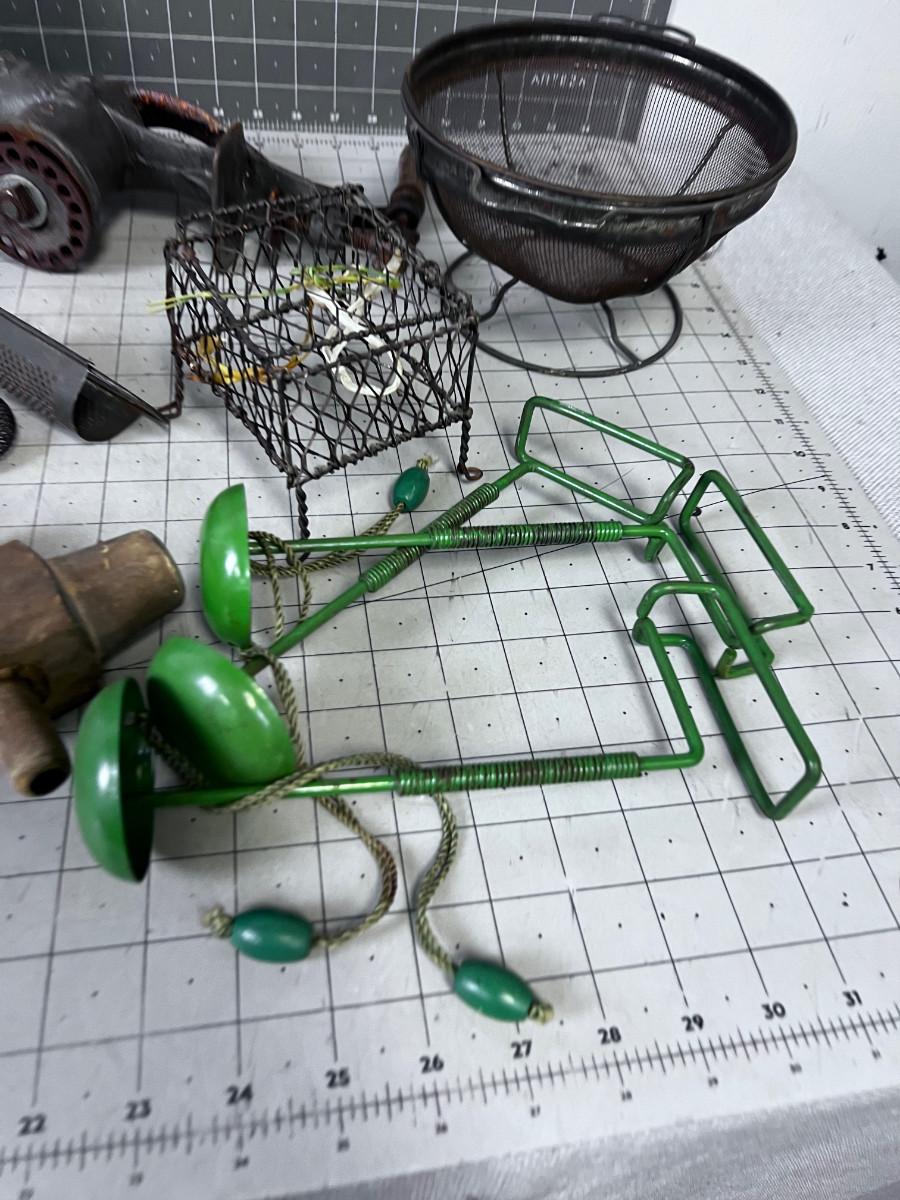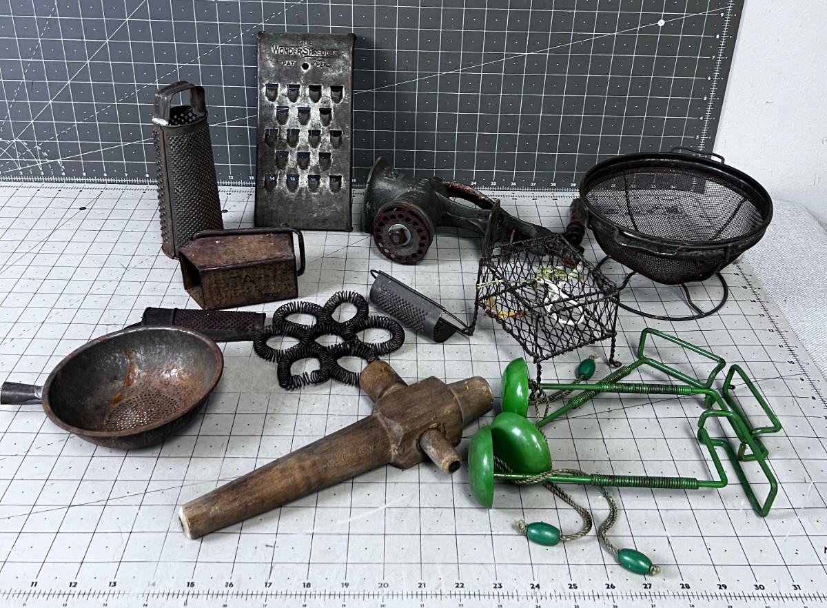 VINTAGE KITCHEN Items: Utensils, Grater, Grinder and GREEN Mystery Items