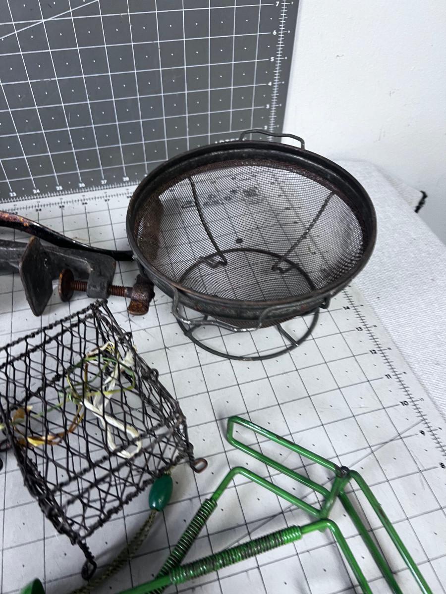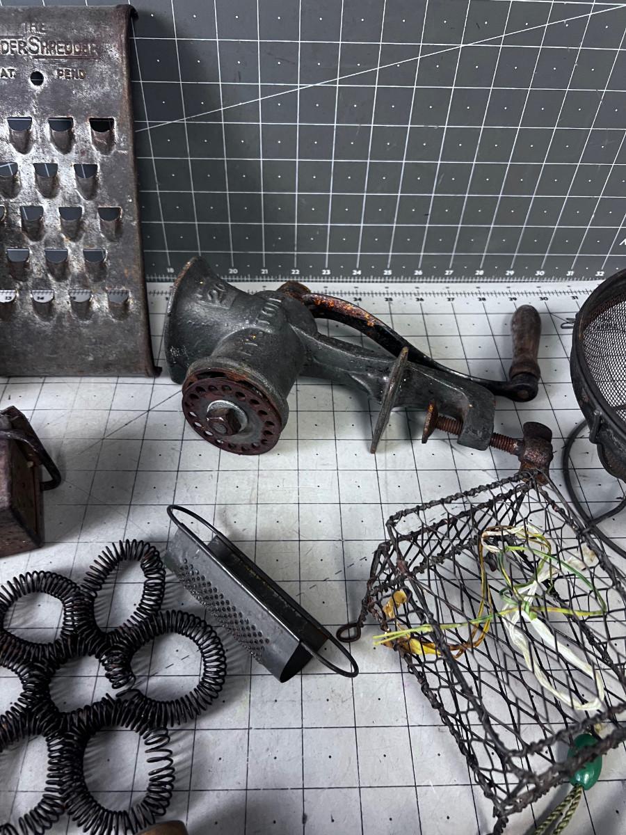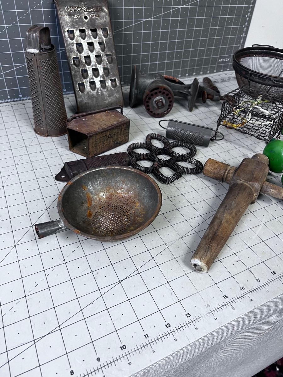 VINTAGE KITCHEN Items: Utensils, Grater, Grinder and GREEN Mystery Items