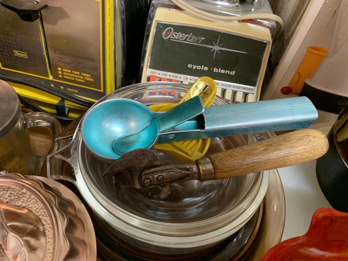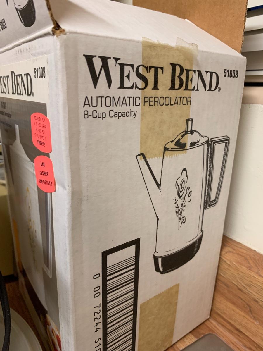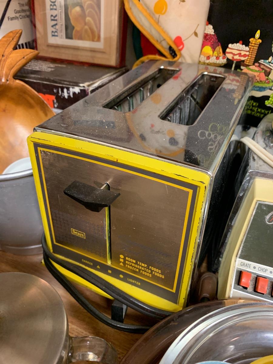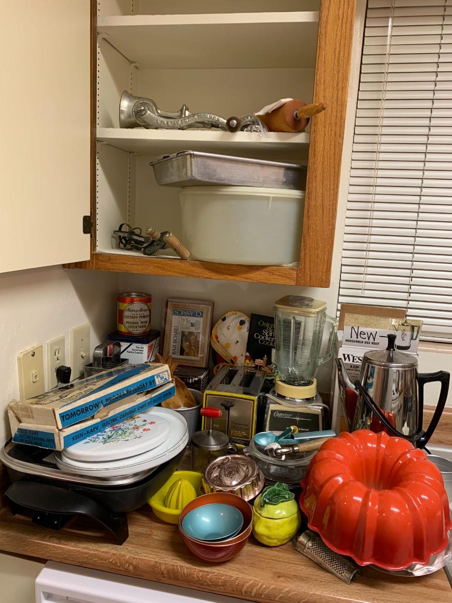A ton of vintage kitchen items including West Bend and Presto percolators, electric skillet, bundt pans, Sears toaster, Tupperware, burner covers, lemon dish, vintage tins, meat grinder, electric knife and more
