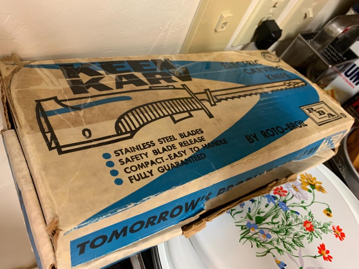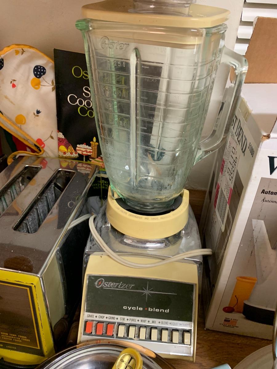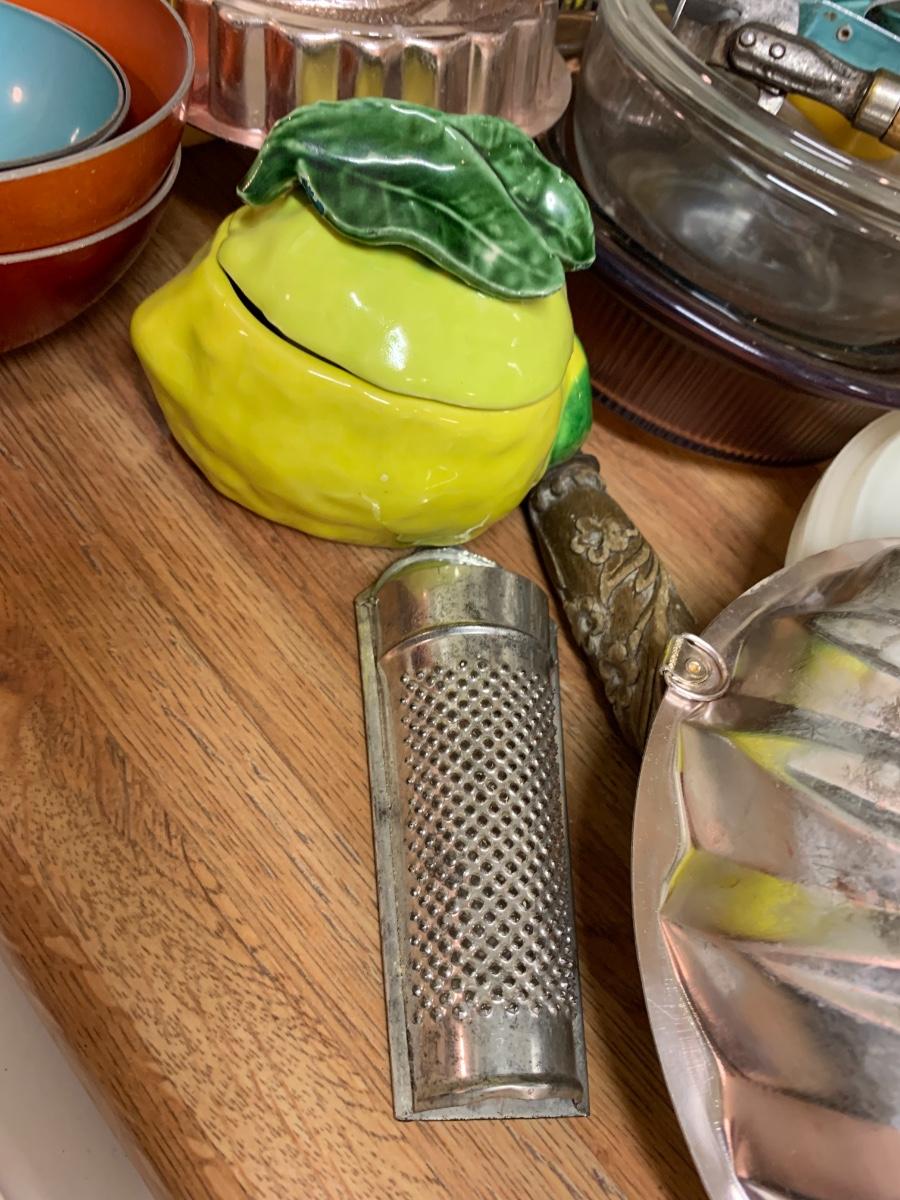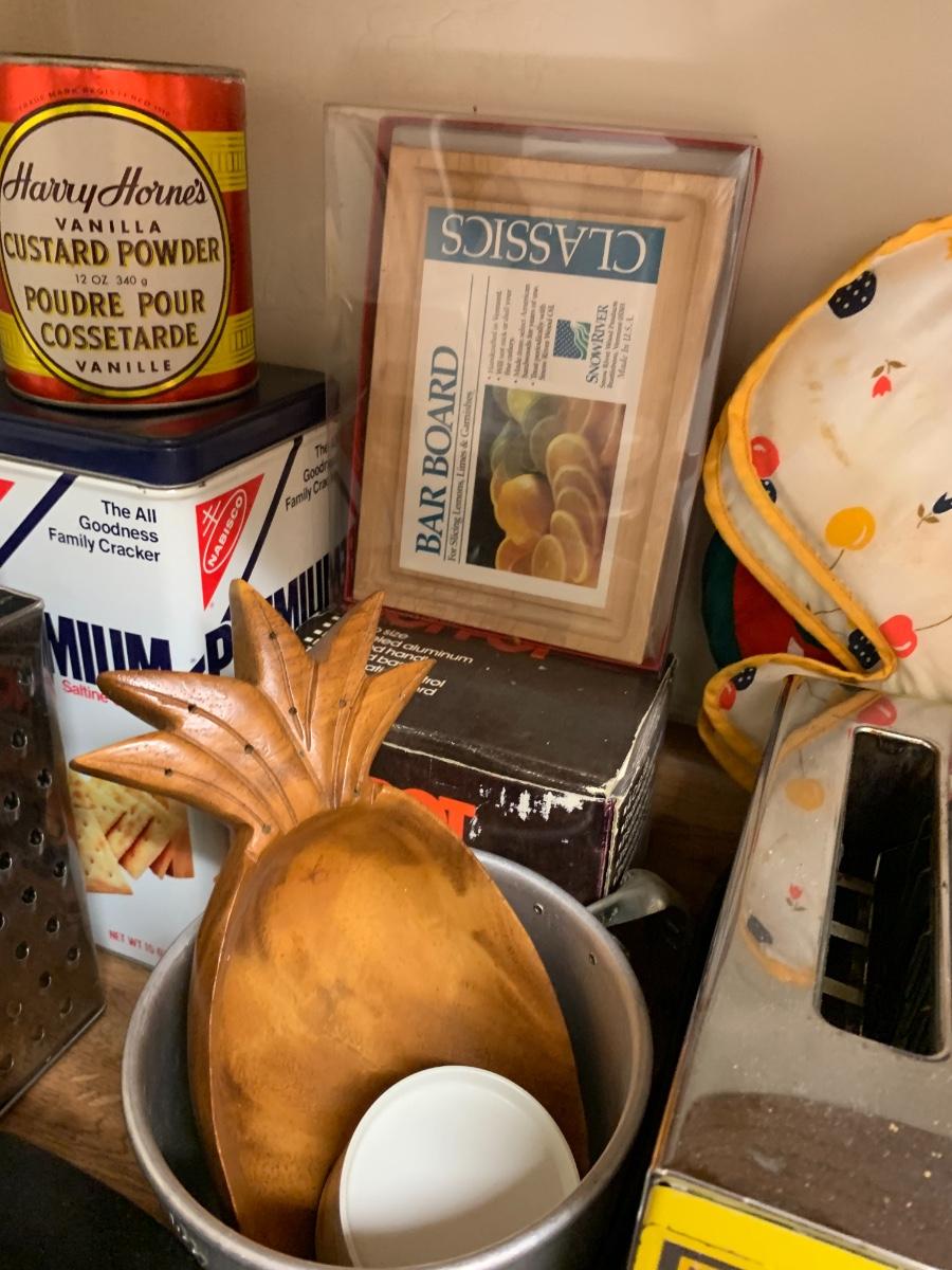 A ton of vintage kitchen items including West Bend and Presto percolators, electric skillet, bundt pans, Sears toaster, Tupperware, burner covers, lemon dish, vintage tins, meat grinder, electric knife and more