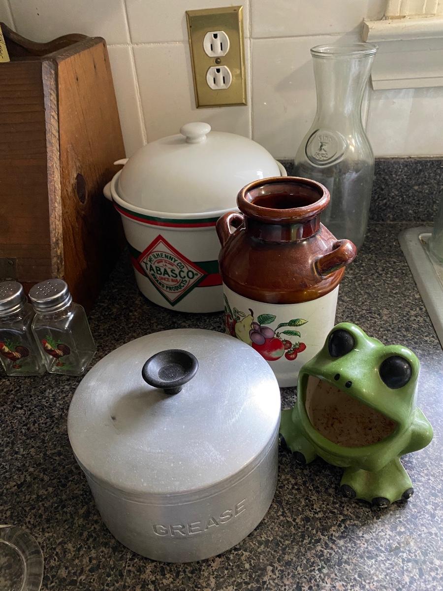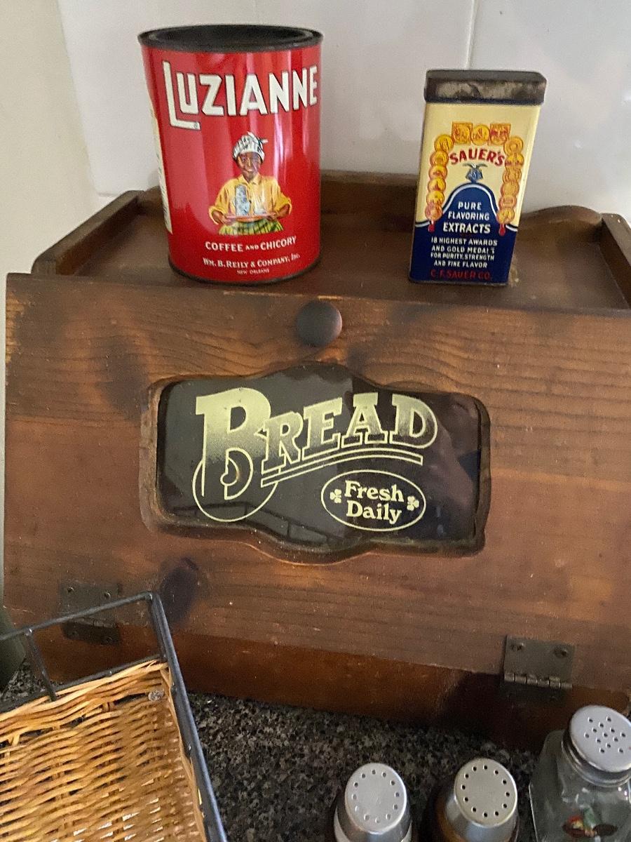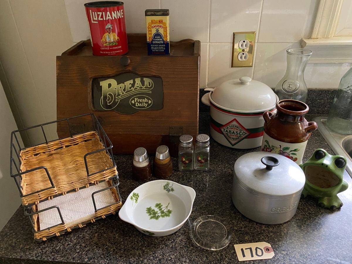 Vintage Kitchen Lot Luizanne Coffe Tin, Sauers Tin, Grease Tin And More As Pictured