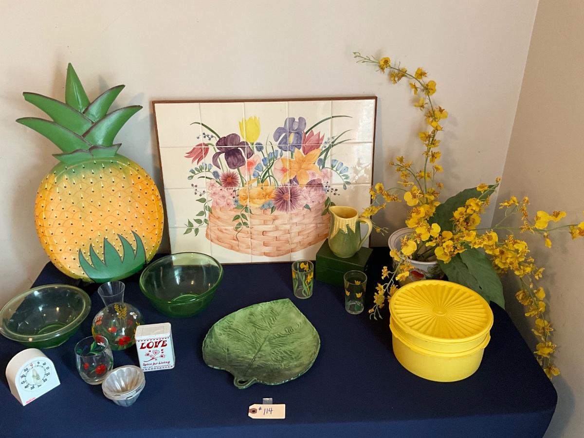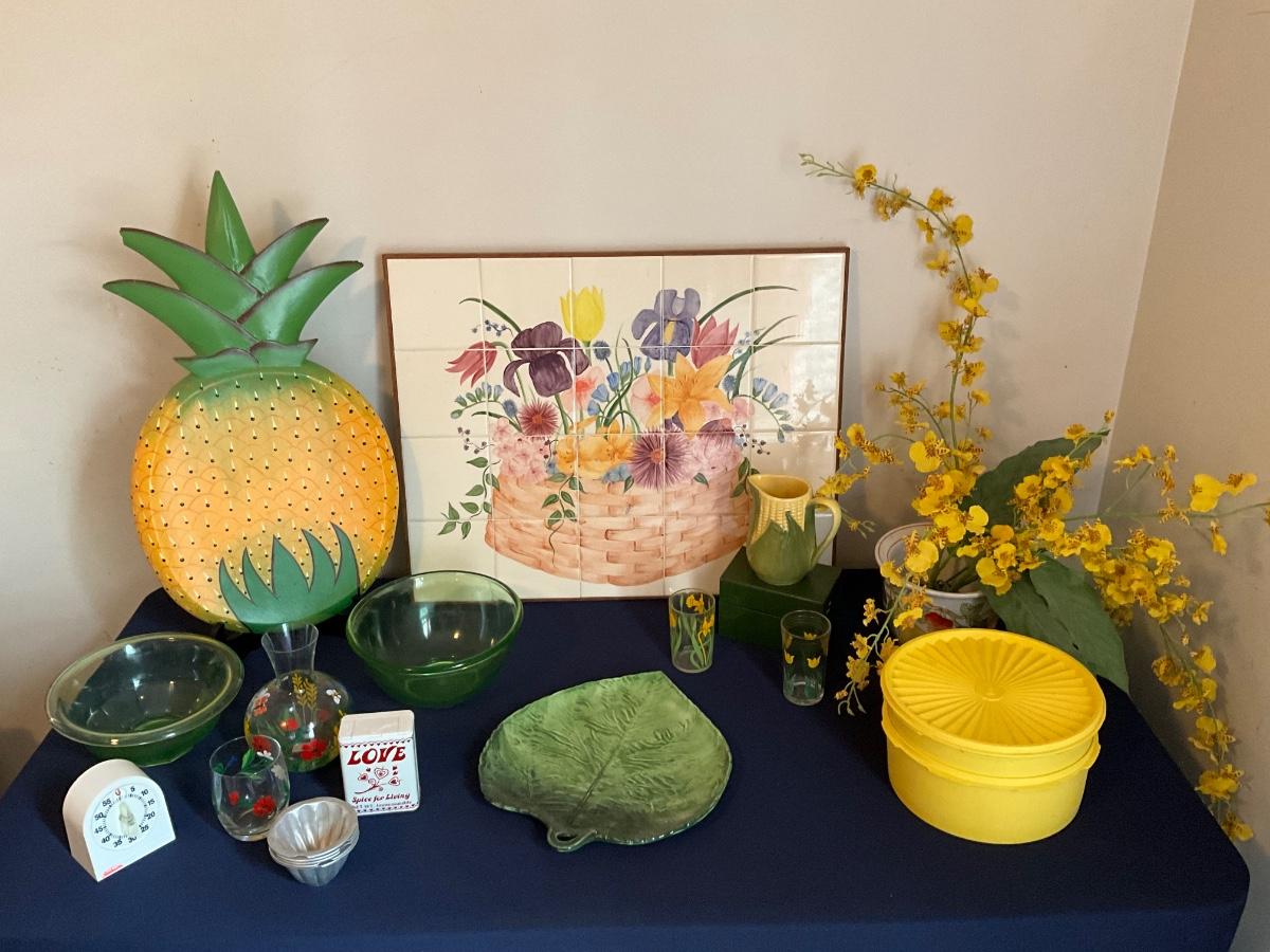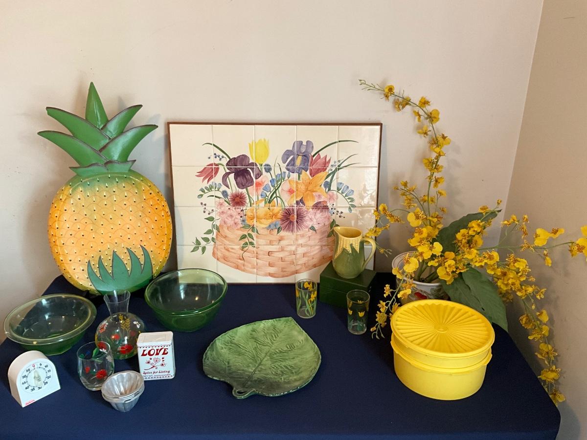 Misc. Vintage Kitchen Items Including Tupperware, Green Depression Glass, and More As Pictured