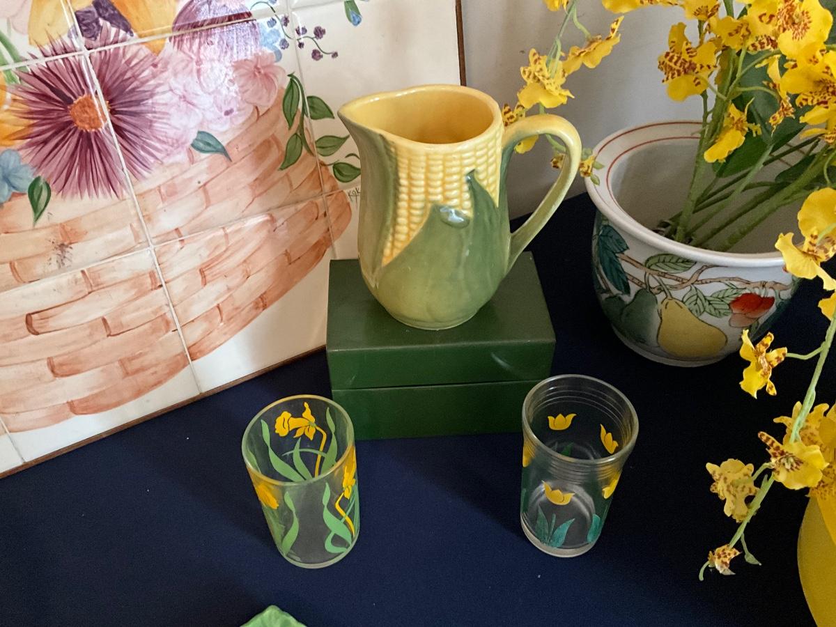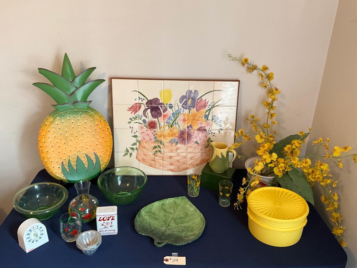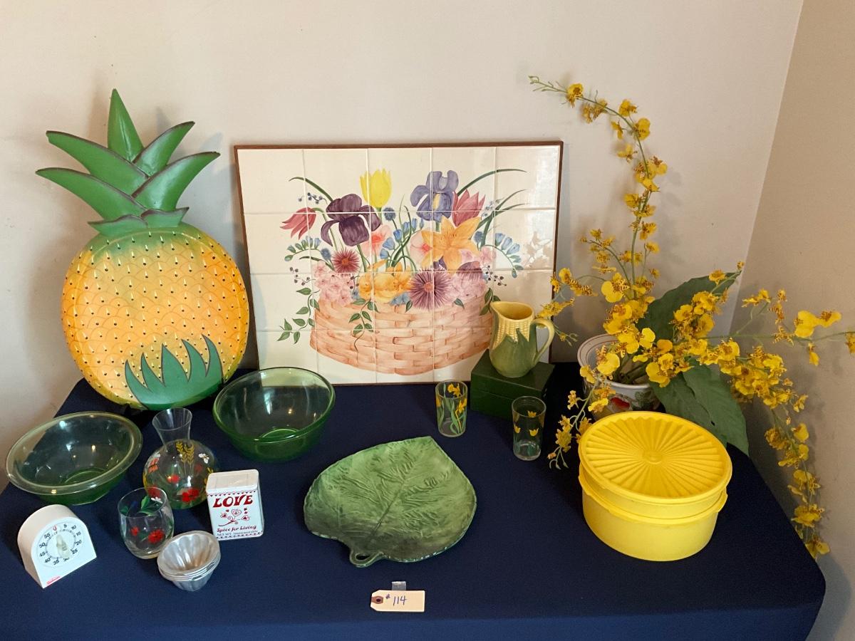 Misc. Vintage Kitchen Items Including Tupperware, Green Depression Glass, and More As Pictured