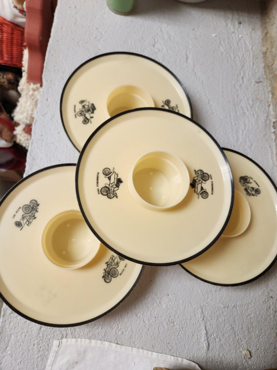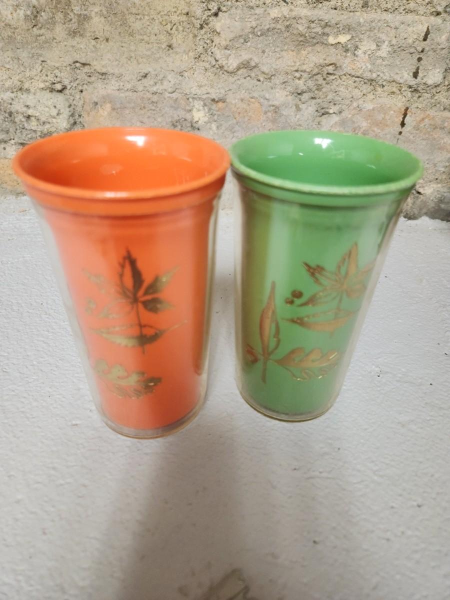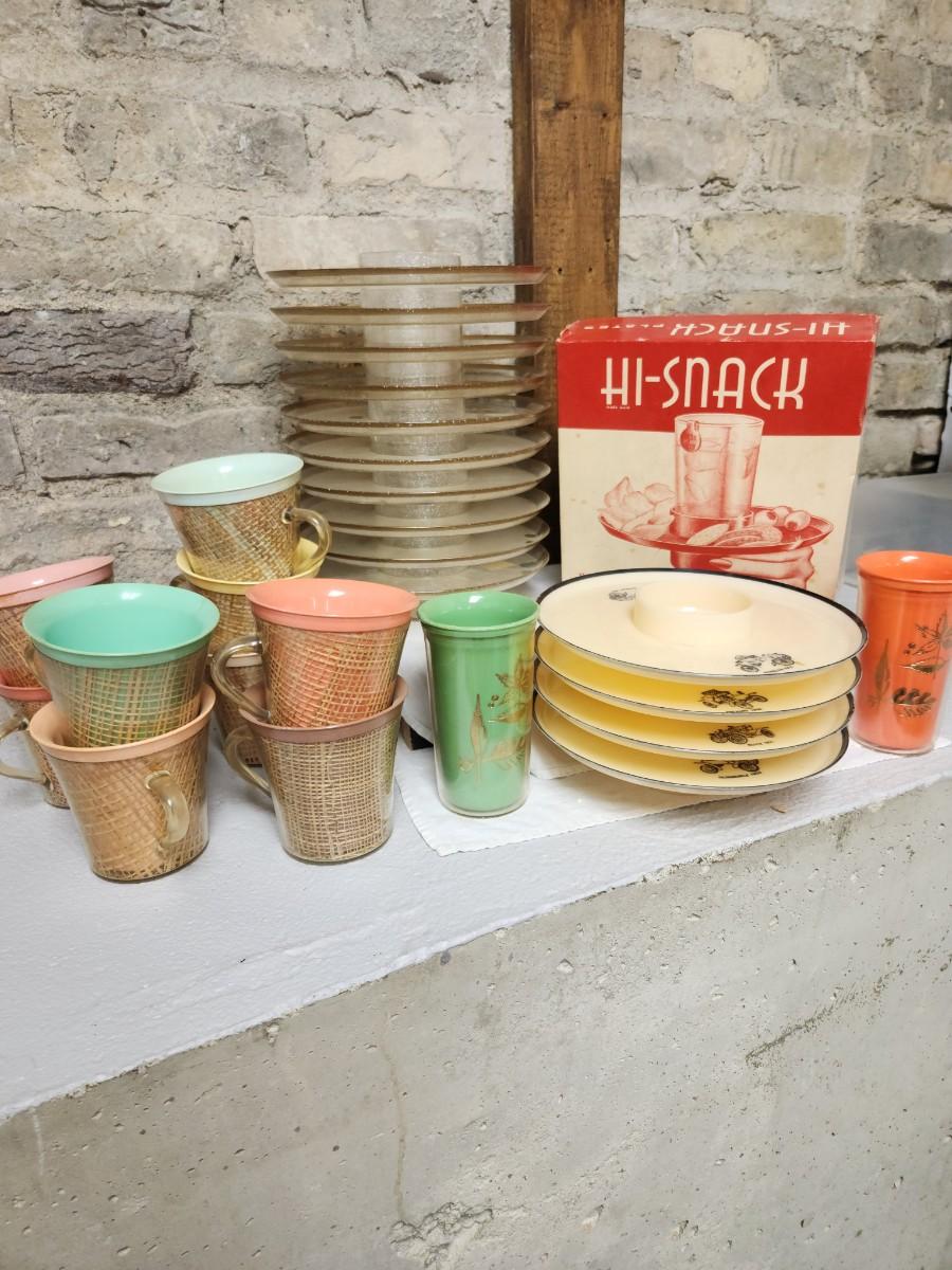 This lot has 9 mixed color rattanware mugs, 2 thermal tumblers, 4 vintage car hi-snack trays, 10 gold flecked hi-snack trays and a hi-snack trays box.