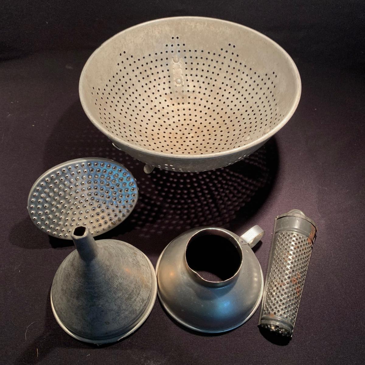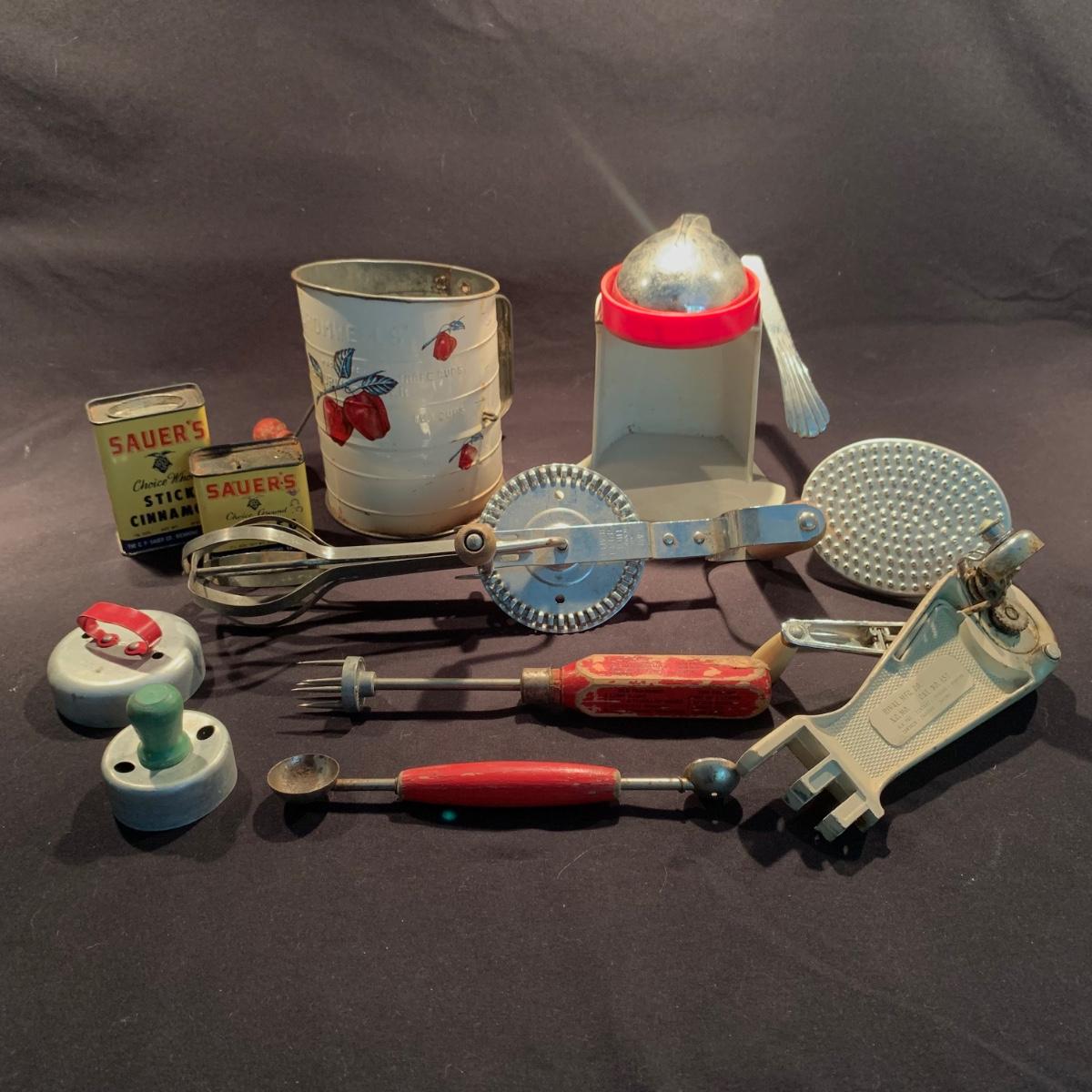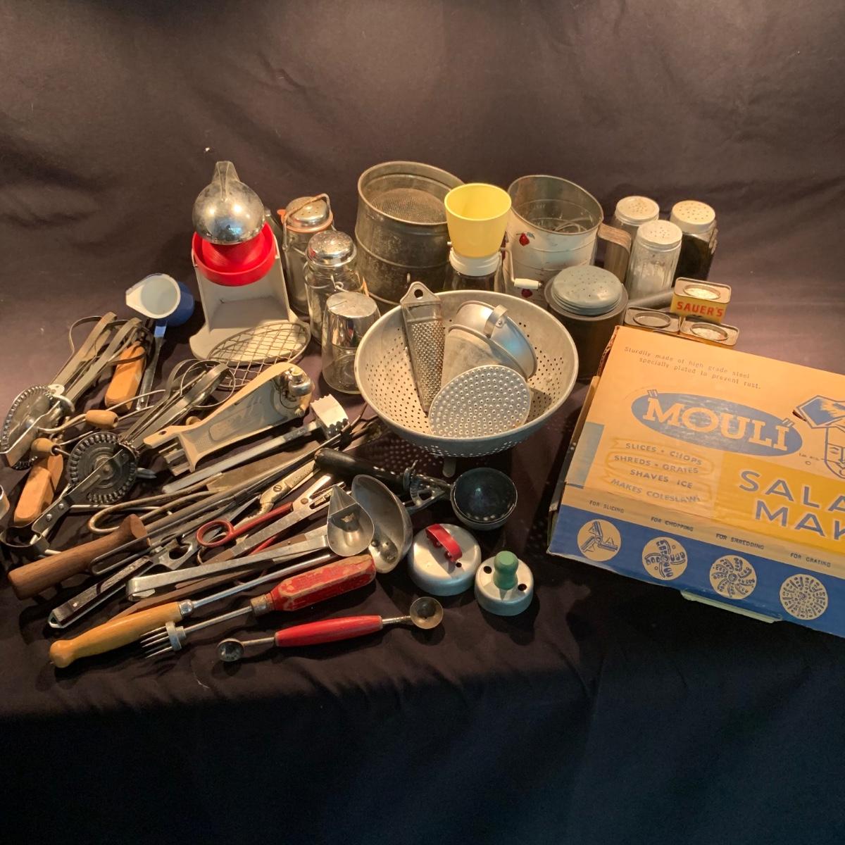 This lot includes a large variety of vintage kitchen tools, utensils, and accessories. Some of the items included are: a Mouli Salad Maker, sifters, manual high speed beaters, a Juicerette citrus juicer, spice tins, a zester, a nutmeg grater, biscuit cutters, a can opener, ladles, and more! Items are in good to fair condition. Items are made mostly of metal, wood, and/or glass and most appear to be built to last. Shipping available.