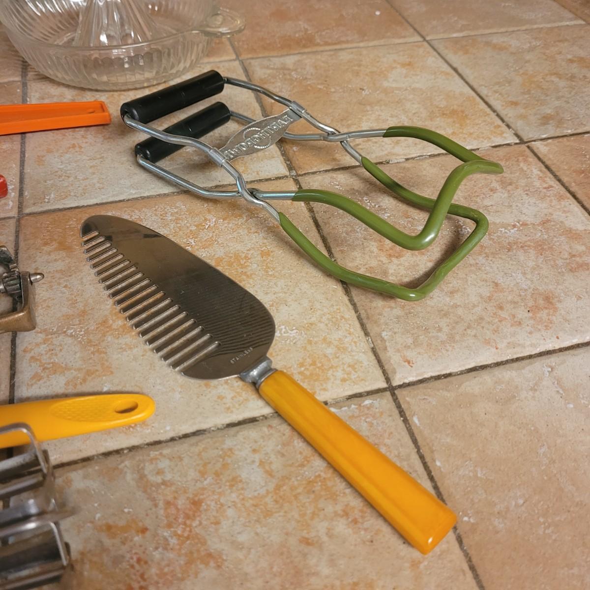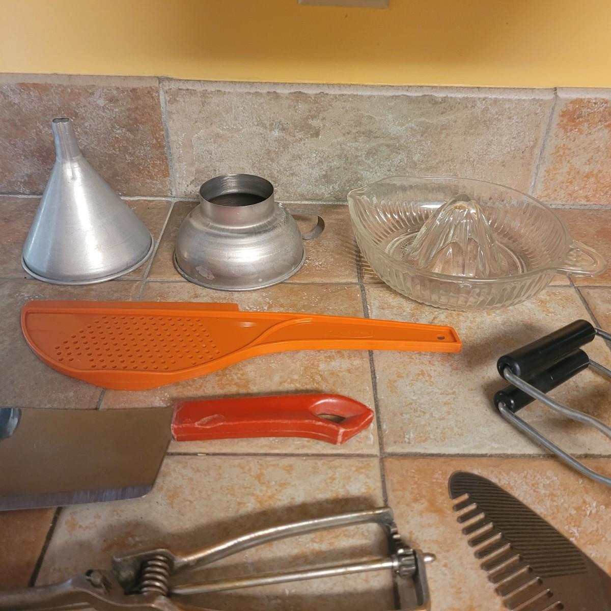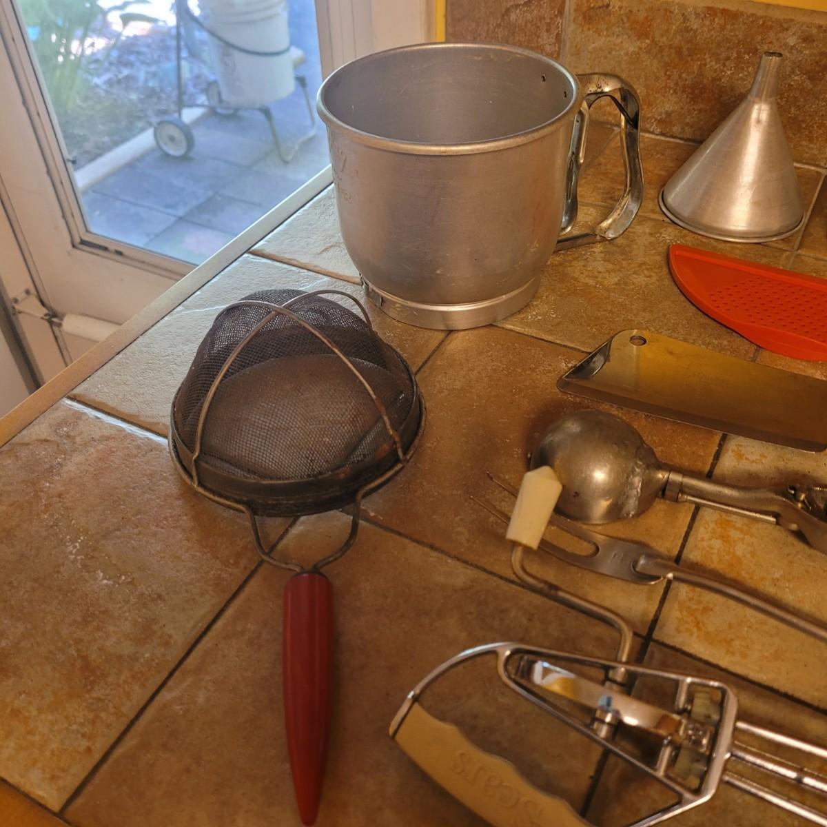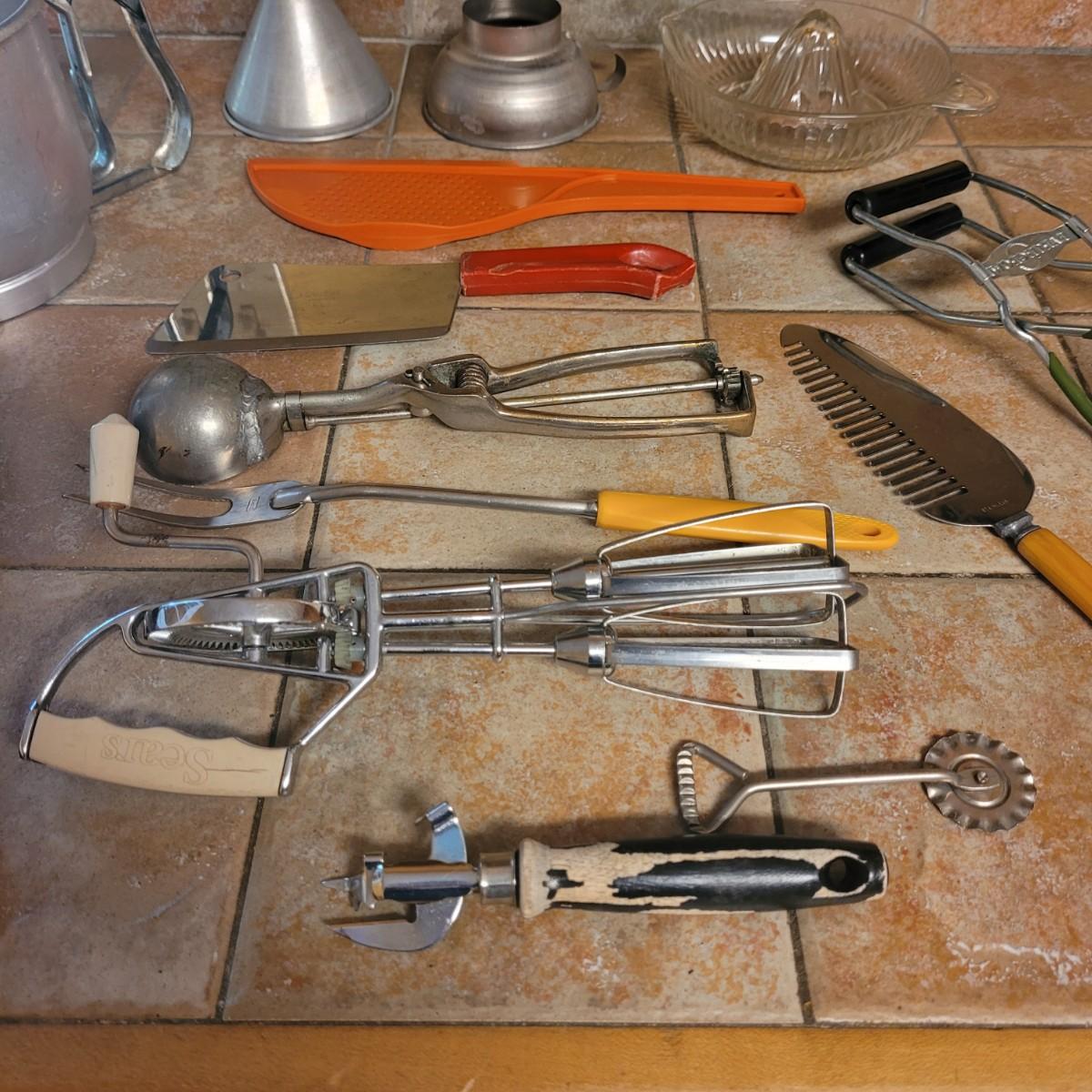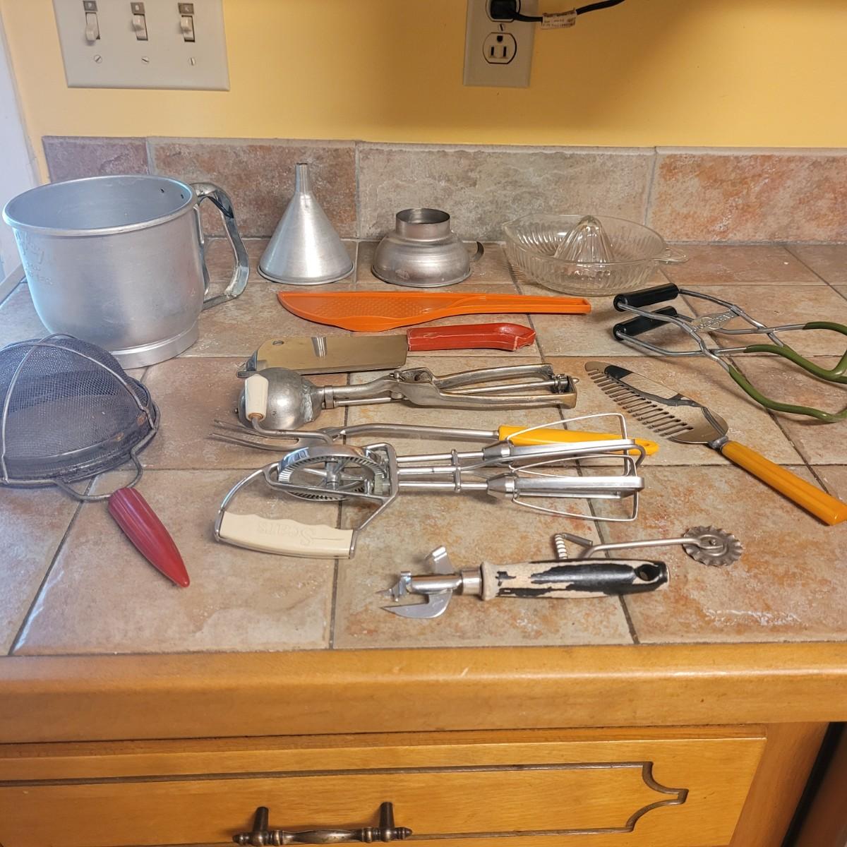 This lot includes a variety of vintage kitchen tools, including funnels, sifter, strainer, canning tongs and much more. Shipping available.