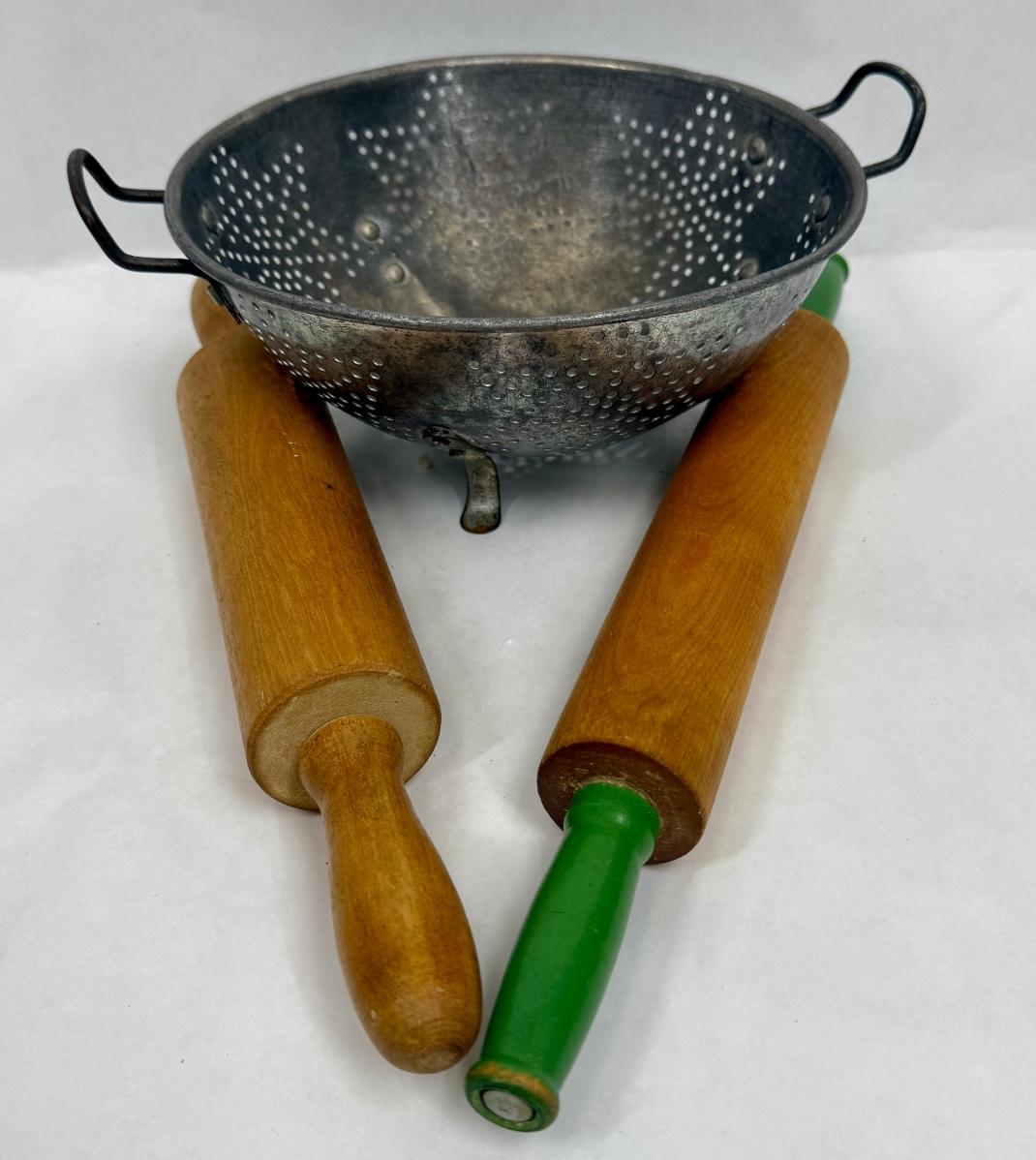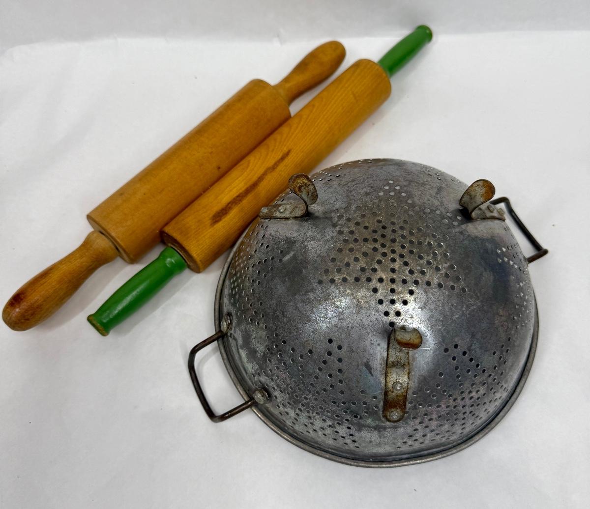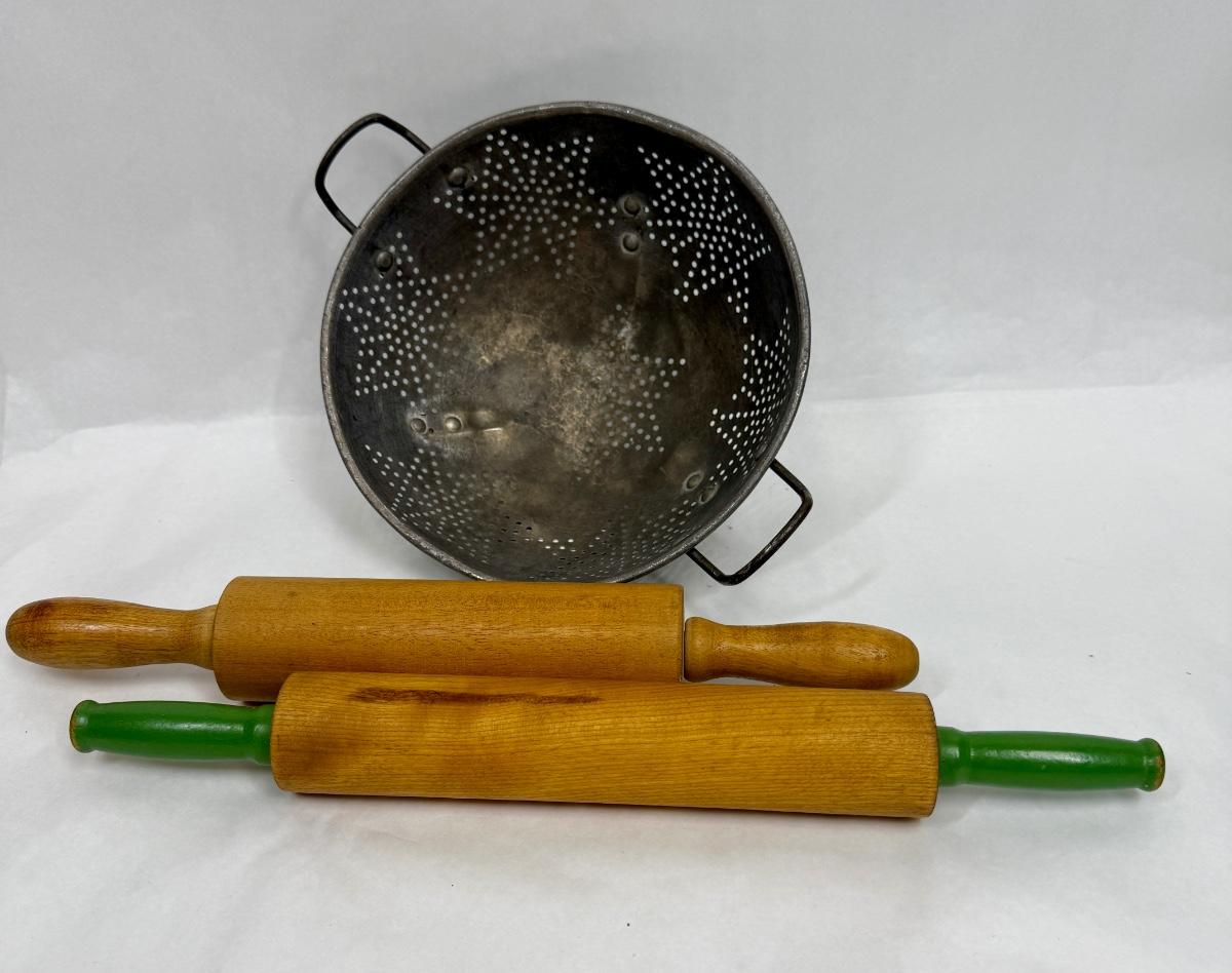 Vintage Kitchen tools Metal Strainer and 2 wooden rolling pins