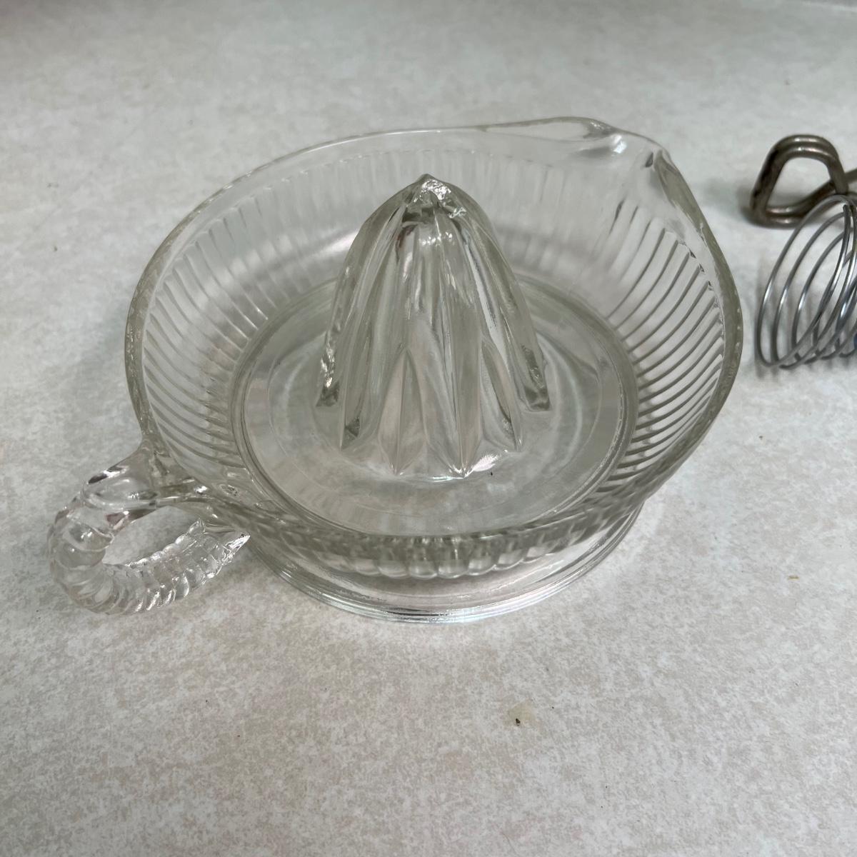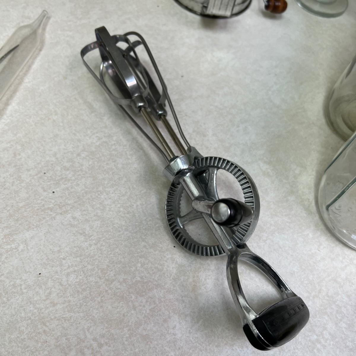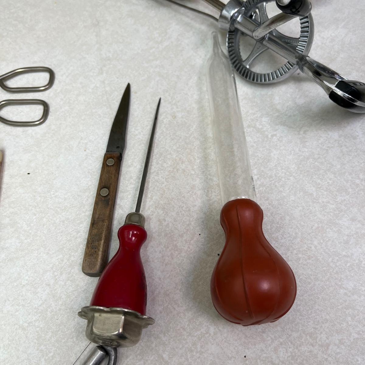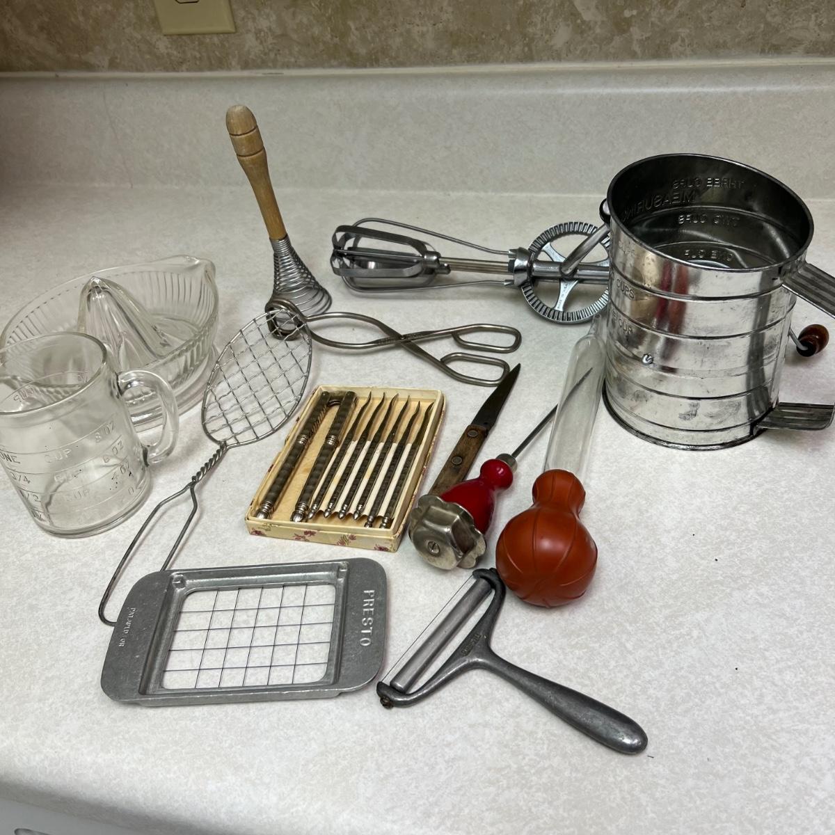 A nice assortment of vintage utensils that includes an ice pick, glass Anchor Hocking measuring cup and more.