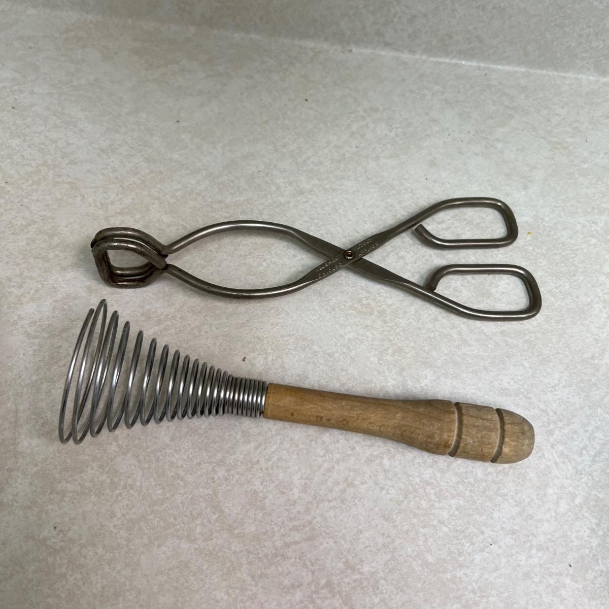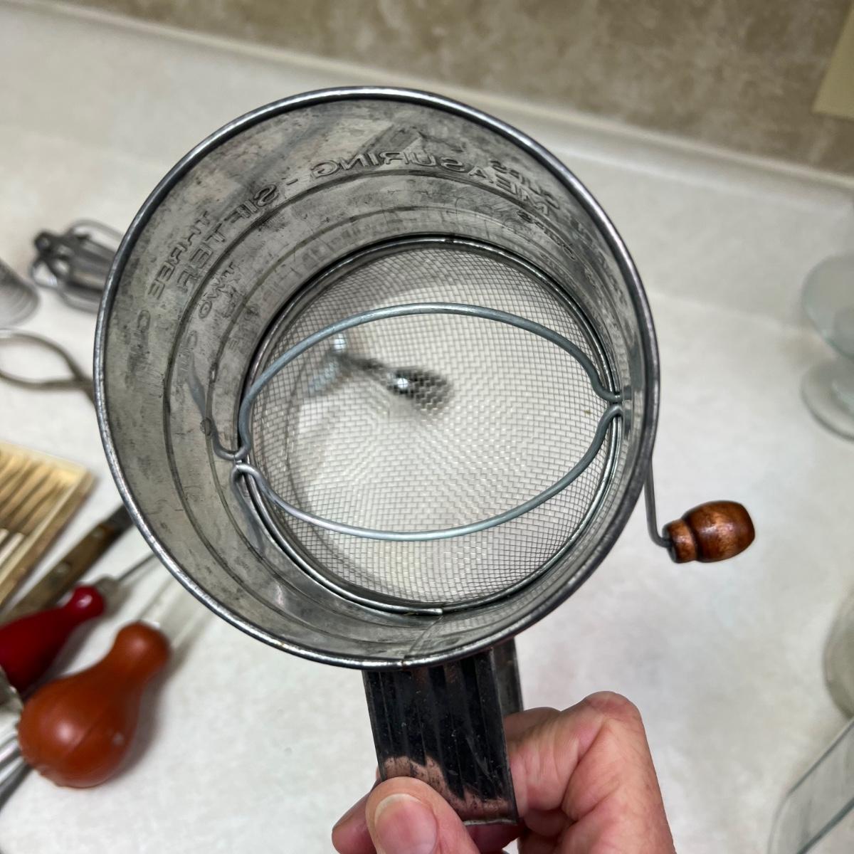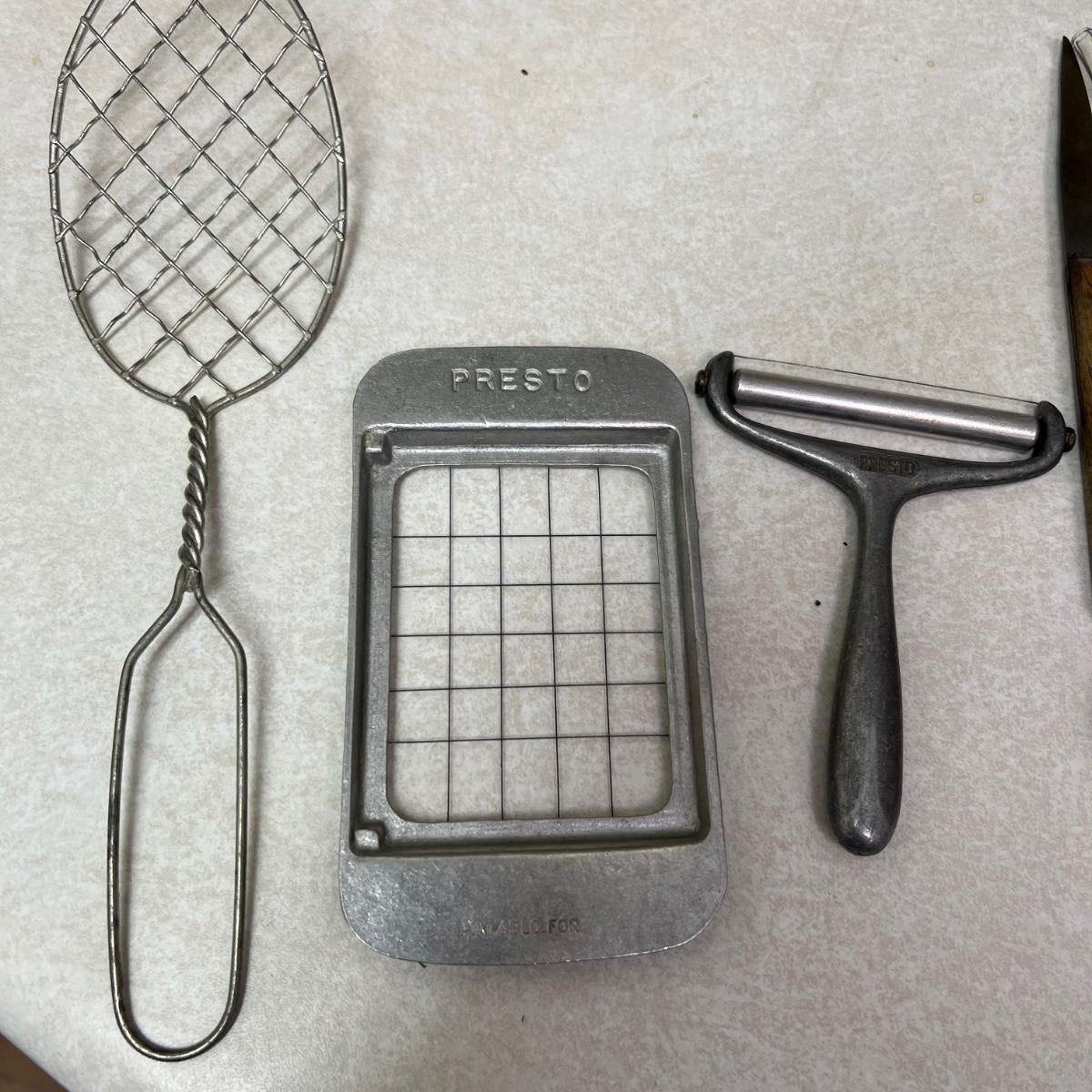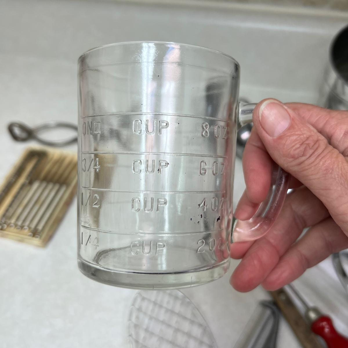 A nice assortment of vintage utensils that includes an ice pick, glass Anchor Hocking measuring cup and more.