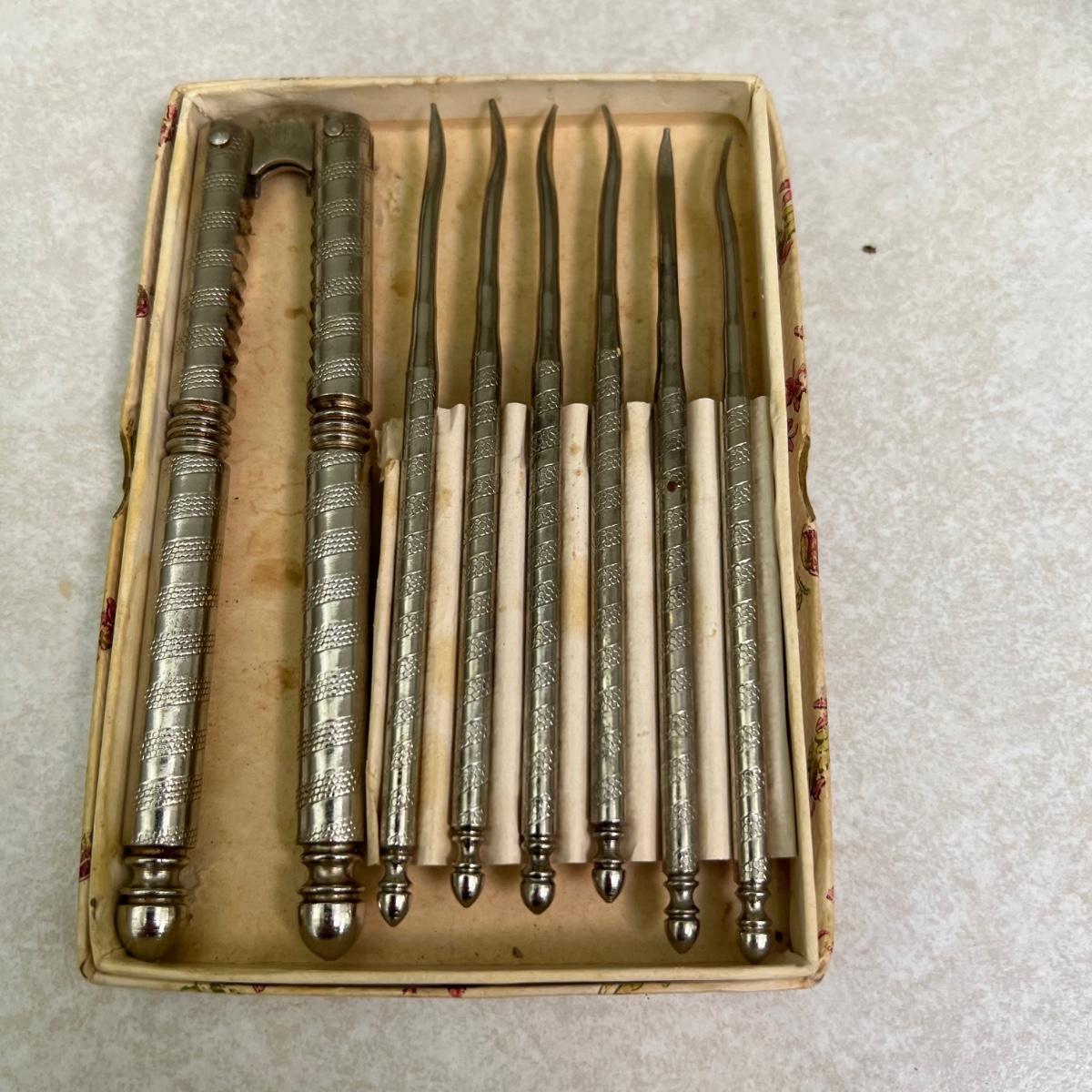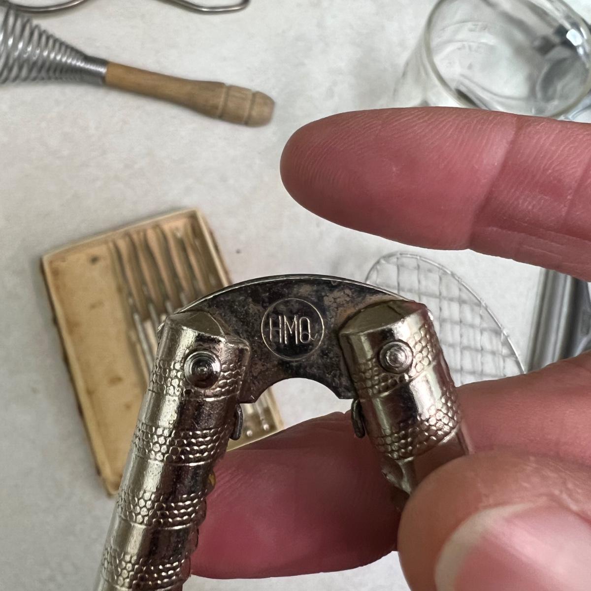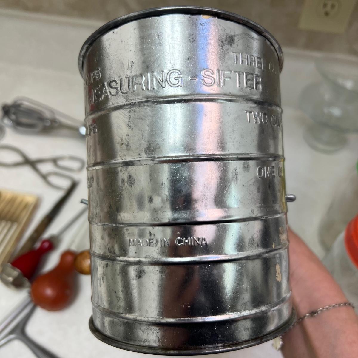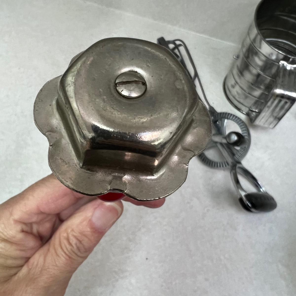 A nice assortment of vintage utensils that includes an ice pick, glass Anchor Hocking measuring cup and more.