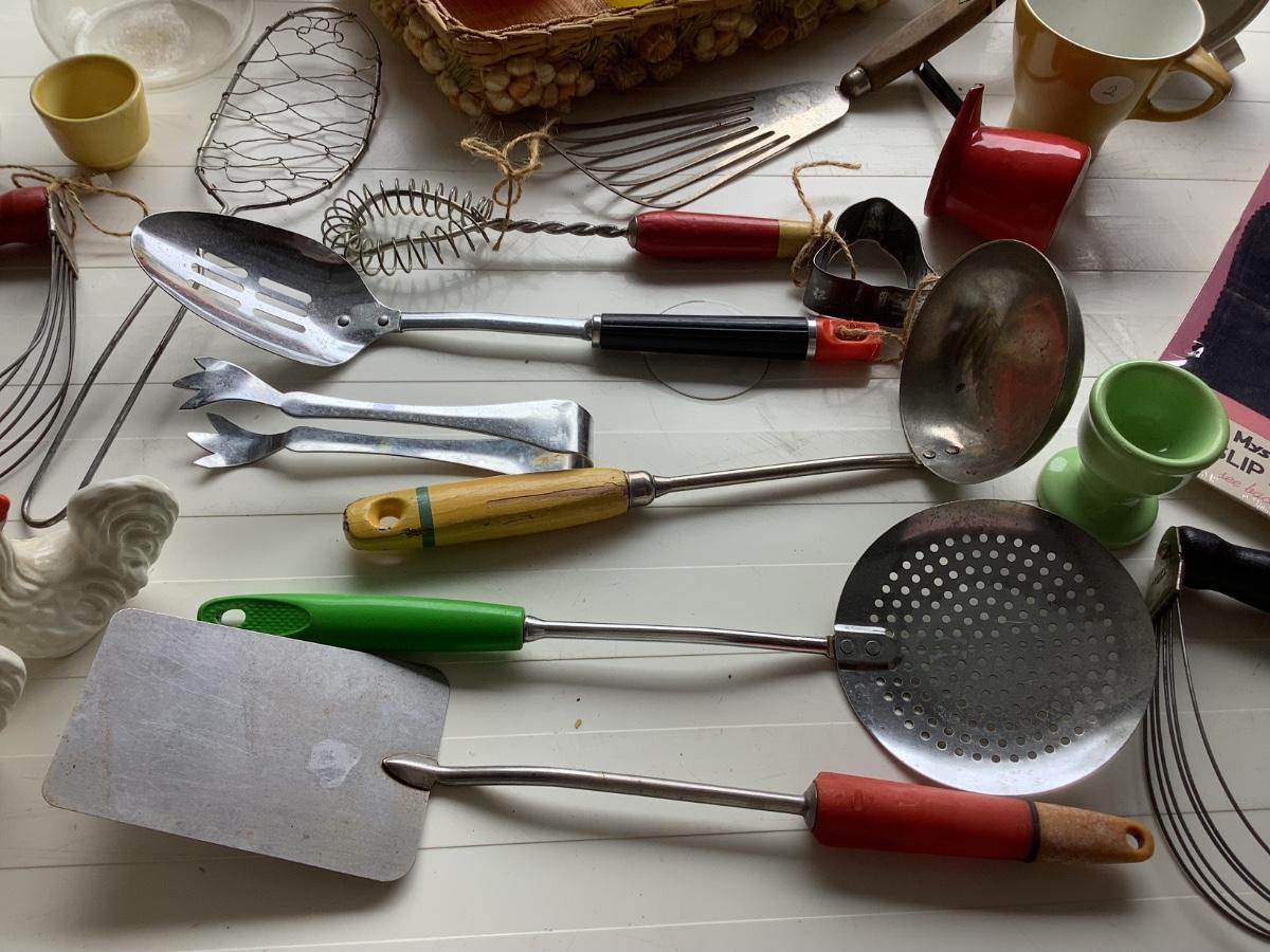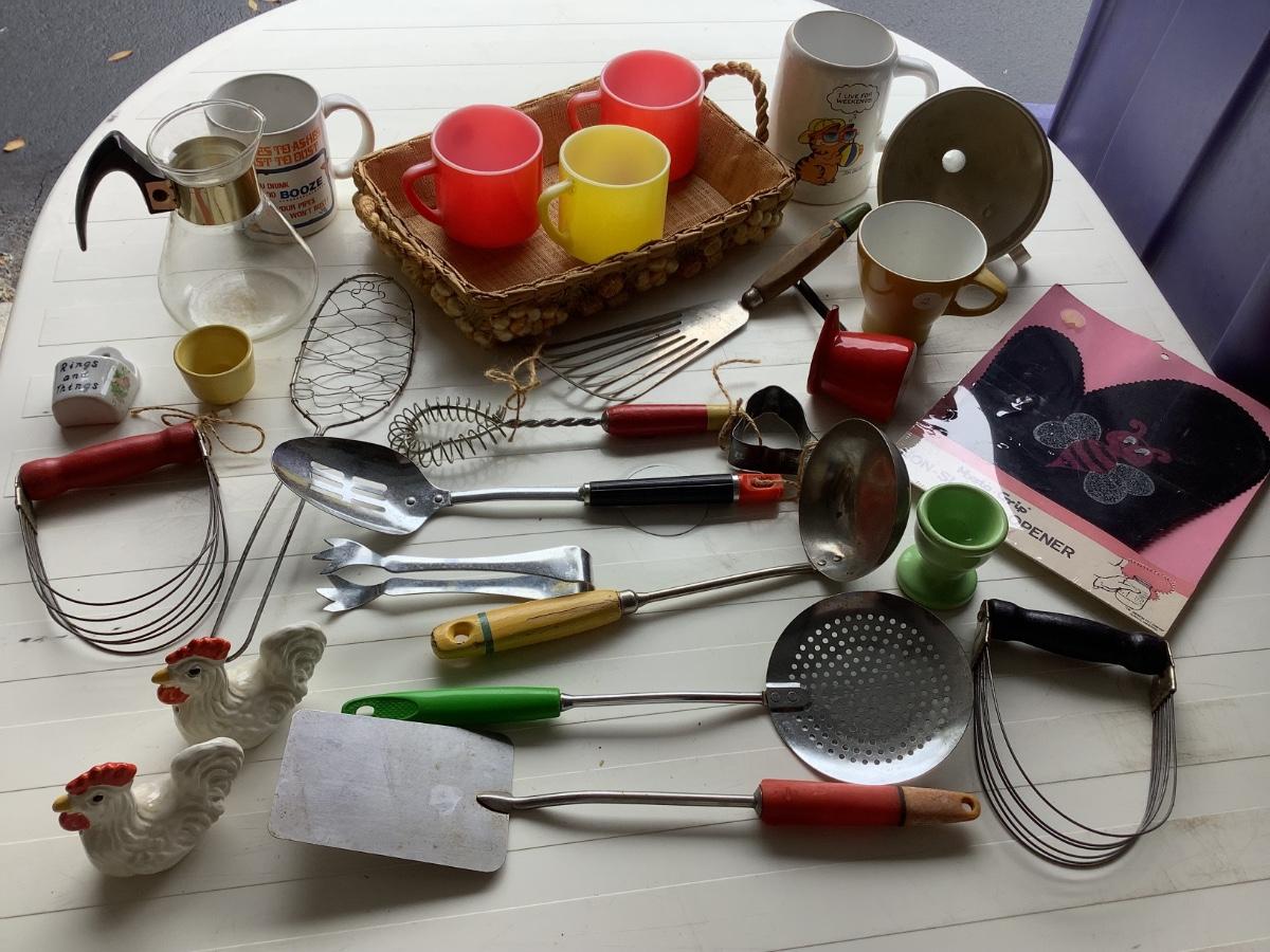 Vintage kitchen utensils, NIB Mysto-Grip, Rooster salt & pepper, Garfield-27 pieces