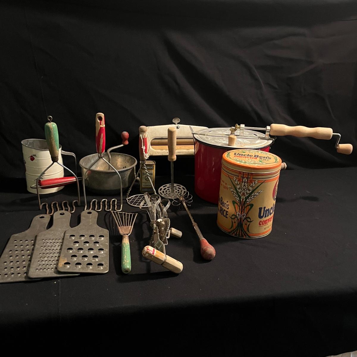 Vintage Kitchen Utensils, Popcorn Popper & More (P-MG)