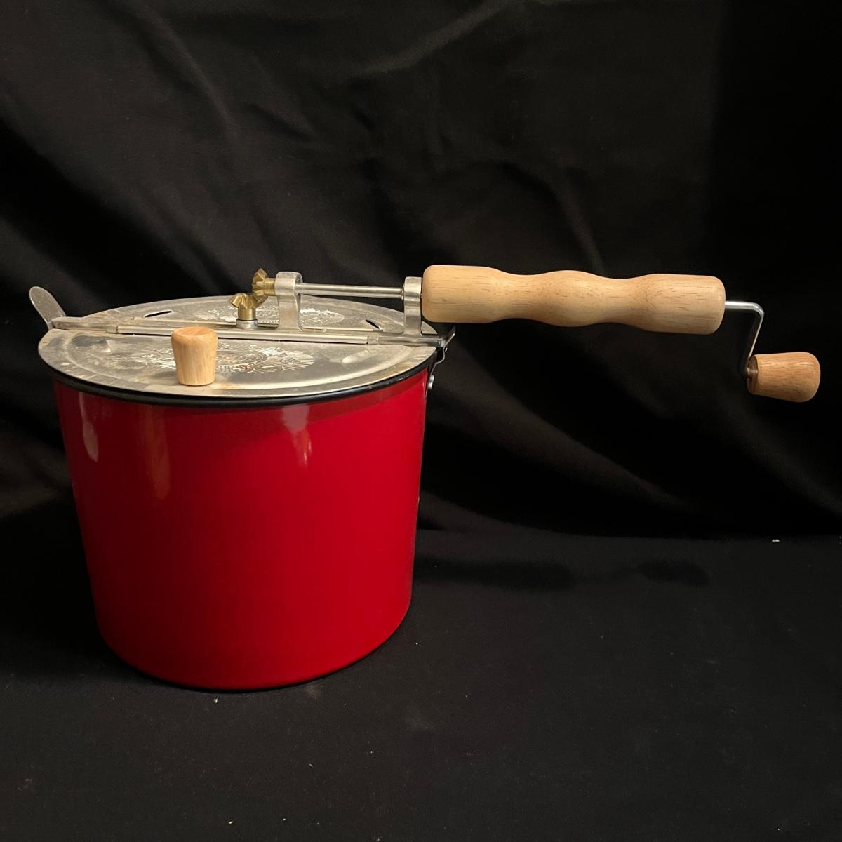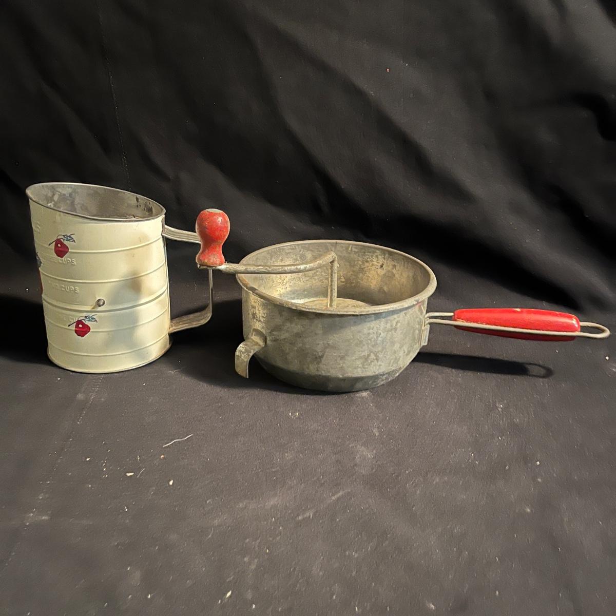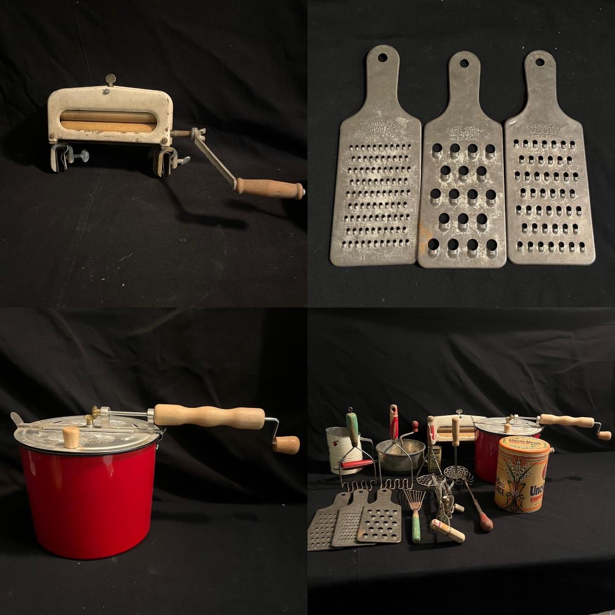 Lot includes stovetop Pro Popper, mashers, graters, whisks, hand crank beater, sifter, food mill, two old containers and clothing wringer. Popcorn popper measures 18.5” x 9” x 9”H.