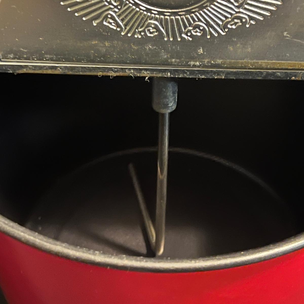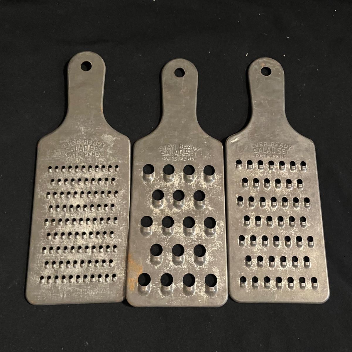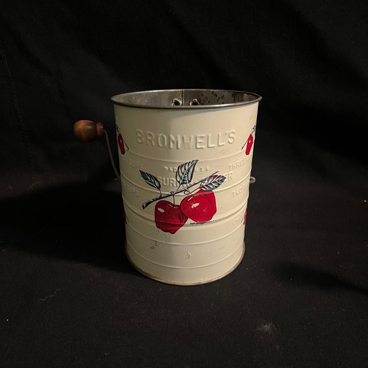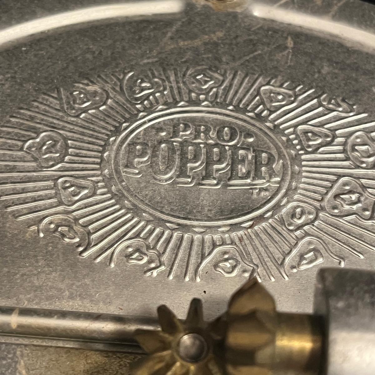 Lot includes stovetop Pro Popper, mashers, graters, whisks, hand crank beater, sifter, food mill, two old containers and clothing wringer. Popcorn popper measures 18.5” x 9” x 9”H.